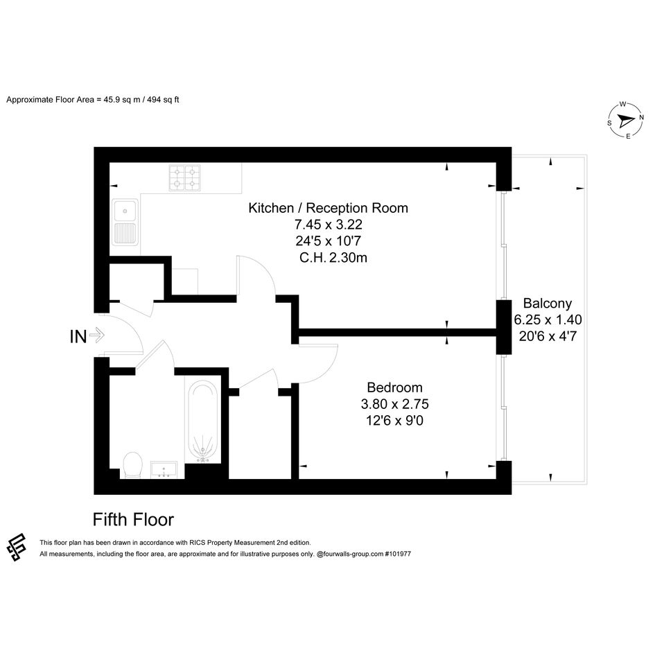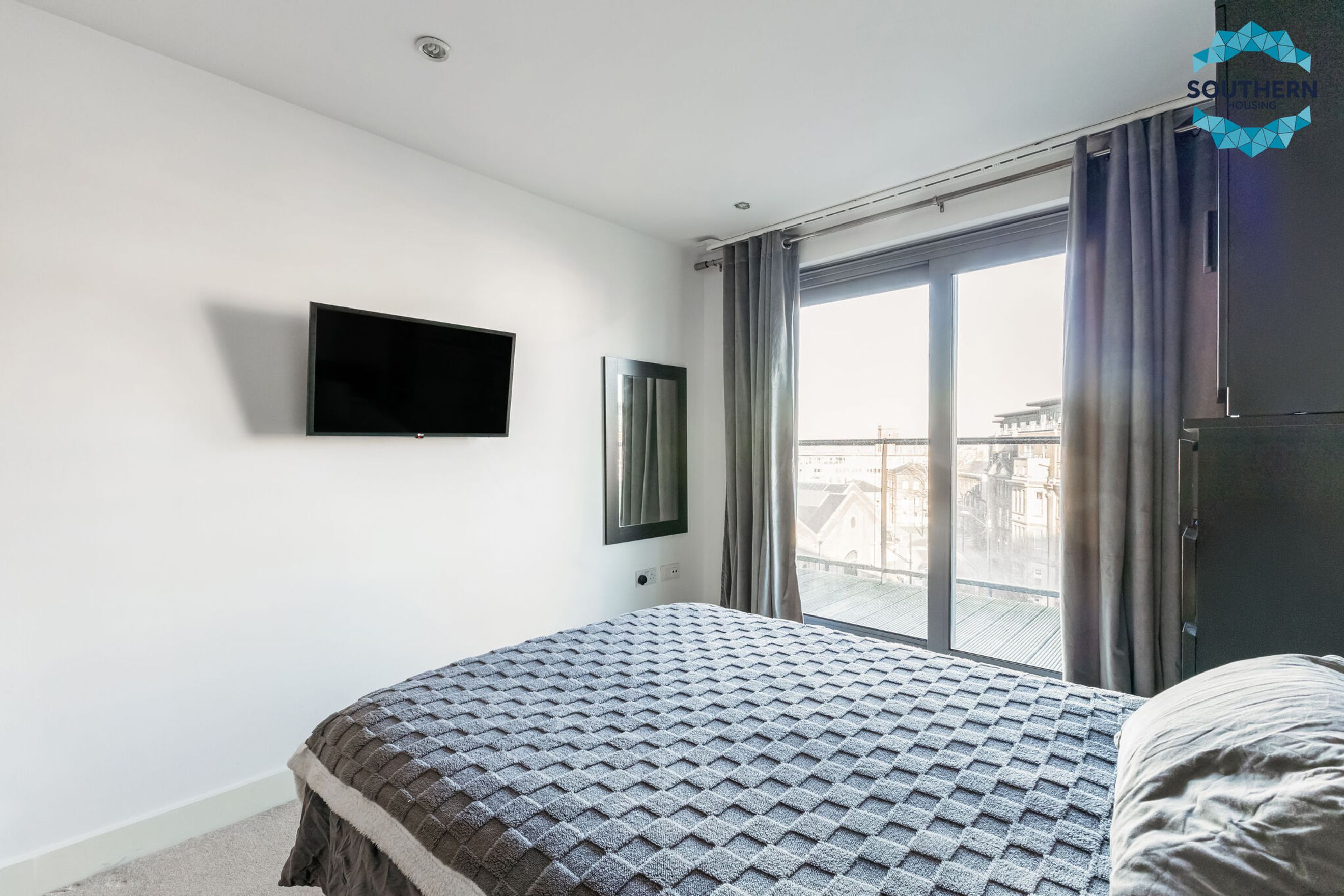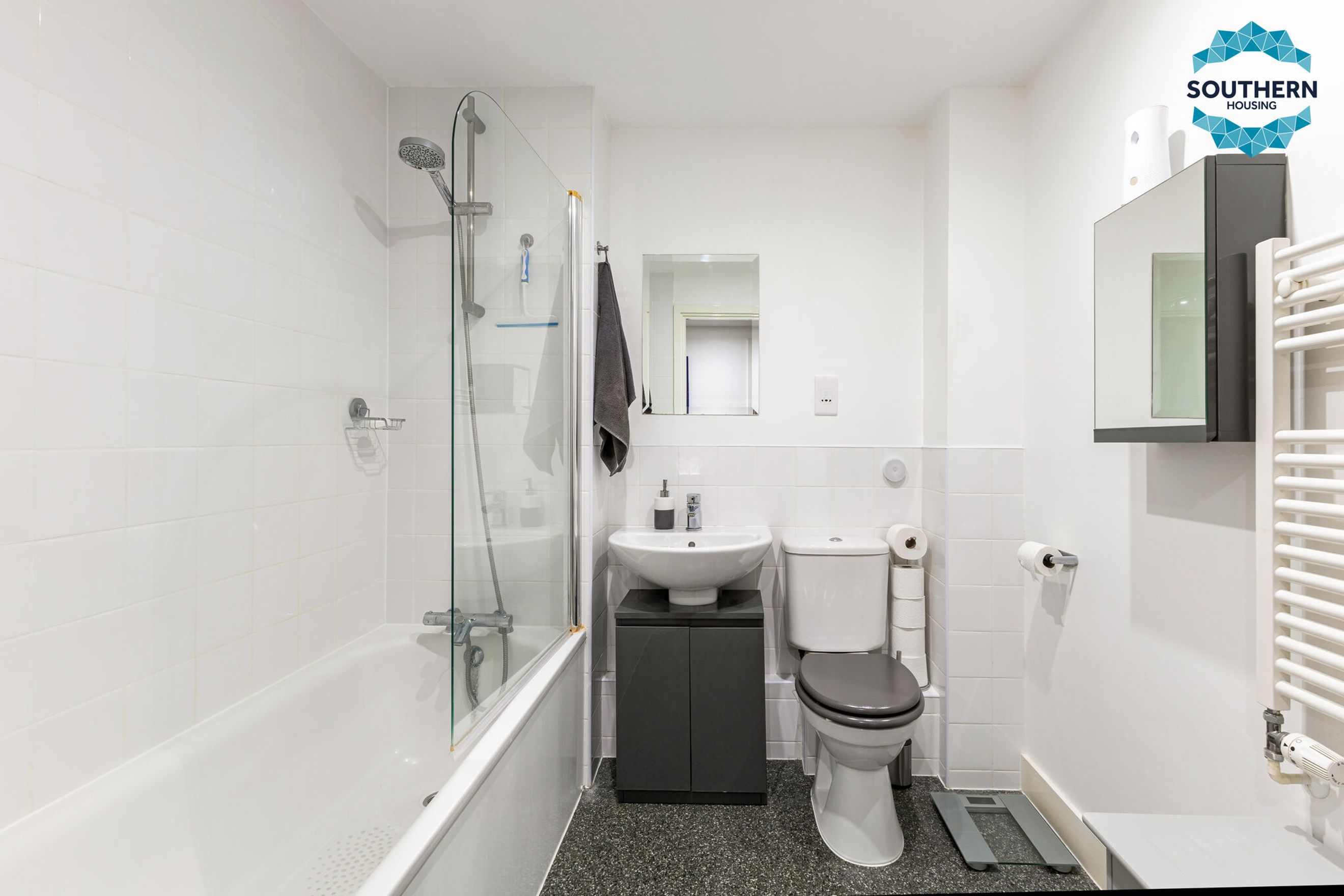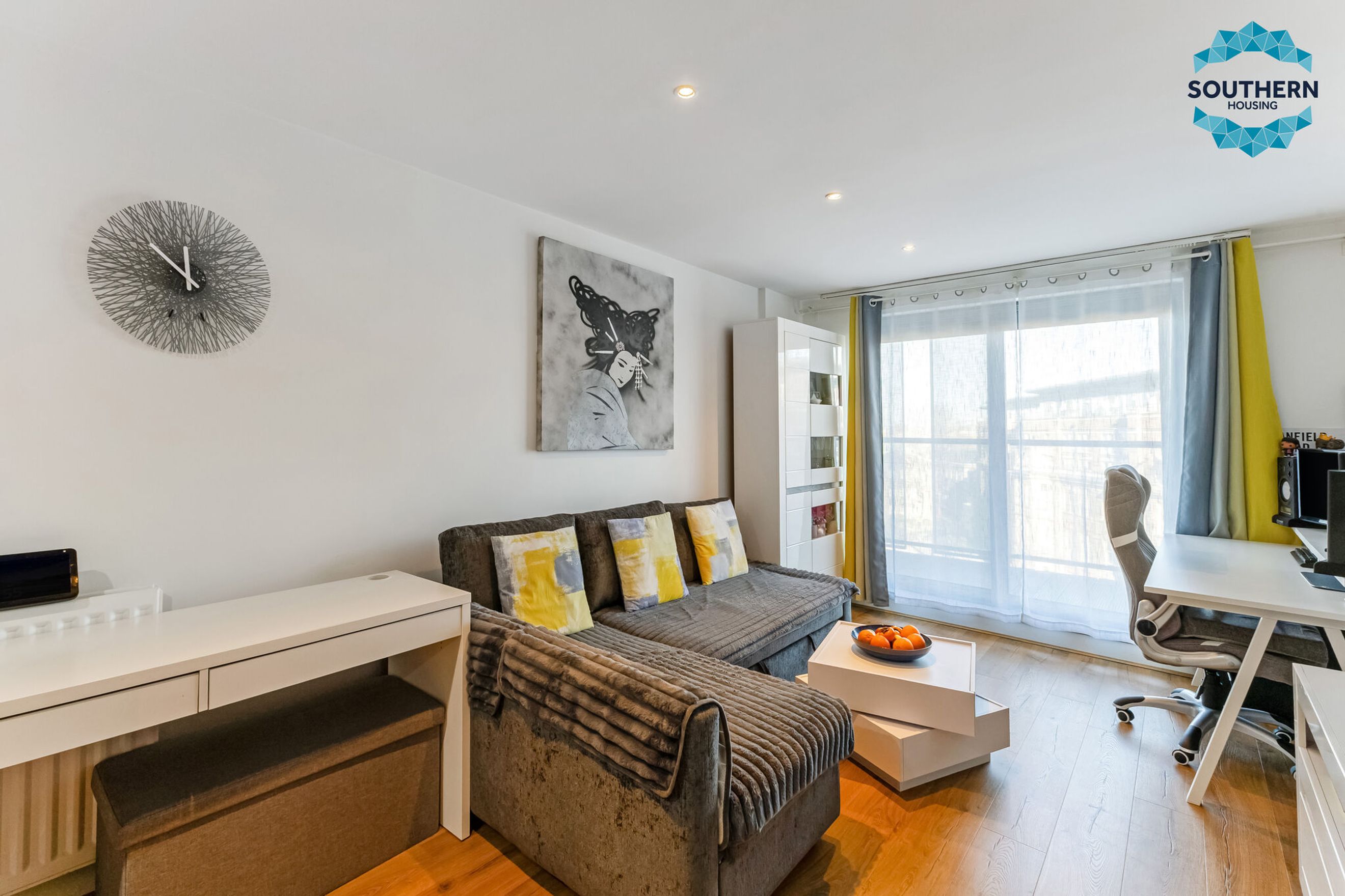 The principal bedroom is a large double, flooded with natural light and benefiting from a second access point to the balcony. There’s ample space for a king-size bed and additional furnishings. Completing the property is a stylish bathroom with a shower-over-bath combination.