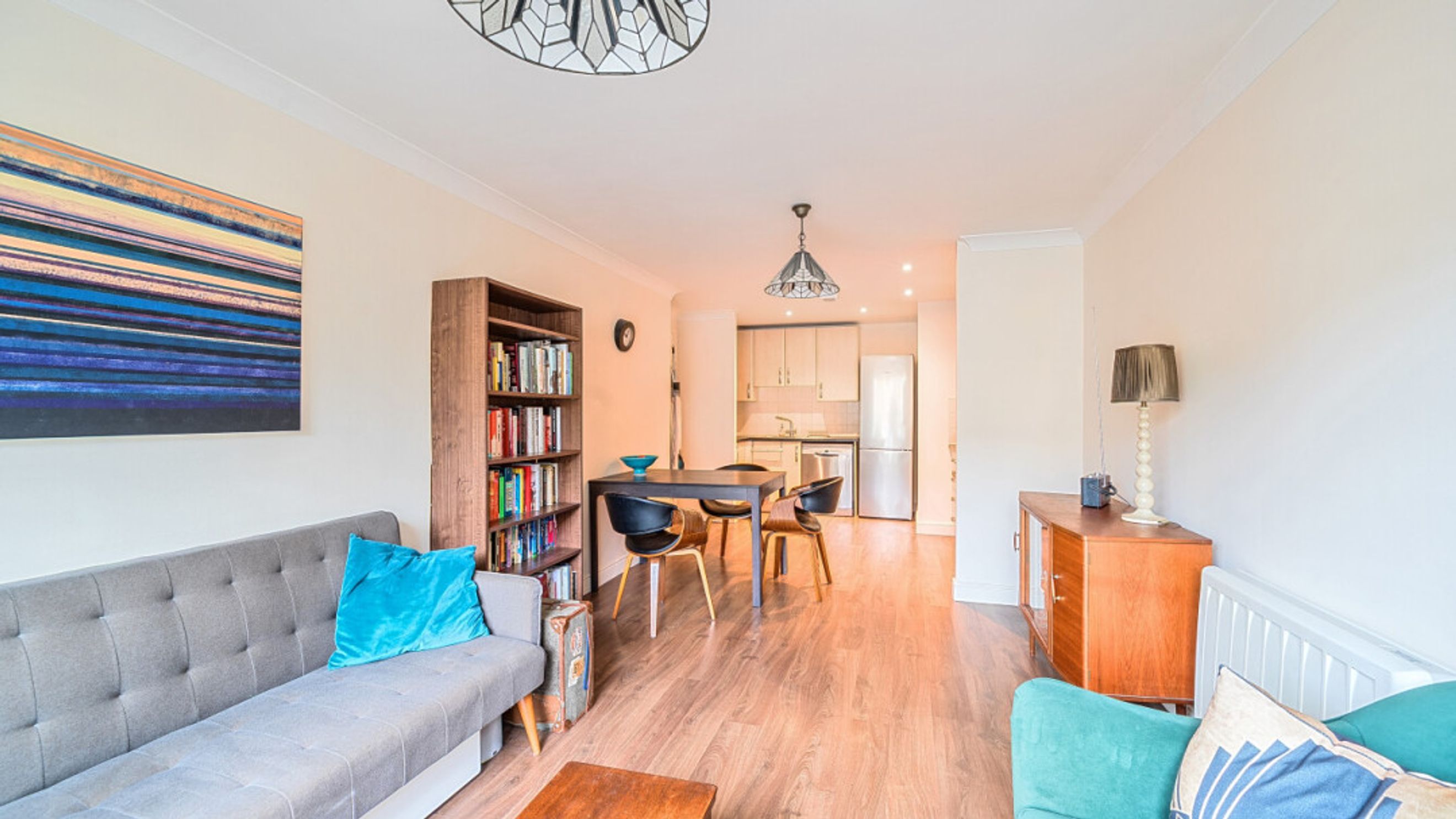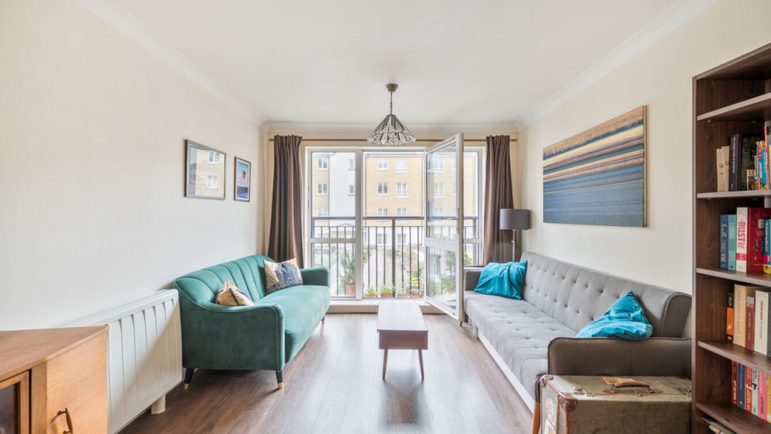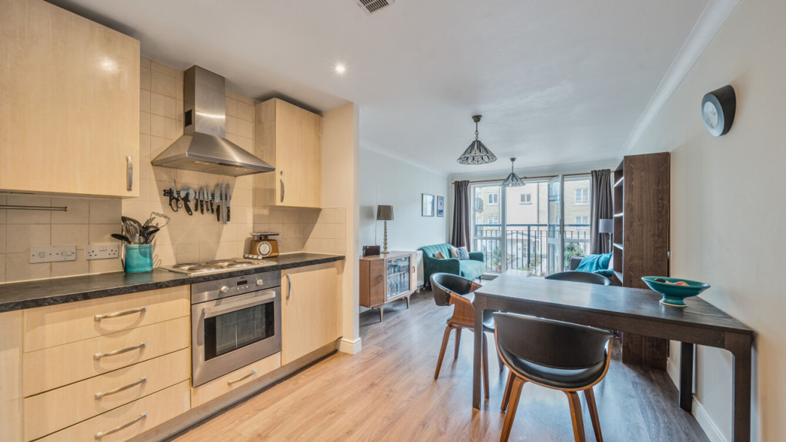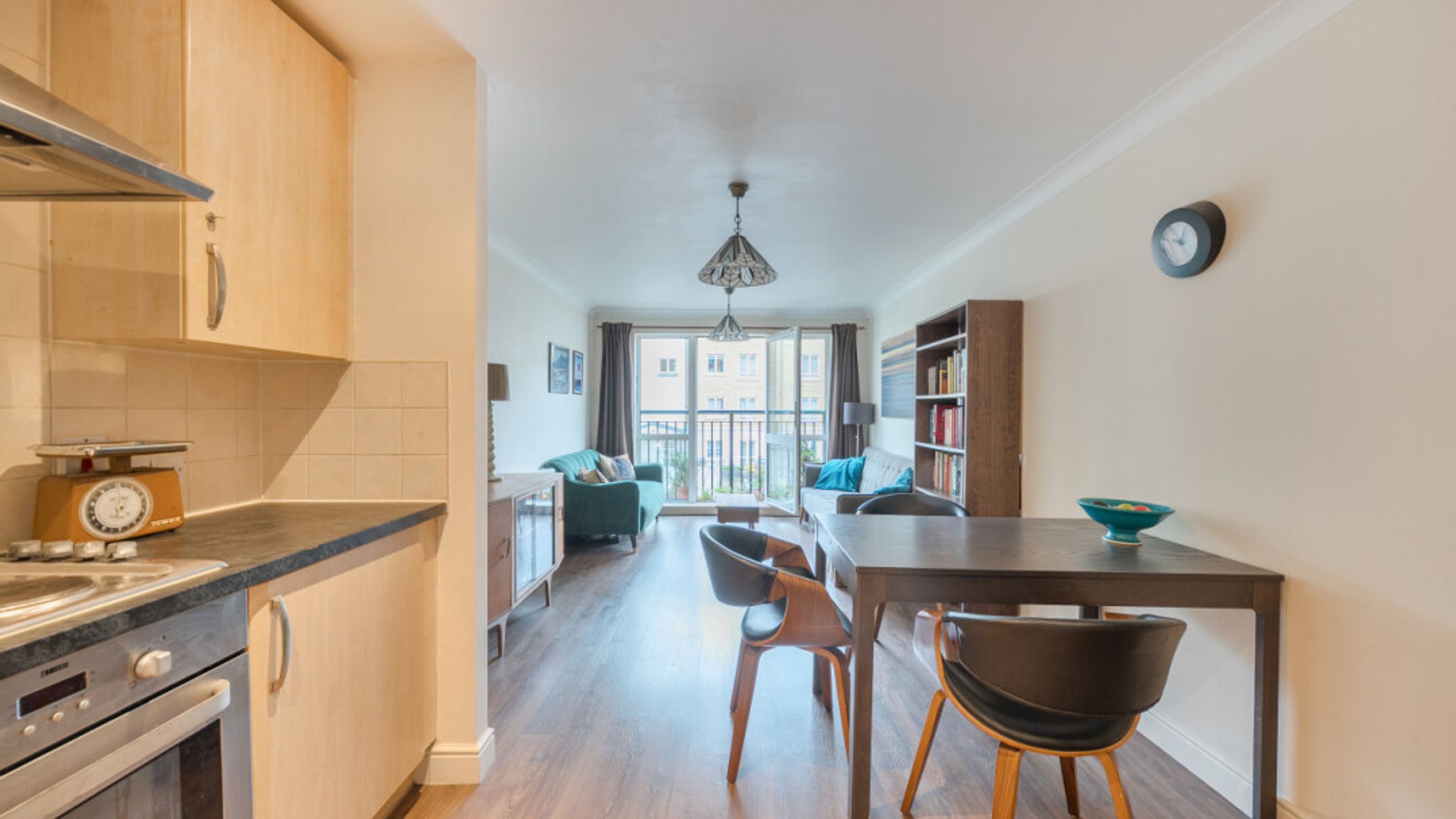Enter this two bedroom east facing apartment via a hallway with storage. A well proportioned open plan reception room has a door leading to a juliette balcony. The kitchen is fitted with a range of Beech wall and base units and includes an integrated oven, hob and extractor. The generous main bedroom gives ample space for a home office or alternatively use the second double room as an office. A recently renovated Metro-tiled bathroom completes the accommodation.