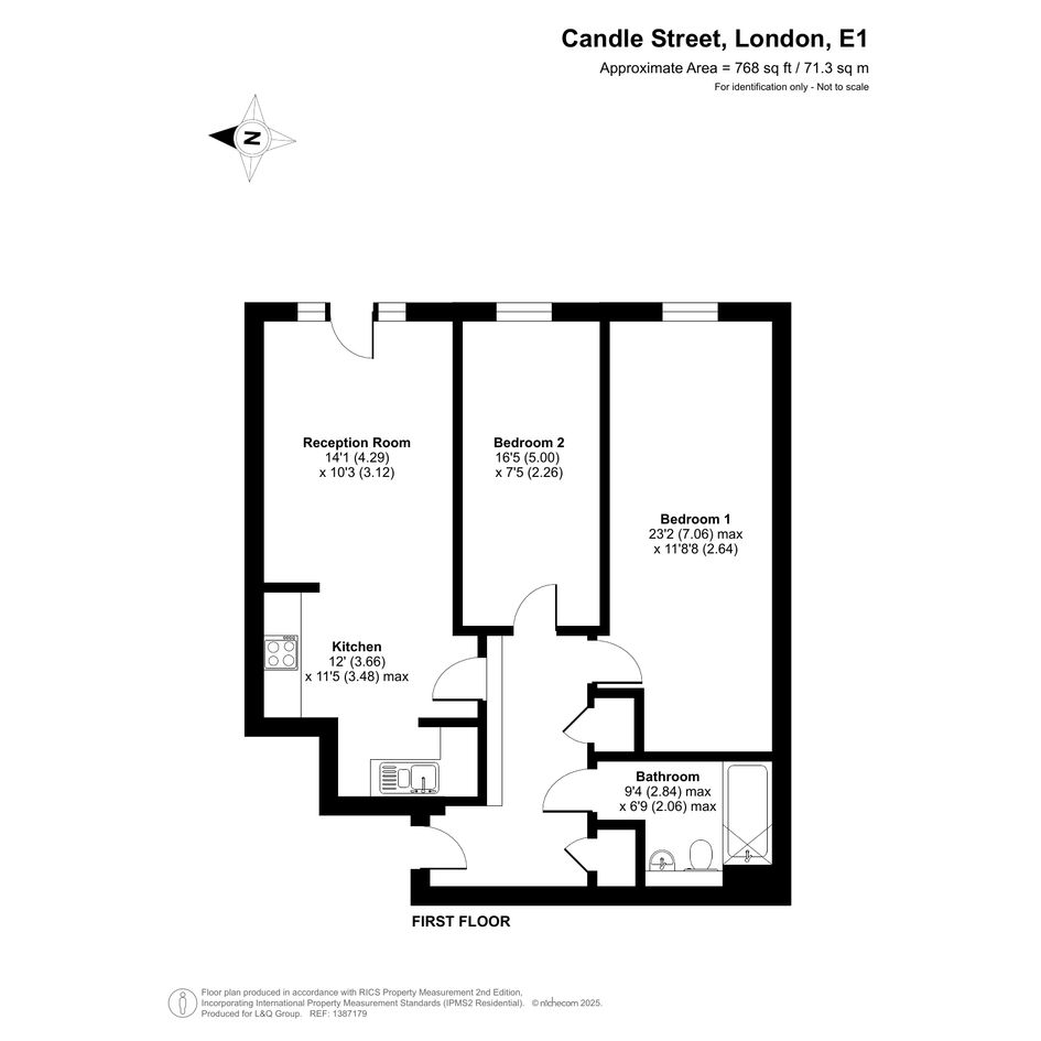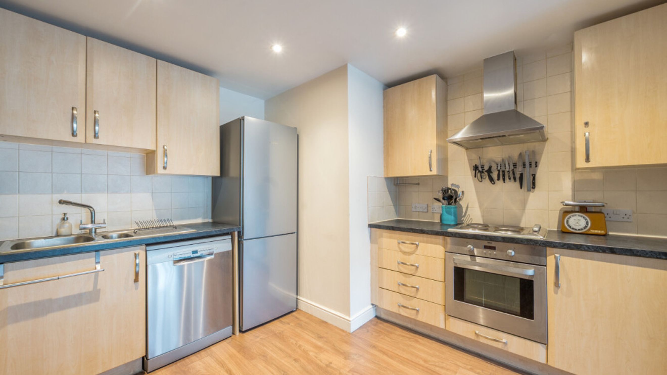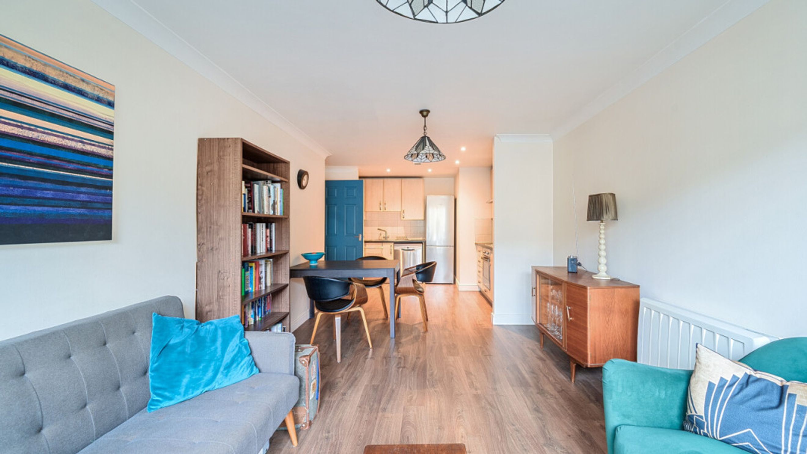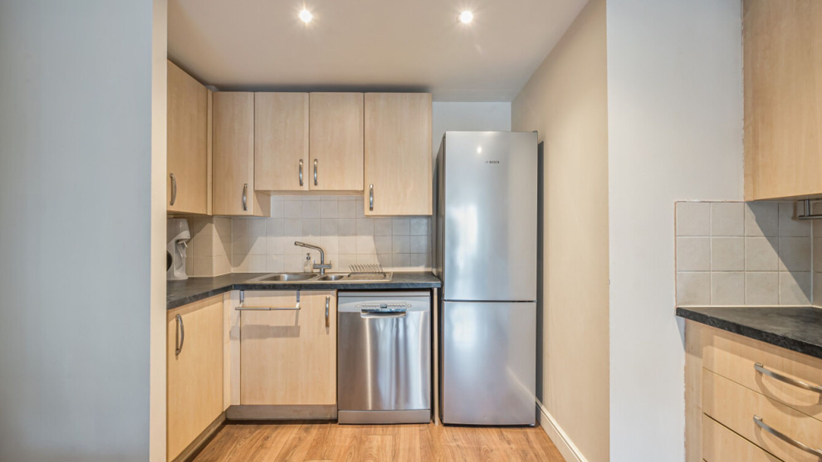 Enter this two bedroom east facing apartment via a hallway with storage. A well proportioned open plan reception room has a door leading to a juliette balcony. The kitchen is fitted with a range of Beech wall and base units and includes an integrated oven, hob and extractor. The generous main bedroom gives ample space for a home office or alternatively use the second double room as an office. A recently renovated Metro-tiled bathroom completes the accommodation.