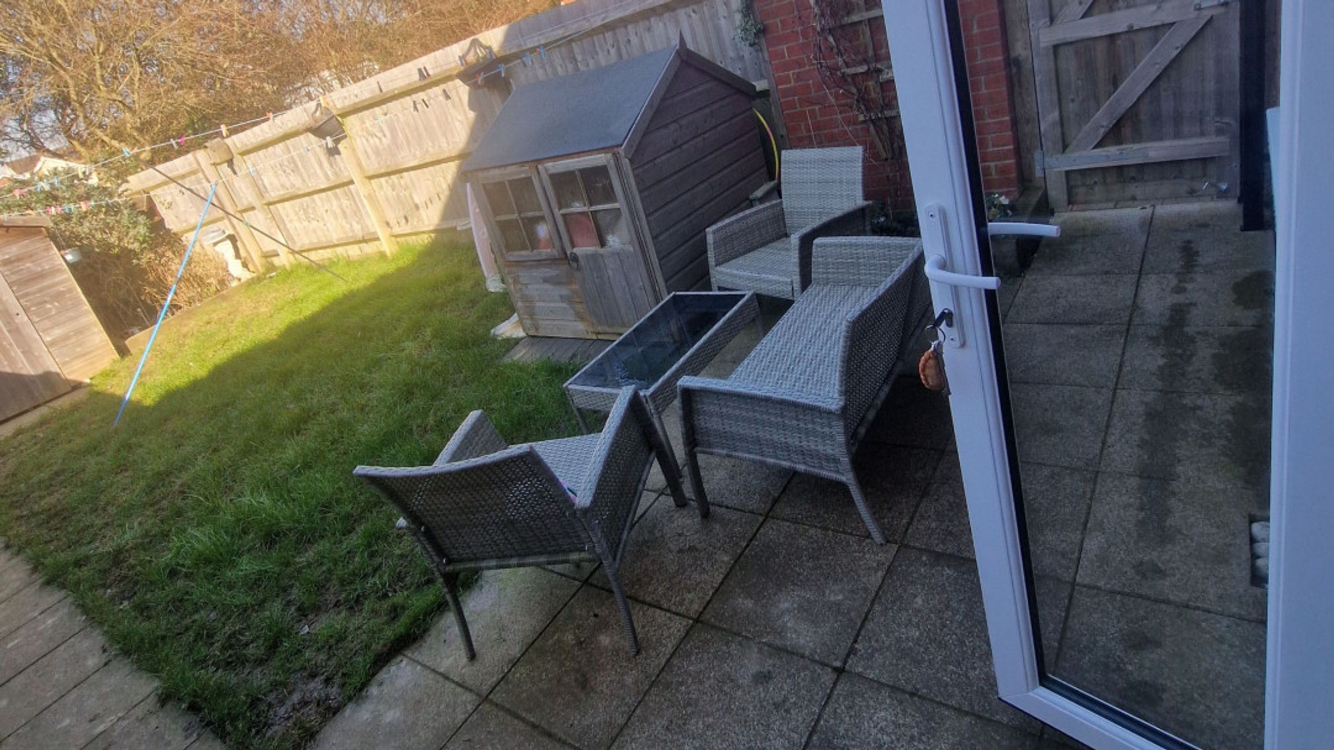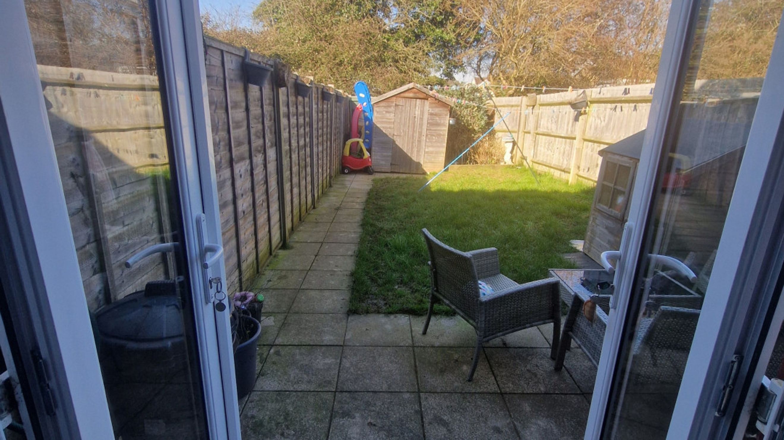 The bright living areas flow seamlessly, with patio doors opening directly onto a private rear garden featuring raised sleeper flower beds, a patio area, and a shed set on a concrete base. Both bedrooms are comfortable double rooms, complemented by ample fitted storage throughout the home.