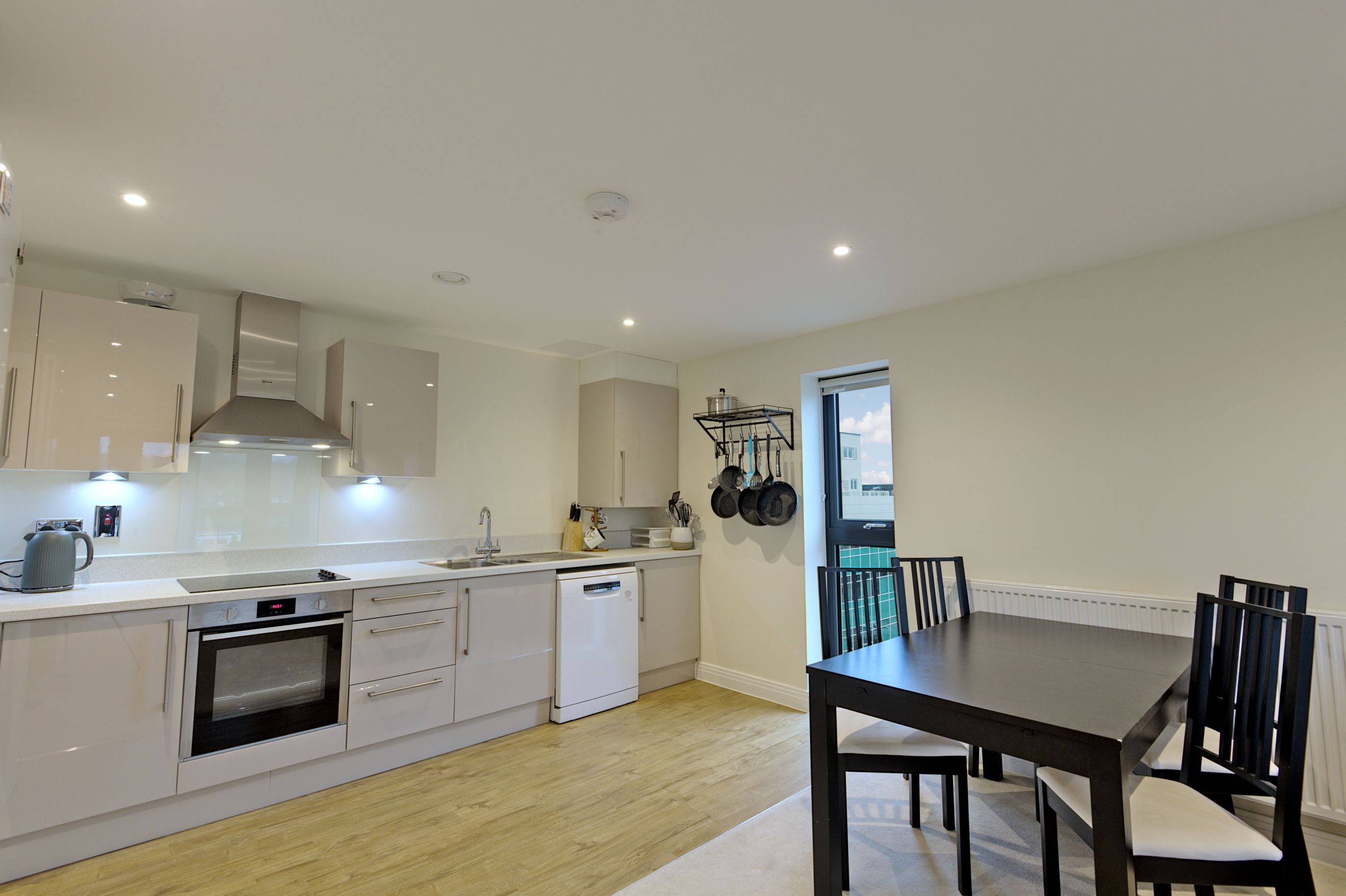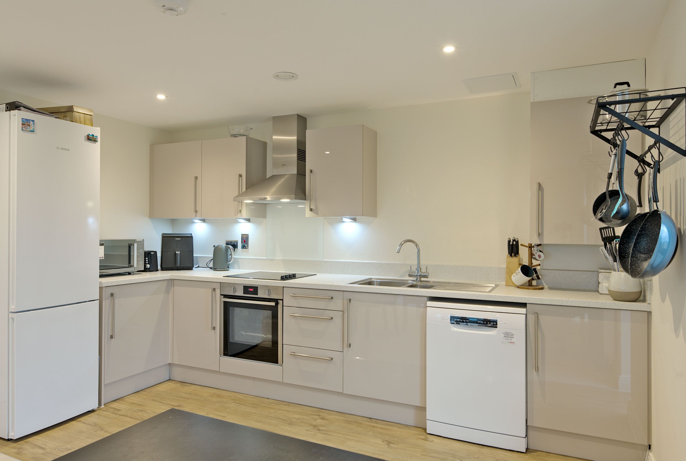 The contemporary kitchen is fully fitted with modern units and integrated appliances, including a dishwasher, offering a practical yet stylish cooking space.