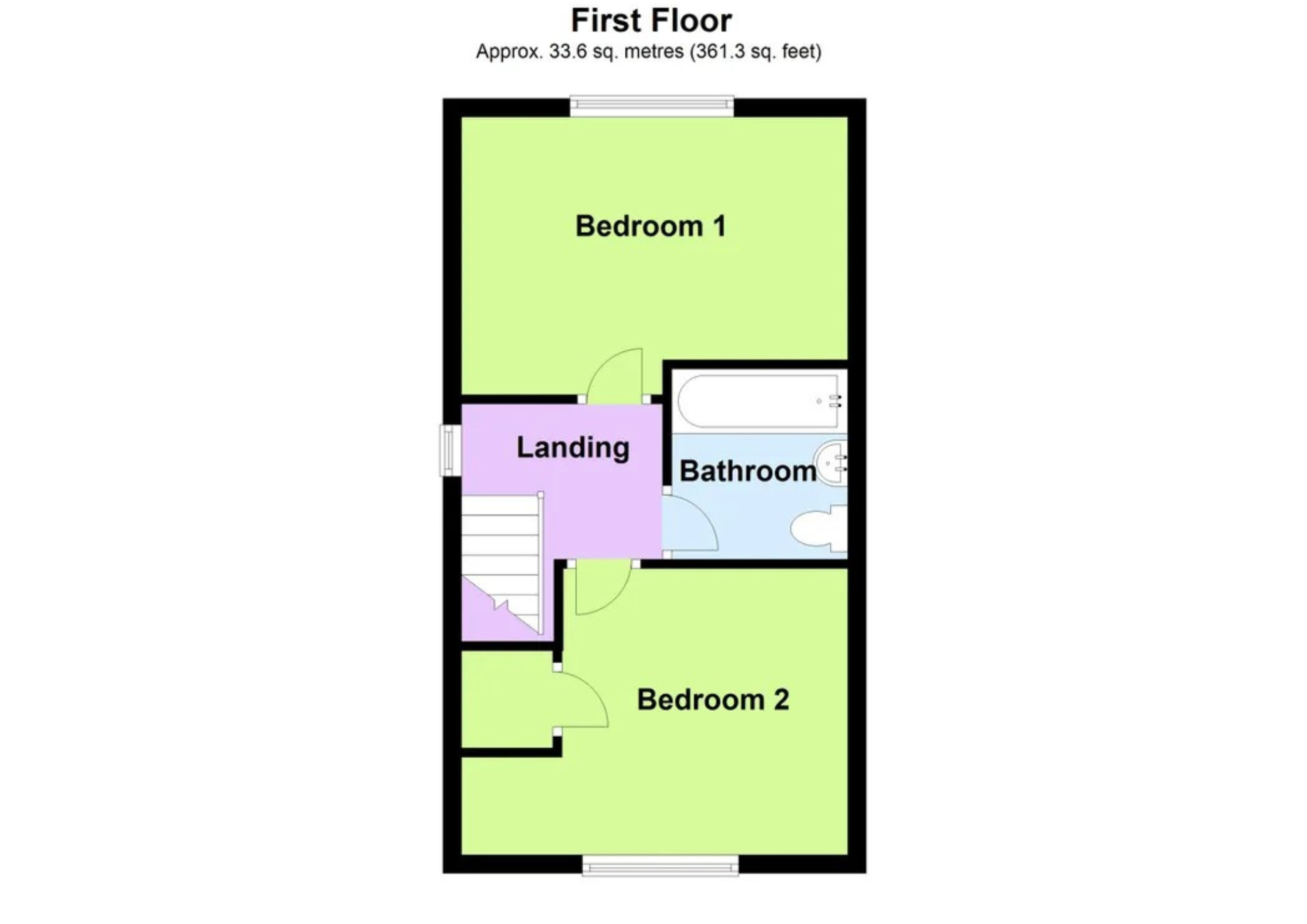 Stairs rising to first floor landing, window to front aspect, built-in cupboard, two radiators, doors to: