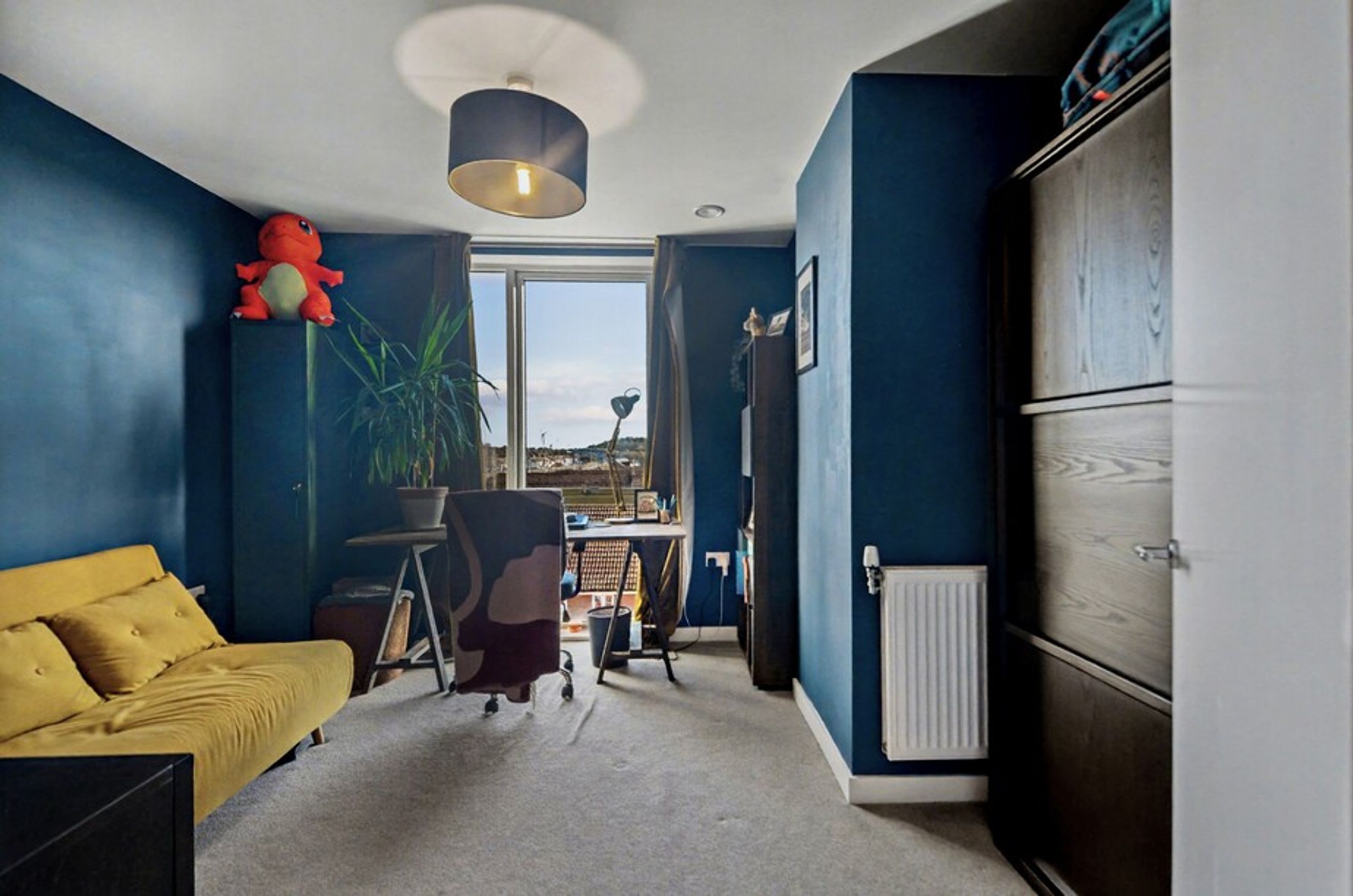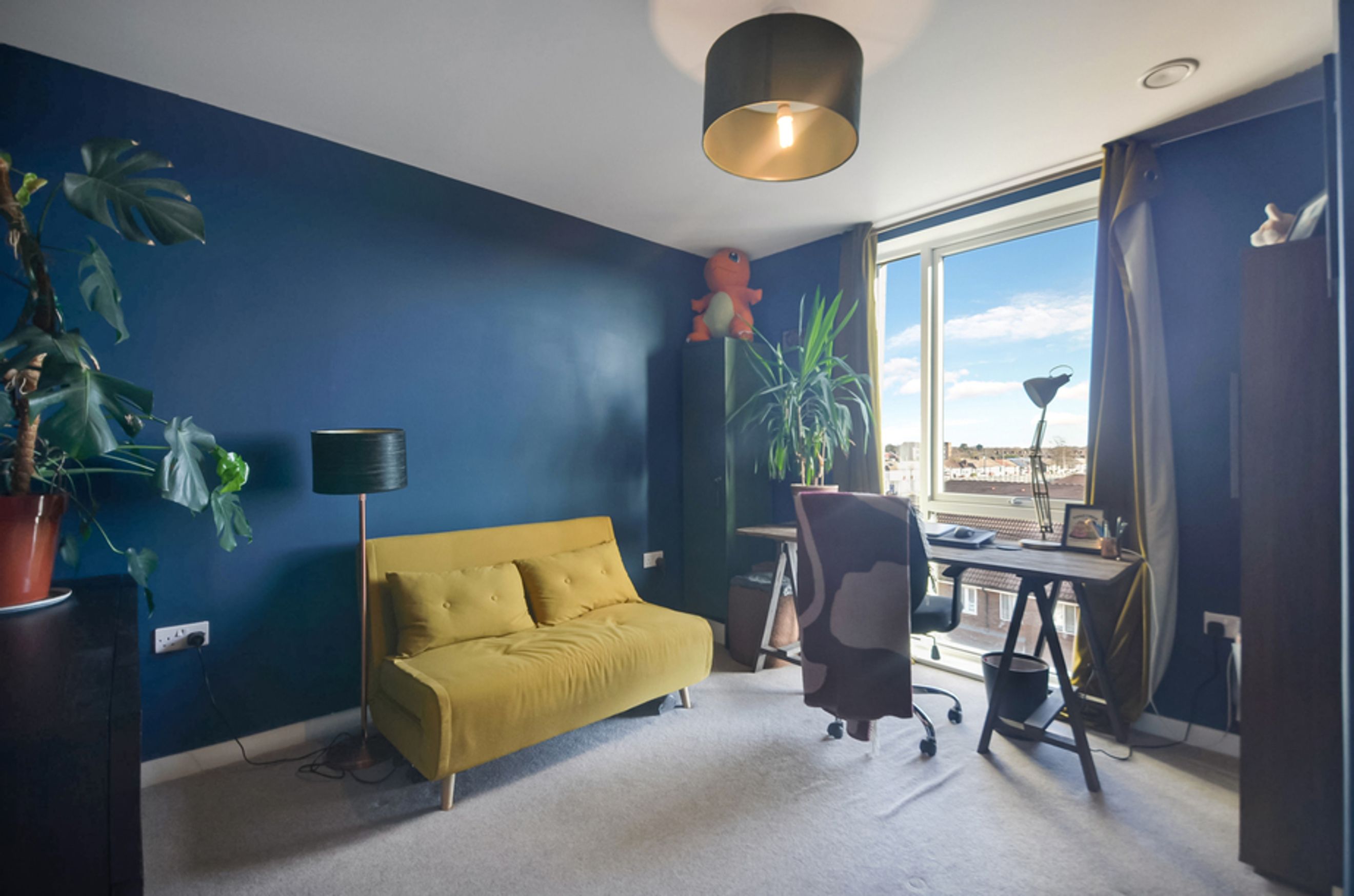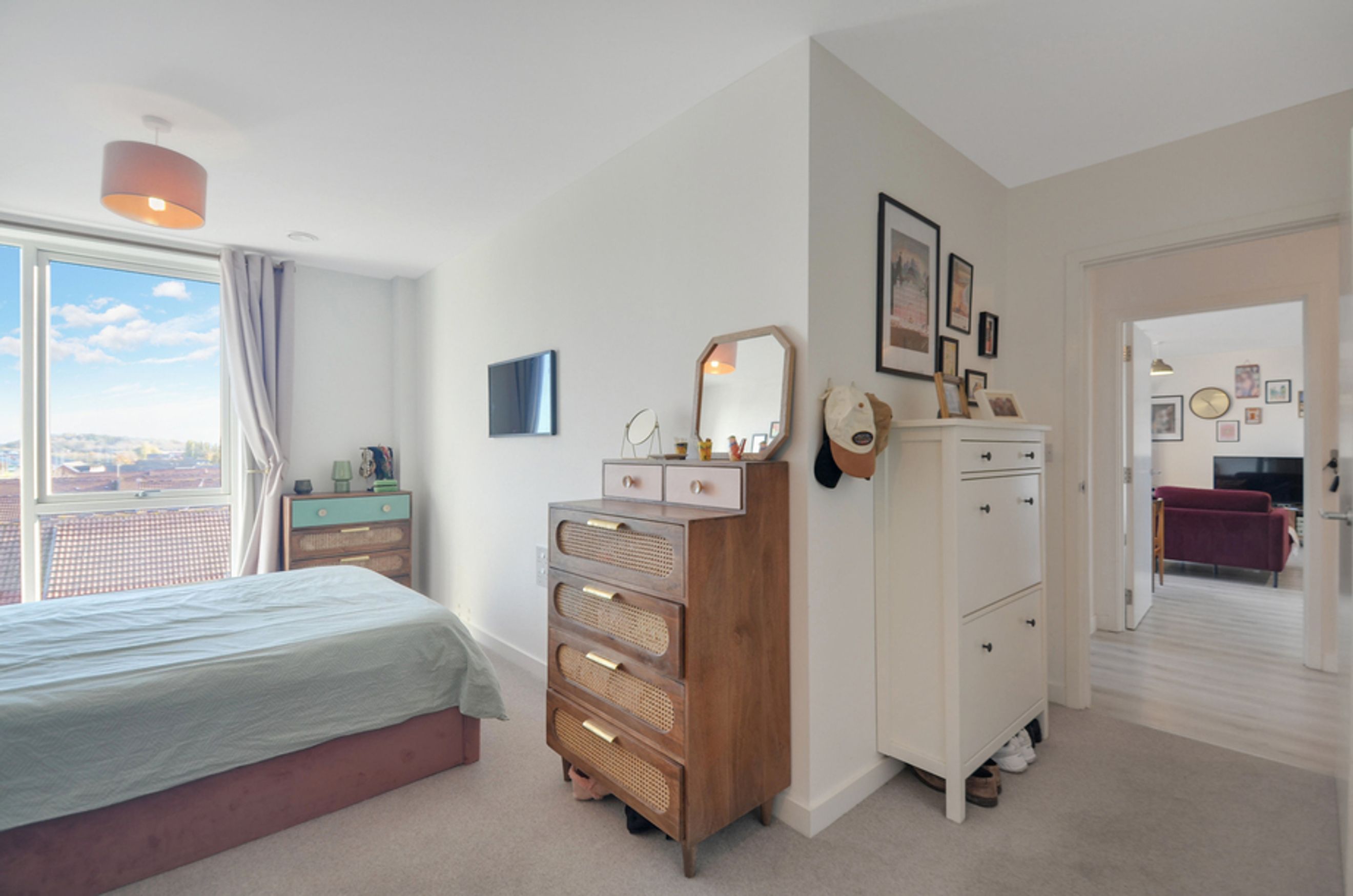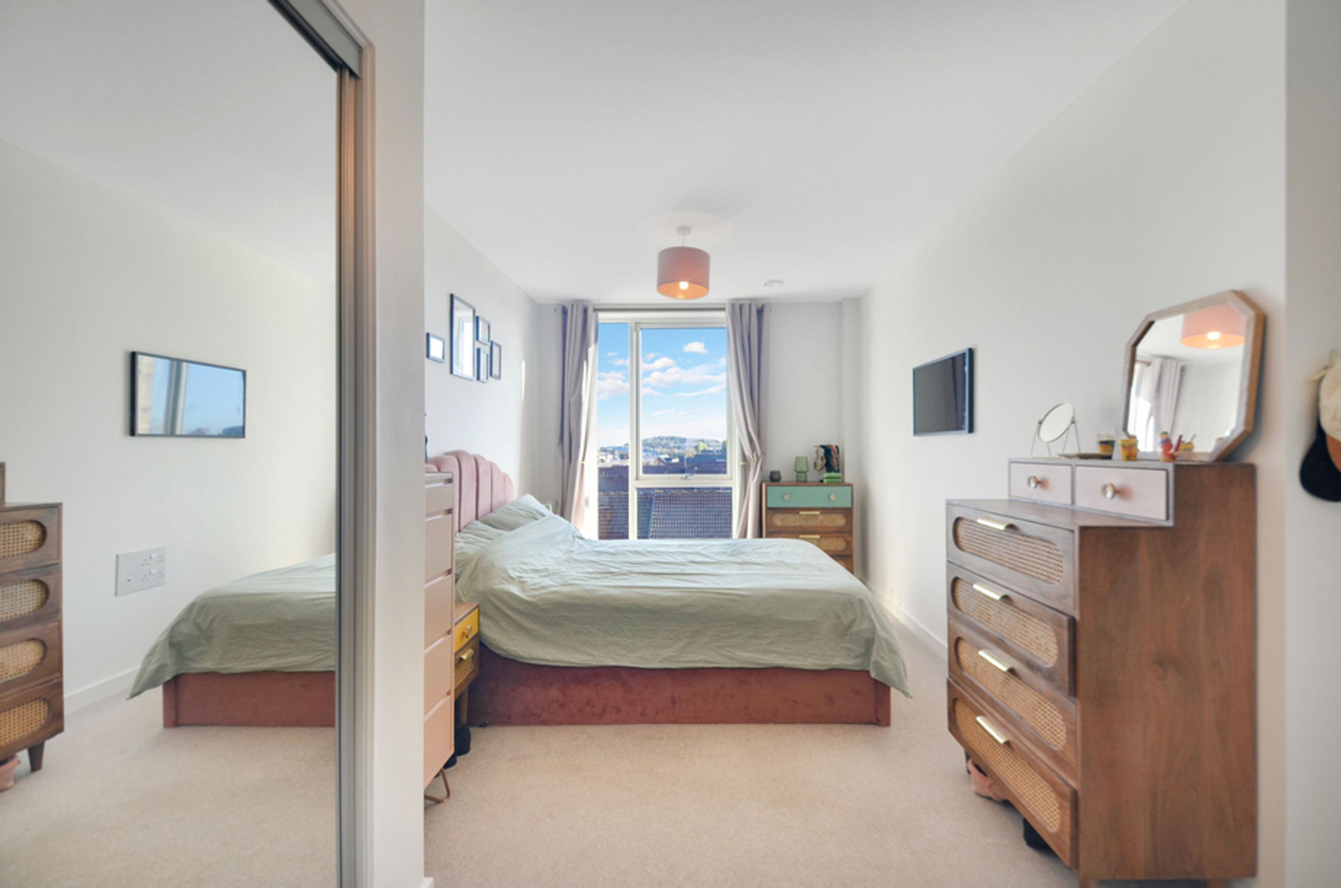 This modern home offers open-plan living with floor-to-ceiling windows, creating a bright and airy space. The kitchen comes fully equipped with integrated appliances, while the master bedroom features a fitted wardrobe for added convenience. Residents can enjoy a range of on-site amenities including a concierge service, gym, and shared workspace, plus secure underground bike storage and a communal garden.