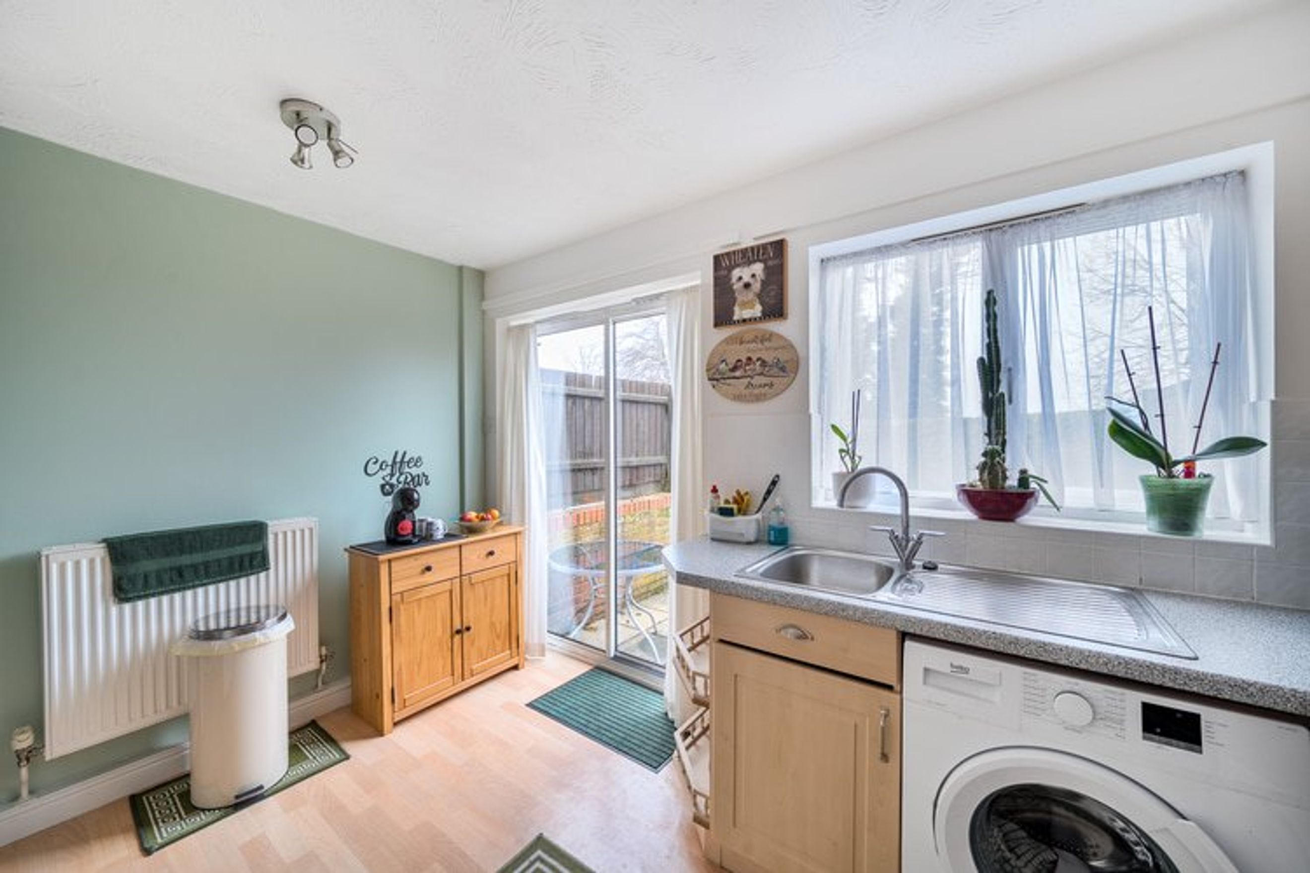 The property on the ground floor comprises an entrance hallway, a living room, and a fitted kitchen combined with a dining space. On the first floor, there are two bedrooms and a bathroom.