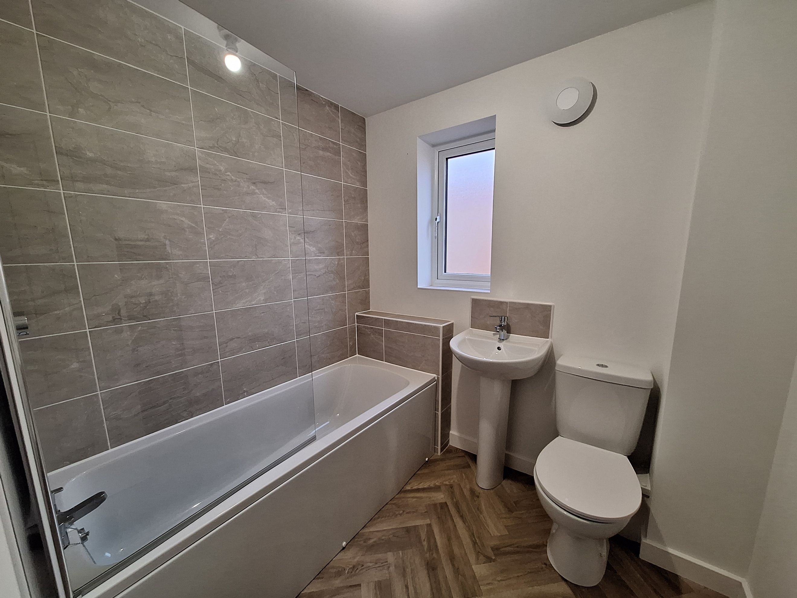 Modern, white bathroom suite with Sink, toilet, bath and glass shower screen.