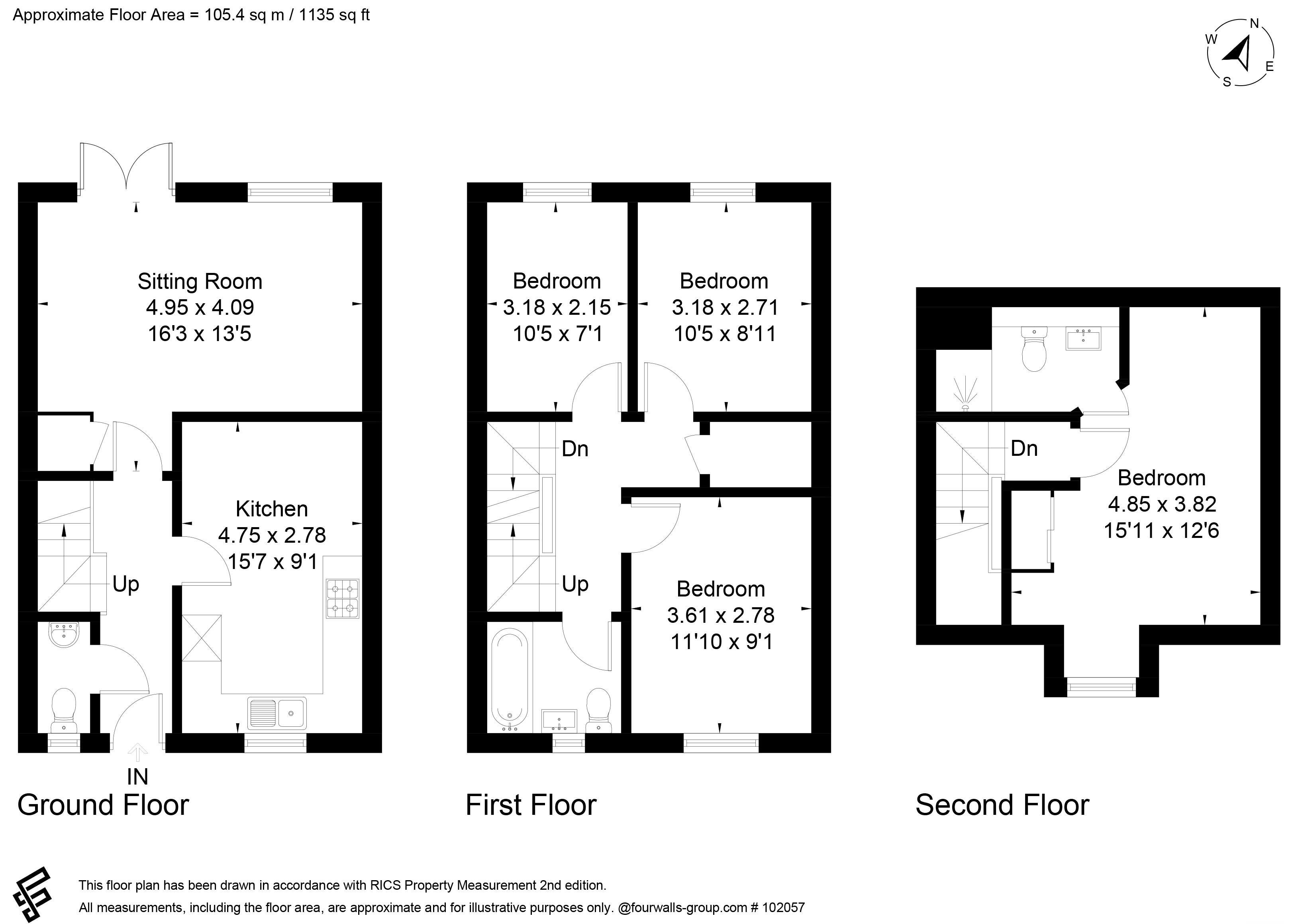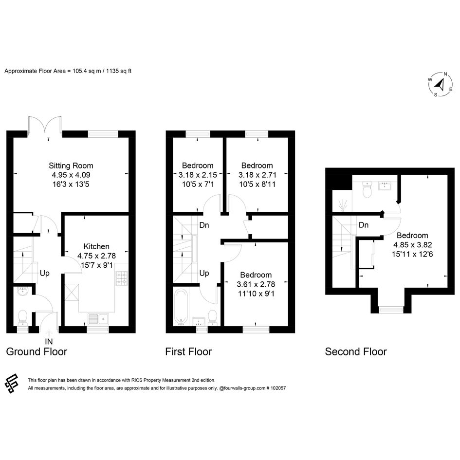 The ground floor comprises a spacious open-plan kitchen and dining area, with integrated white goods, a convenient downstairs toilet, plus a spacious living room with French doors to the rear garden. The first floor houses two double bedrooms plus a single bedroom and a family bathroom whilst the top floor is dedicated to the impressive master bedroom with built in wardrobes and its own ensuite shower room.