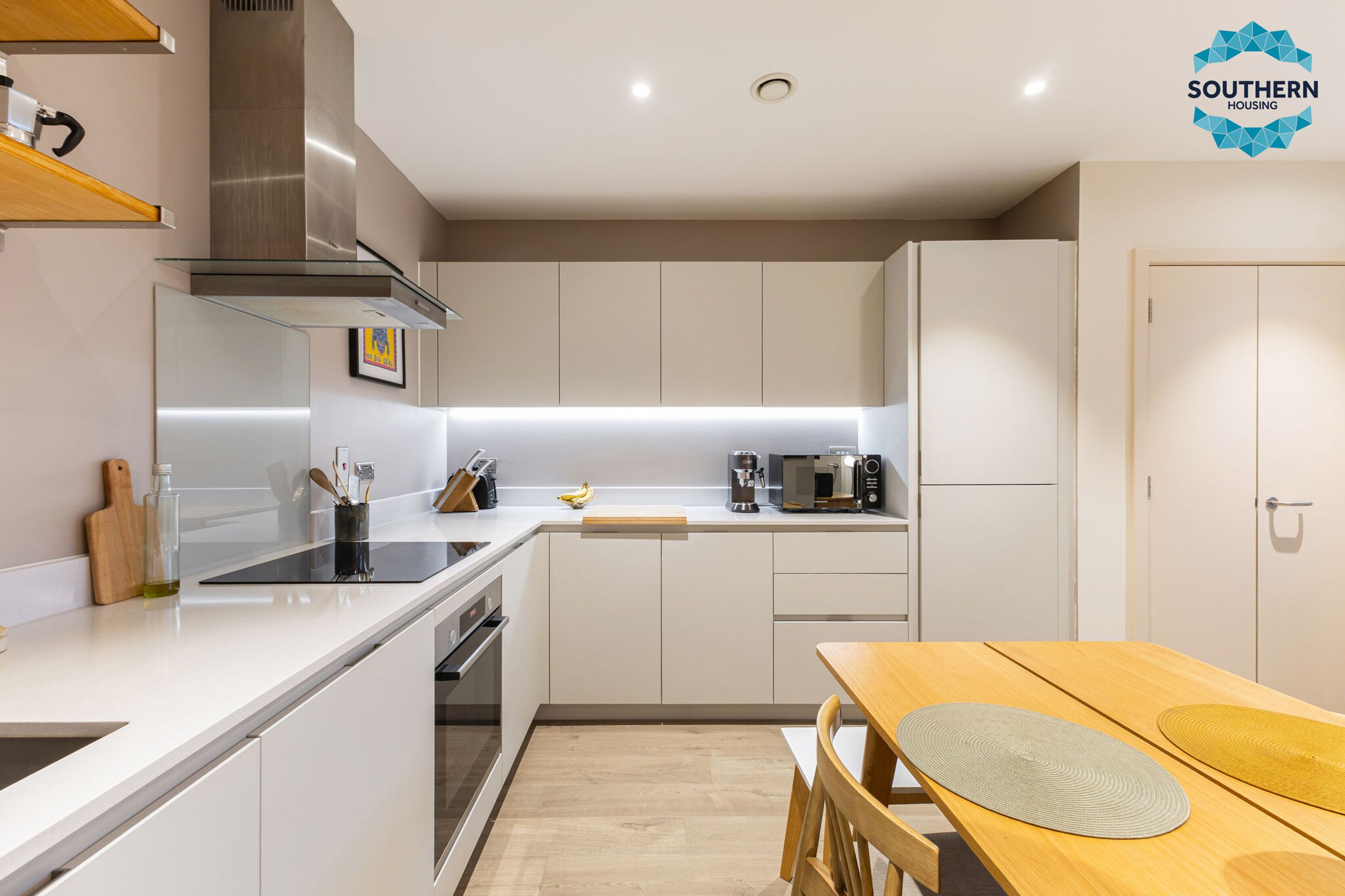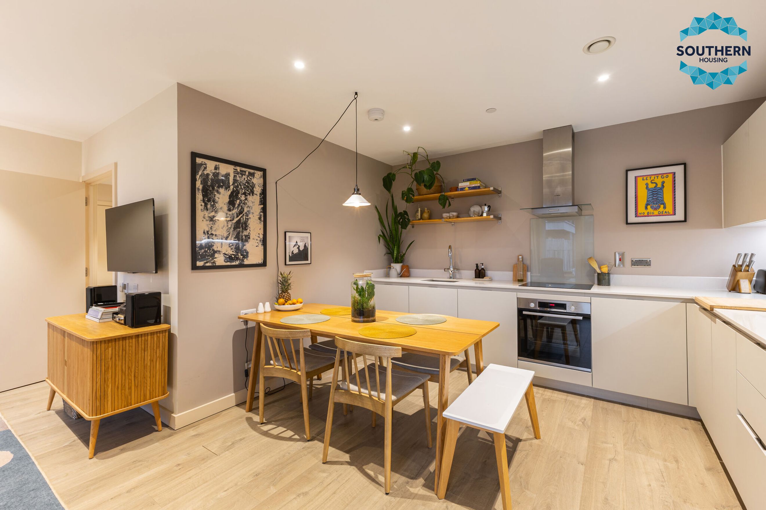 The bright and airy open‑plan kitchen, dining, and living area forms the heart of the home-perfect for both relaxing and entertaining. The contemporary kitchen is equipped with integrated appliances including an oven, hob, extractor fan, fridge/freezer, and dishwasher.