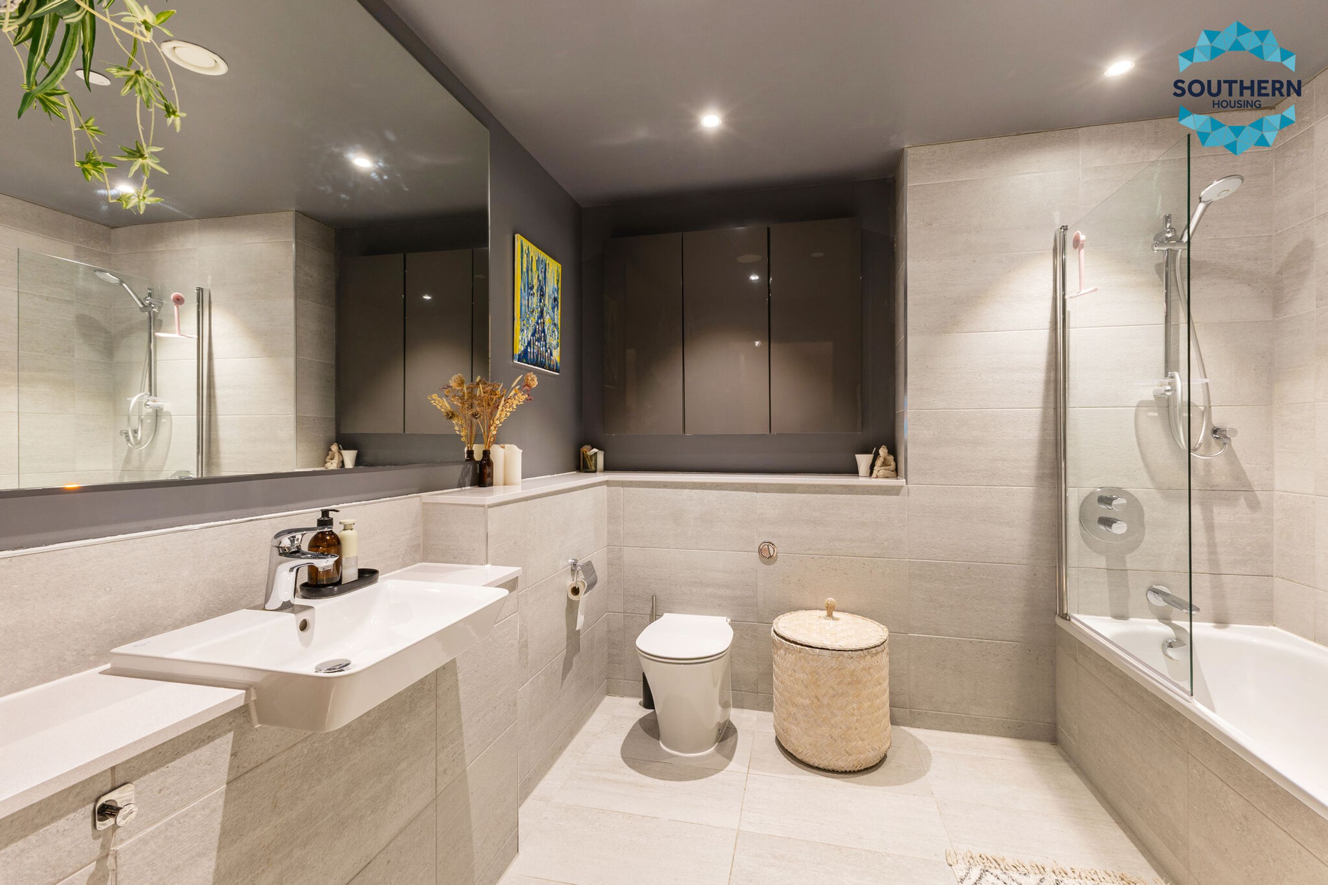 A stylish, modern bathroom with a bath and overhead shower completes the internal layout.