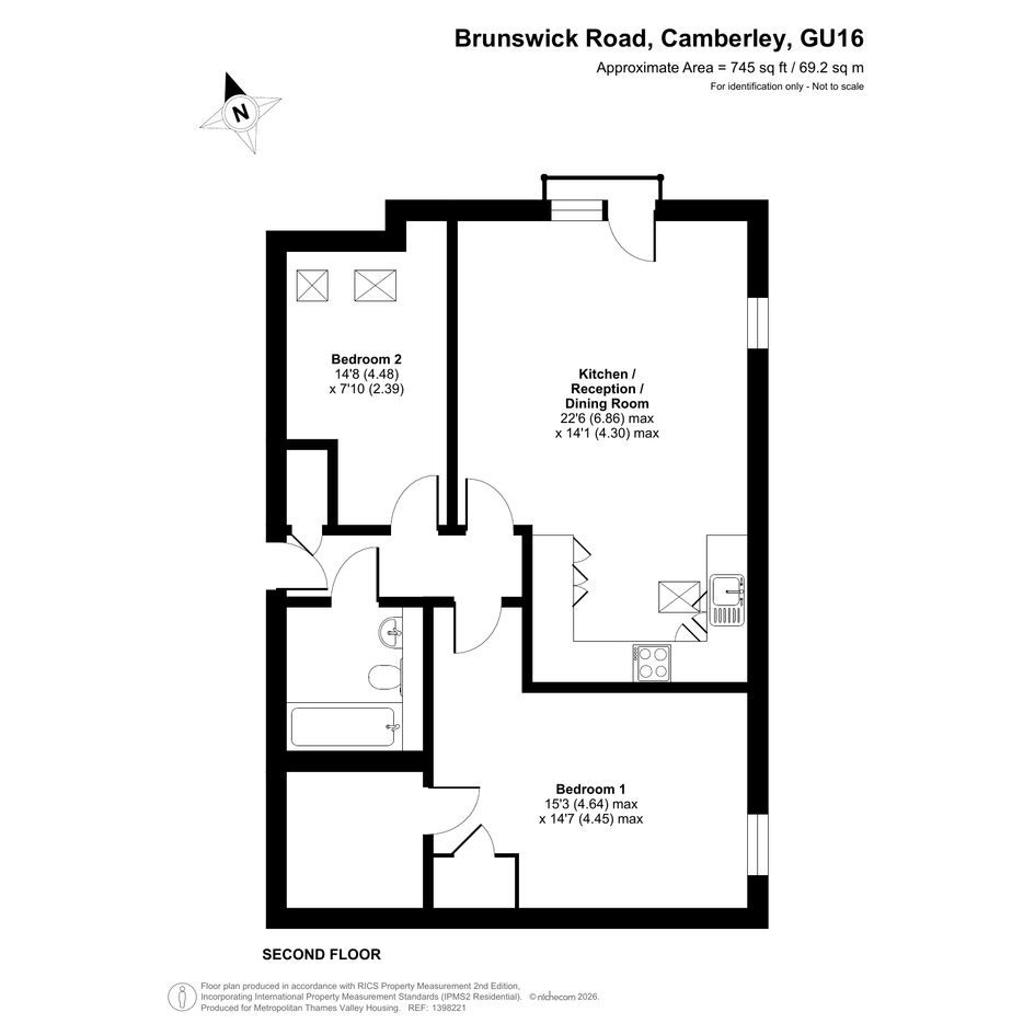 The property features an entrance hallway, an open plan living room and kitchen, two bedrooms and one bathroom.