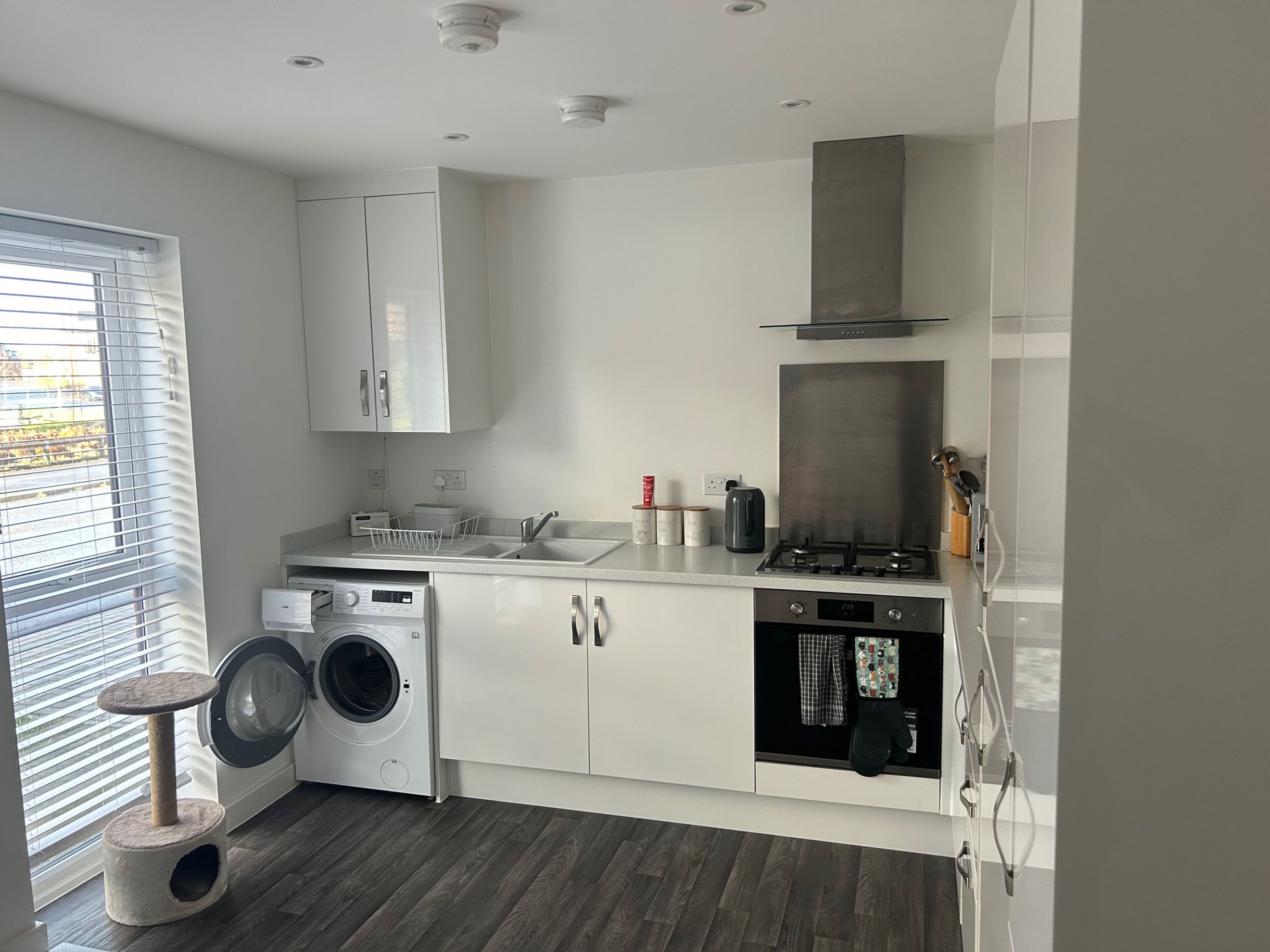 The ground floor includes an entrance hall with downstairs WC and a modern kitchen fitted with an integrated fridge freezer, oven, hob and extractor fan. Storage is a key feature of the home, with multiple cupboards conveniently positioned throughout. The first floor offers three well-proportioned bedrooms, including a master bedroom with ensuite, alongside a modern family bathroom.
