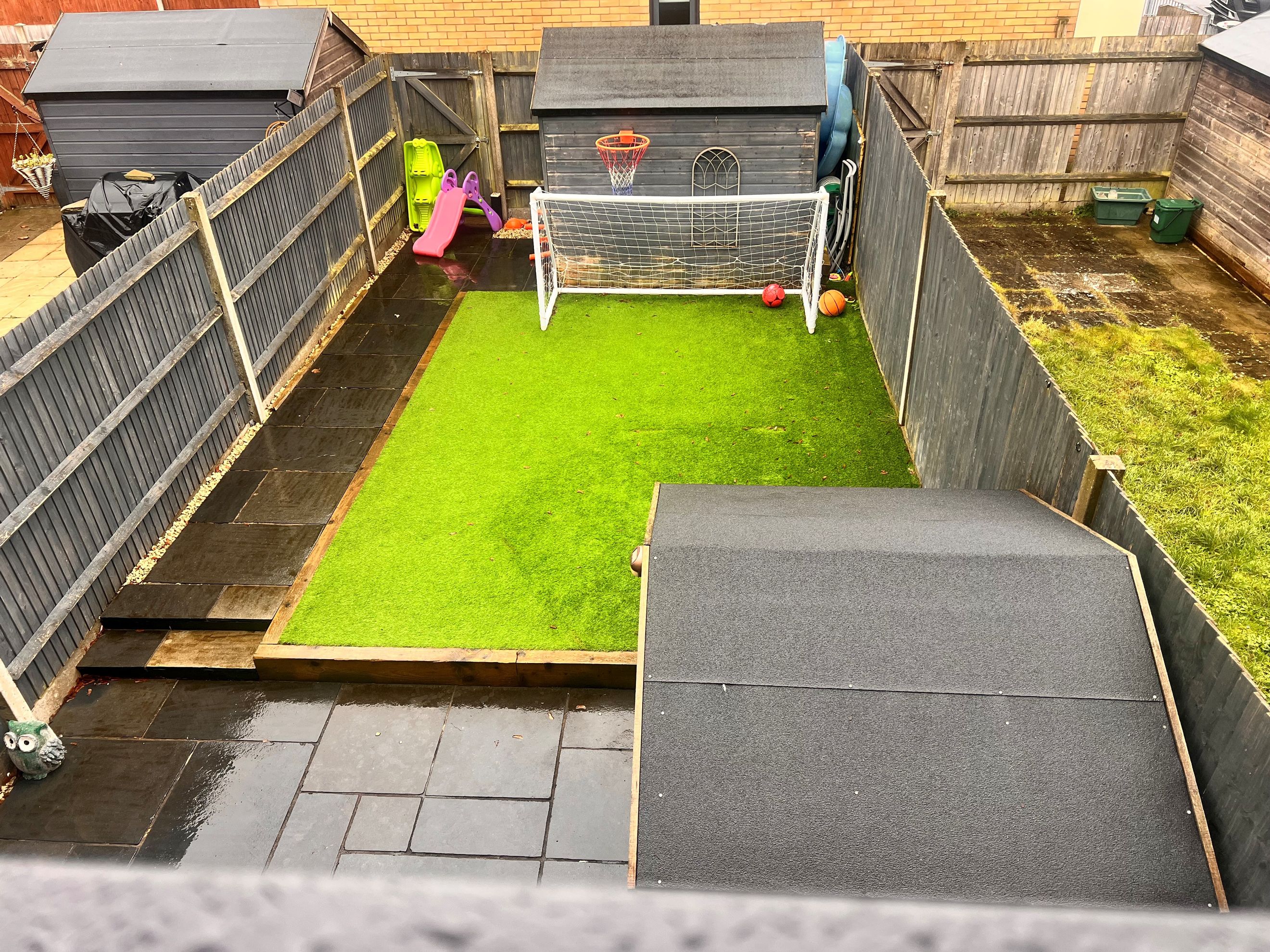 The living area leads out to a private rear garden with gated access and a storage shed, providing a secure and functional outdoor space. A park is located directly outside the property, offering an immediate green outlook.
