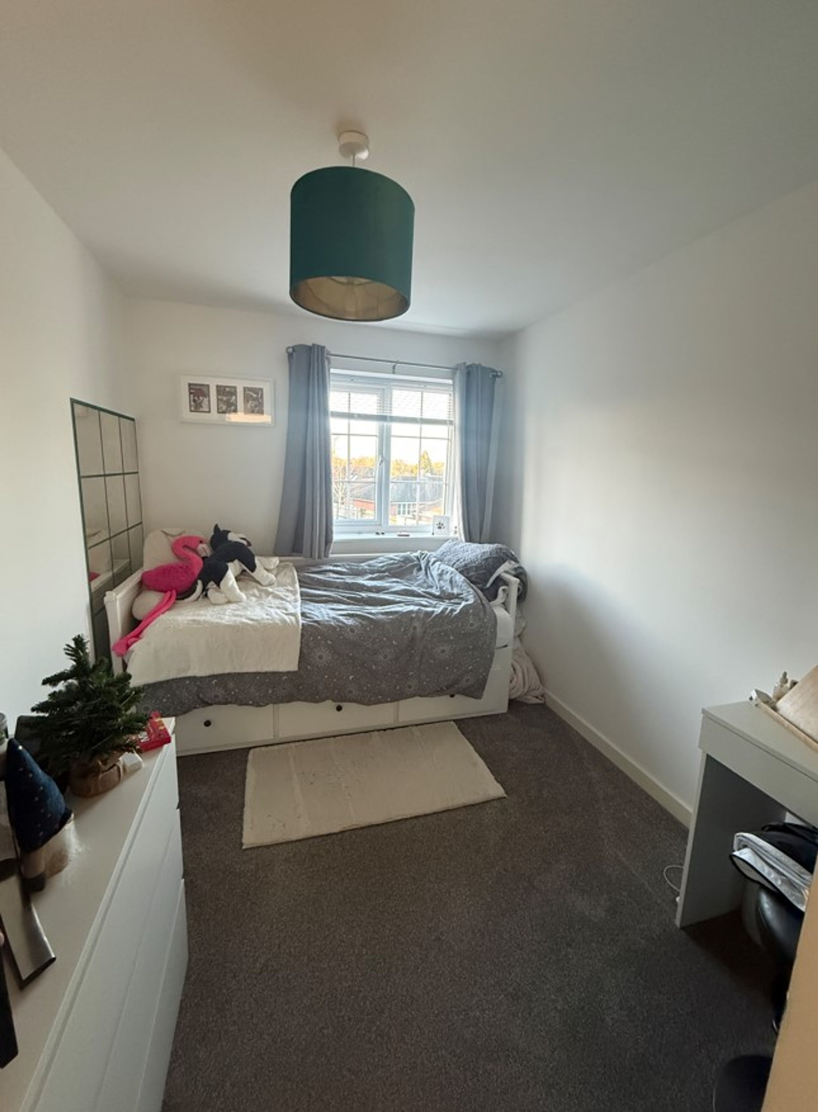 There are two bedrooms — one comfortable double and one single — along with a family bathroom featuring a three‑piece suite and a shower over the bath.