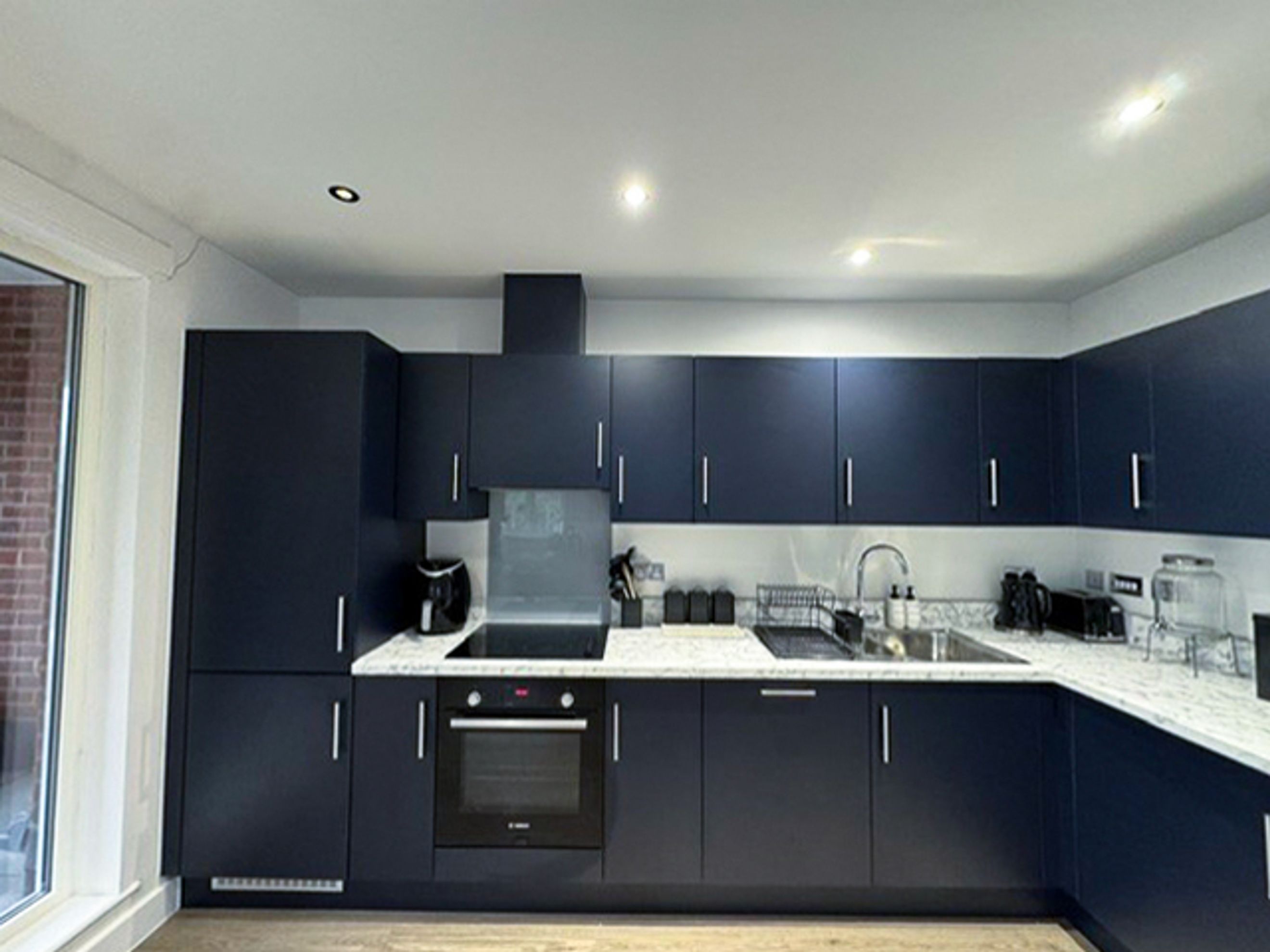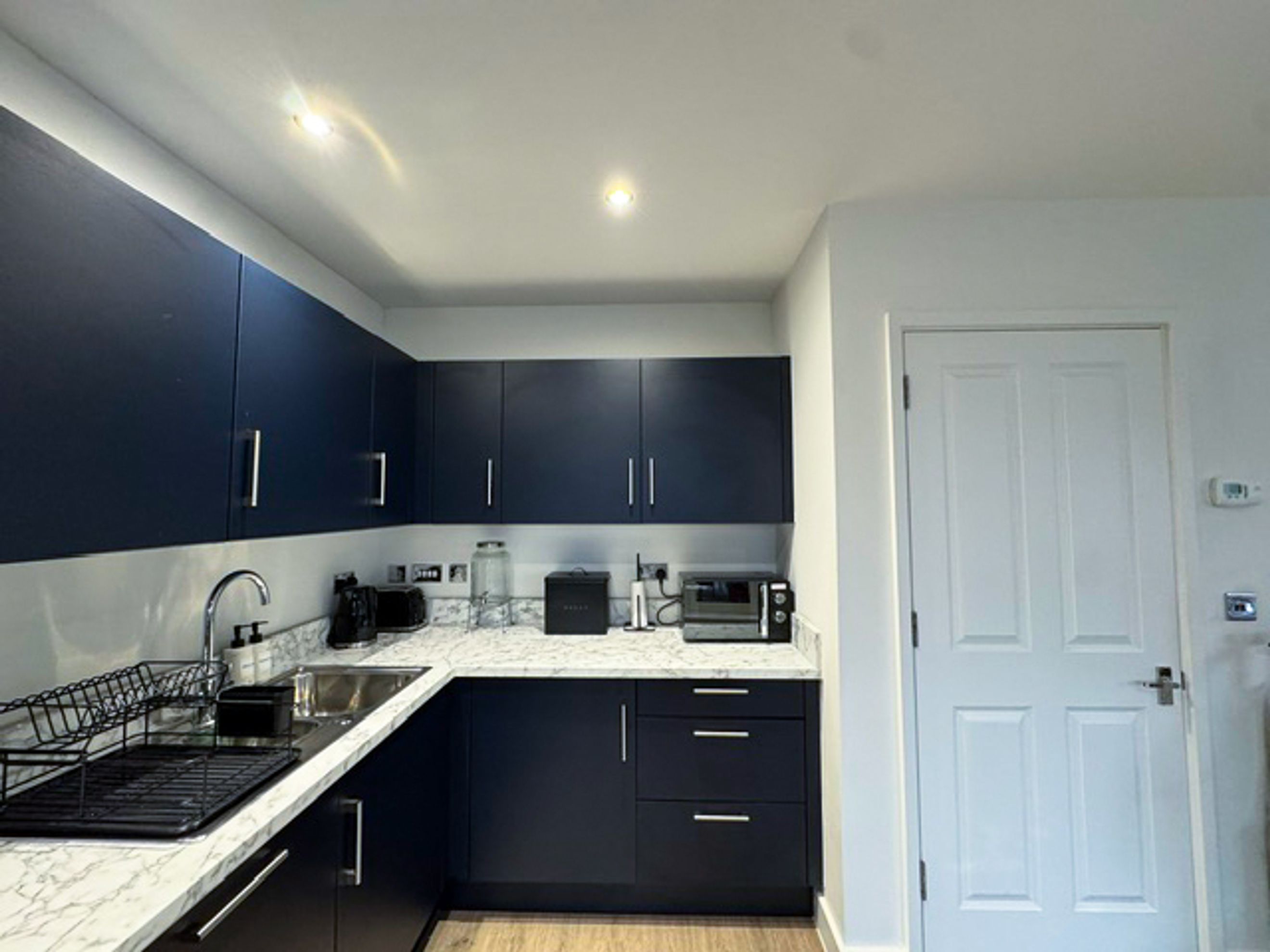 This luxury apartment also benefits from a private, intimate, brick‑enclosed balcony, offering serenity and privacy with leafy views beyond. Both bedrooms enjoy plenty of natural light, while the spacious open‑plan living area is ideal for relaxing or entertaining guests, showcasing the gorgeous blue kitchen with marble‑effect worktops.