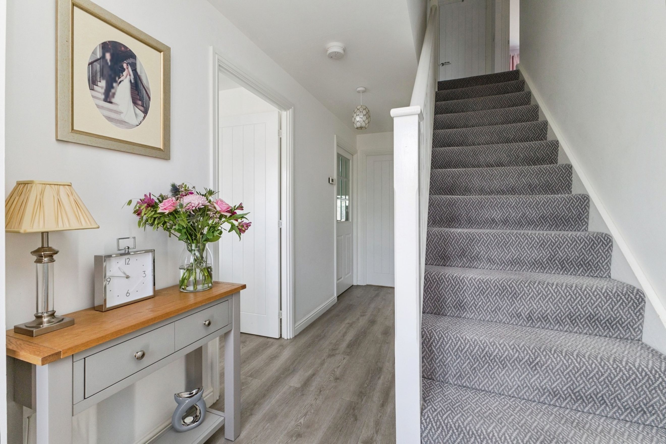 Step inside to discover a thoughtfully designed interior, featuring Karndean flooring throughout the ground floor for a sleek and low-maintenance finish. The heart of the home is a modern kitchen with built-in cupboards, a contemporary cooker tap, and ample space for dining. Adjacent to the kitchen is a flexible room ideal as a formal dining area or home office.