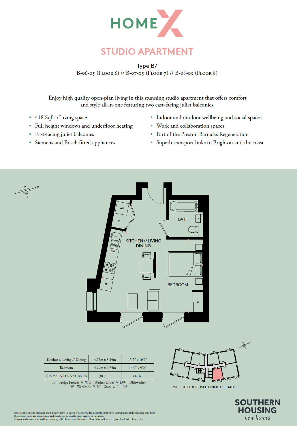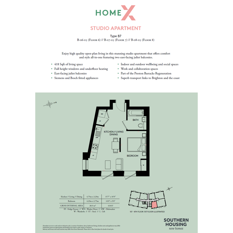 A striking studio apartment that provides high-quality open-plan living and offers comfort and style all-in-one feature two-east facing Juliet balconies. This apartment benefits from full height windows, underfloor heating and has superb transport links to Brighton and the coast.