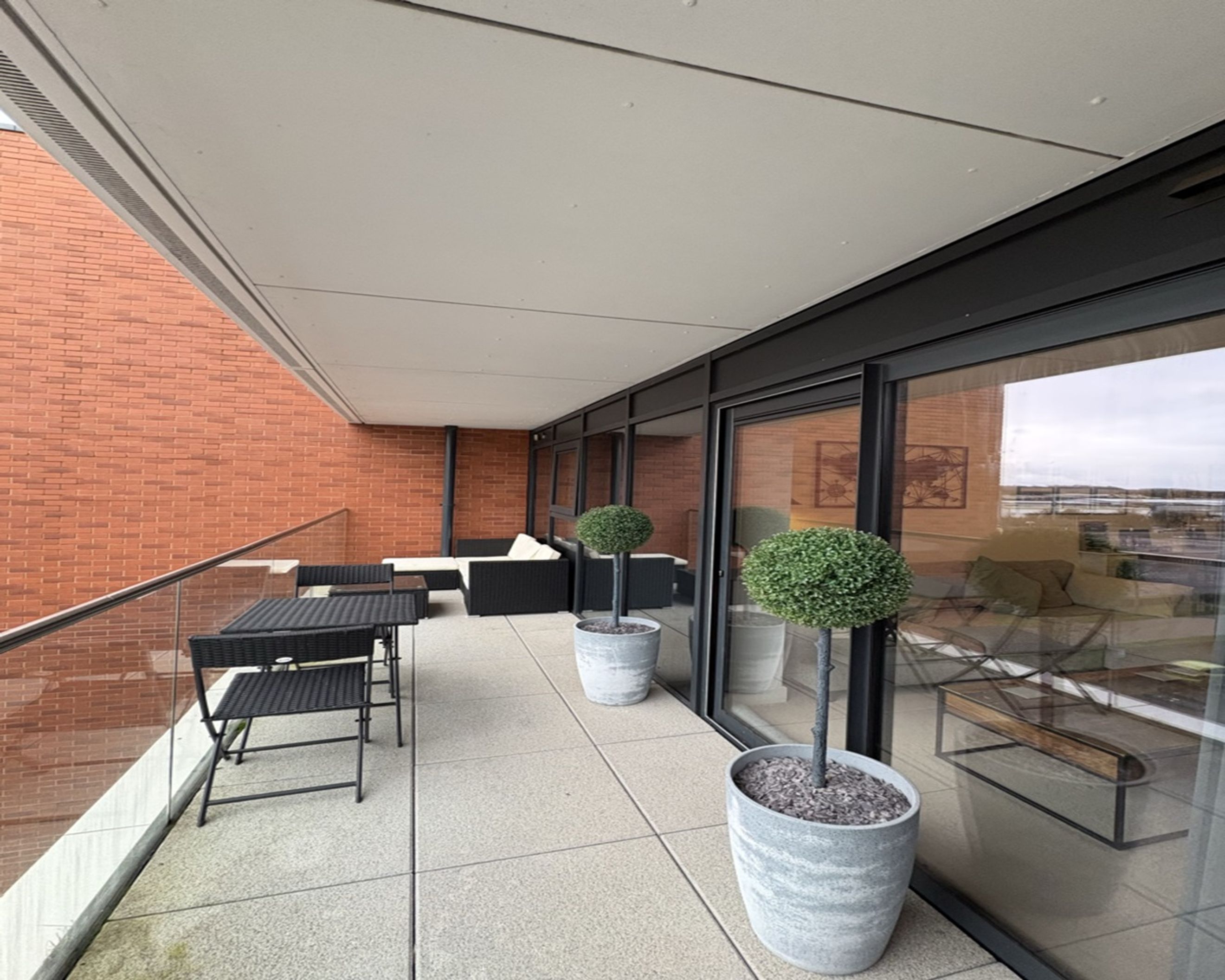 Open plan living/dining area/kitchen with double doors opening onto a spacious balcony.