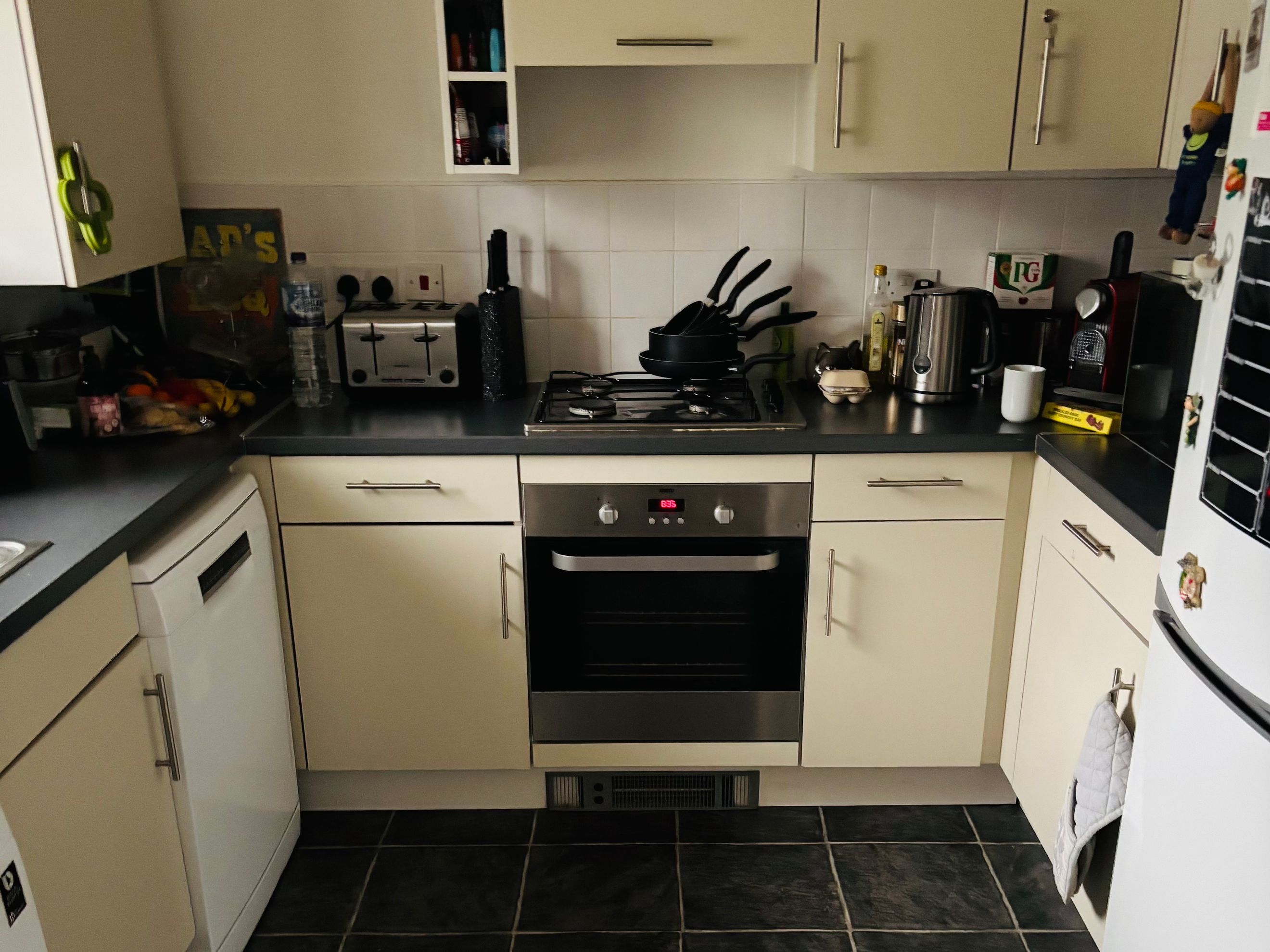 A welcoming hallway leads to a spacious, light-filled living room and a smart, well-equipped kitchen with ample storage and integrated cooker.