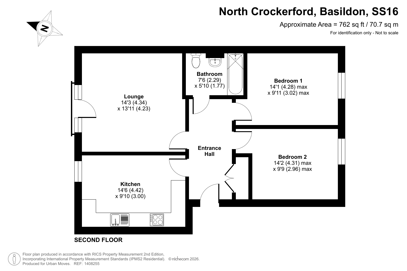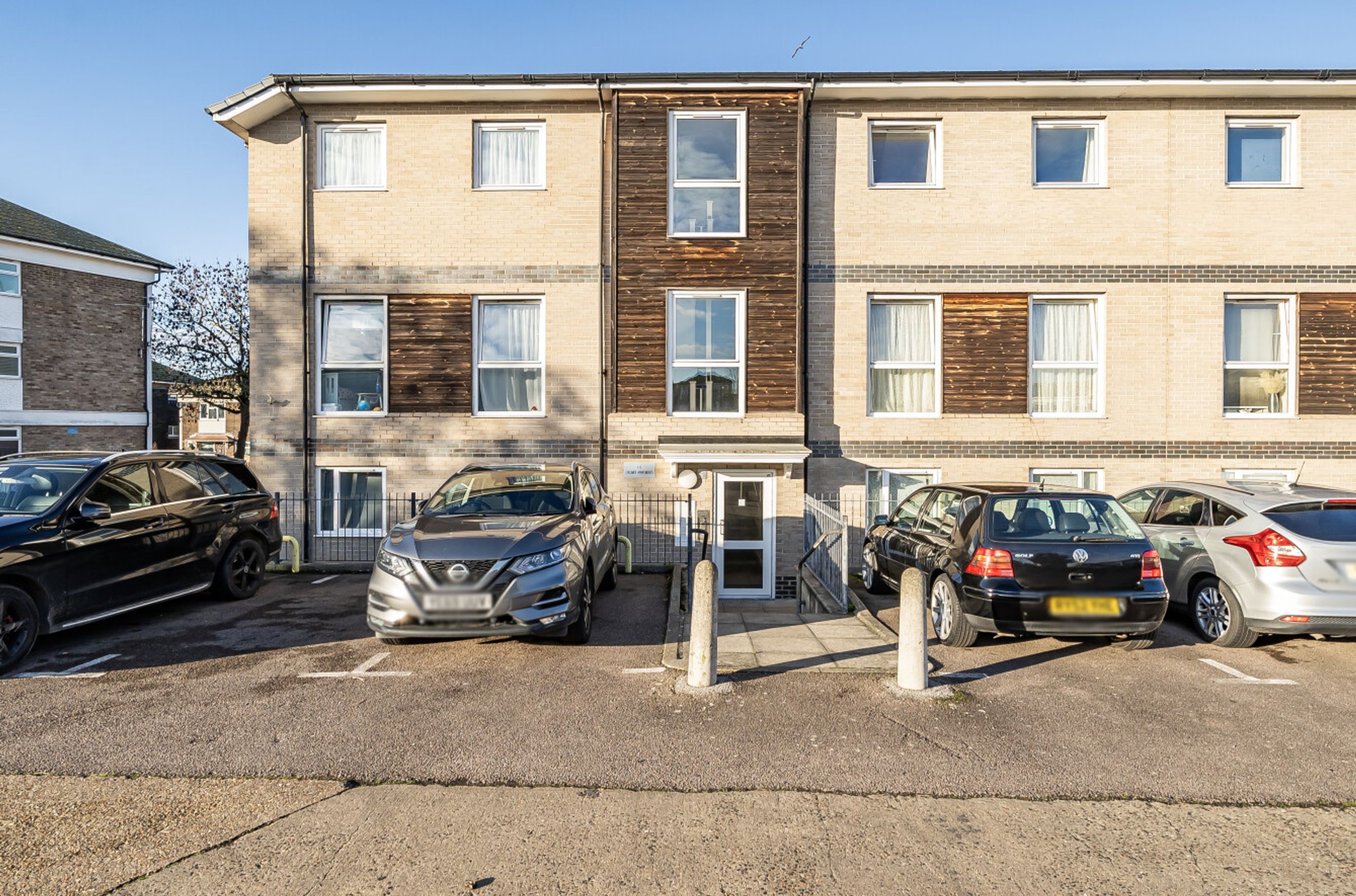 A well-proportioned flat on the top (second) floor of a modern development. The property has a spacious reception room with Juliette balcony and a kitchen large enough to fit a dining table, comfortably. The two bedrooms are very similar in size, there is a bathroom featuring decorative mosaic tiles and a storage/utility cupboard has been provided in the entrance hall. Well insulated walls and roof, modern double glazing and gas central heating make for a good energy-efficiency rating. The development has a communal car park and Basildon town centre/railway station can also be easily reached via bus or bike. Country Parks such as Langdon Hills, Northlands Wood and Westley Heights offer attractive, outside space to explore and are only a brief drive away.