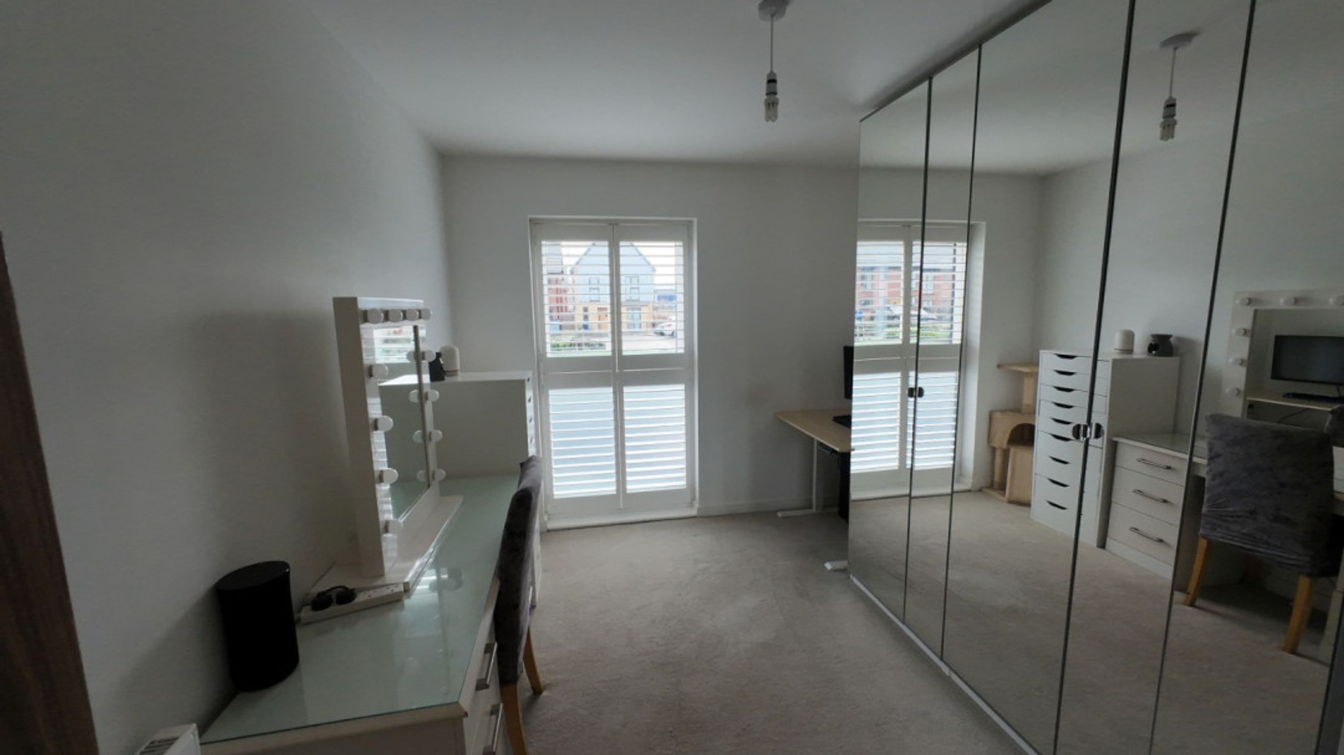 Two bedrooms fitted with carpets and large triple glazed windows fitted with shutters. Master bedroom has an ensuite.