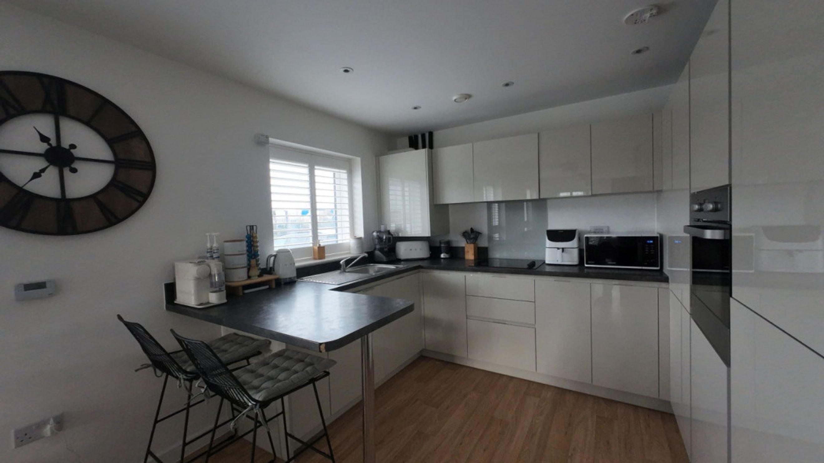 Fitted with wall and base kitchen units, splash back, triple glazed windows fitted with shutters, limited flooring, breakfast bar, stainless steel sink and drainer, Zanussi fridge, Zanussi oven, Zanussi hop and BOSCH dishwasher.
