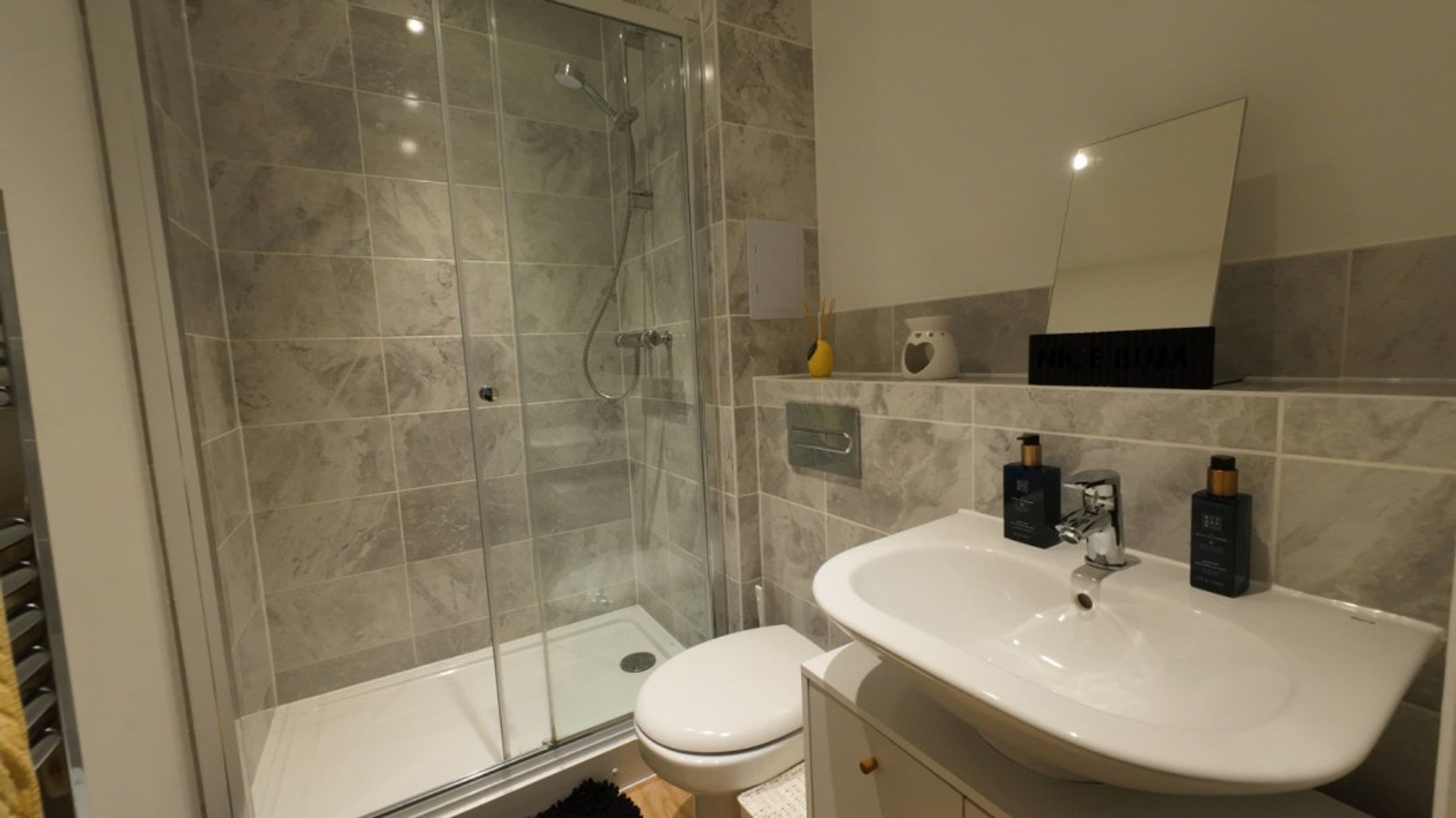Main bathroom has part tiled walls, laminate flooring, an integrated shower bath, floating sink, toilet and heated towel rail.