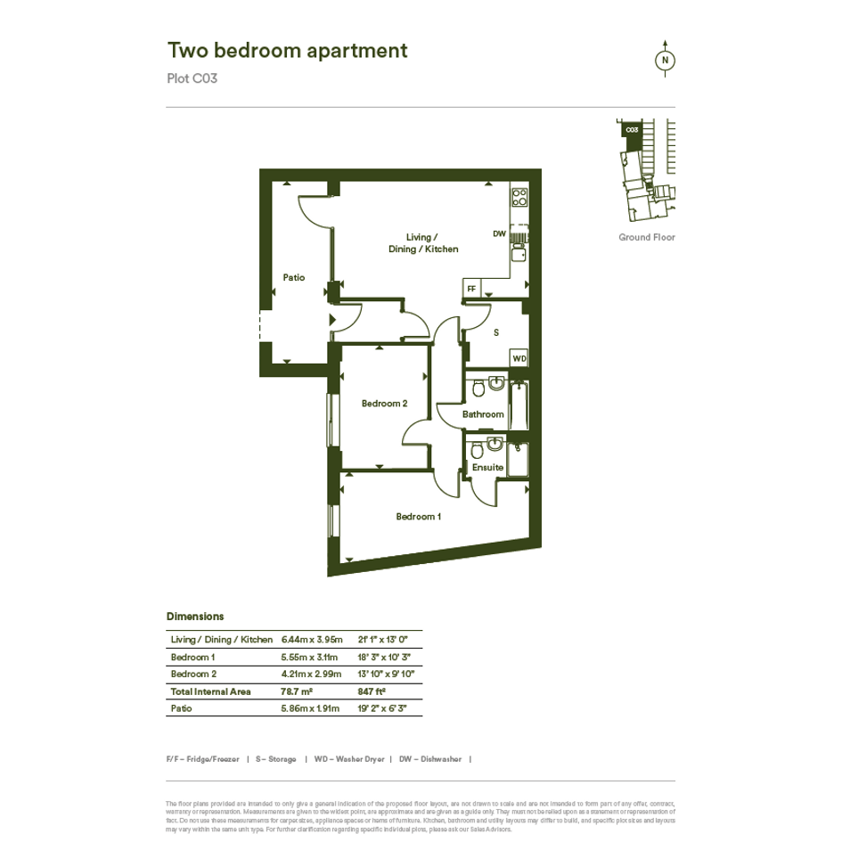 Plot C03 is a modern 2-bedroom ground floor apartment which offers a spacious open-plan living, dining, and kitchen area, seamlessly blending style and functionality. The contemporary kitchen boasts integrated appliances fitted as standard.
