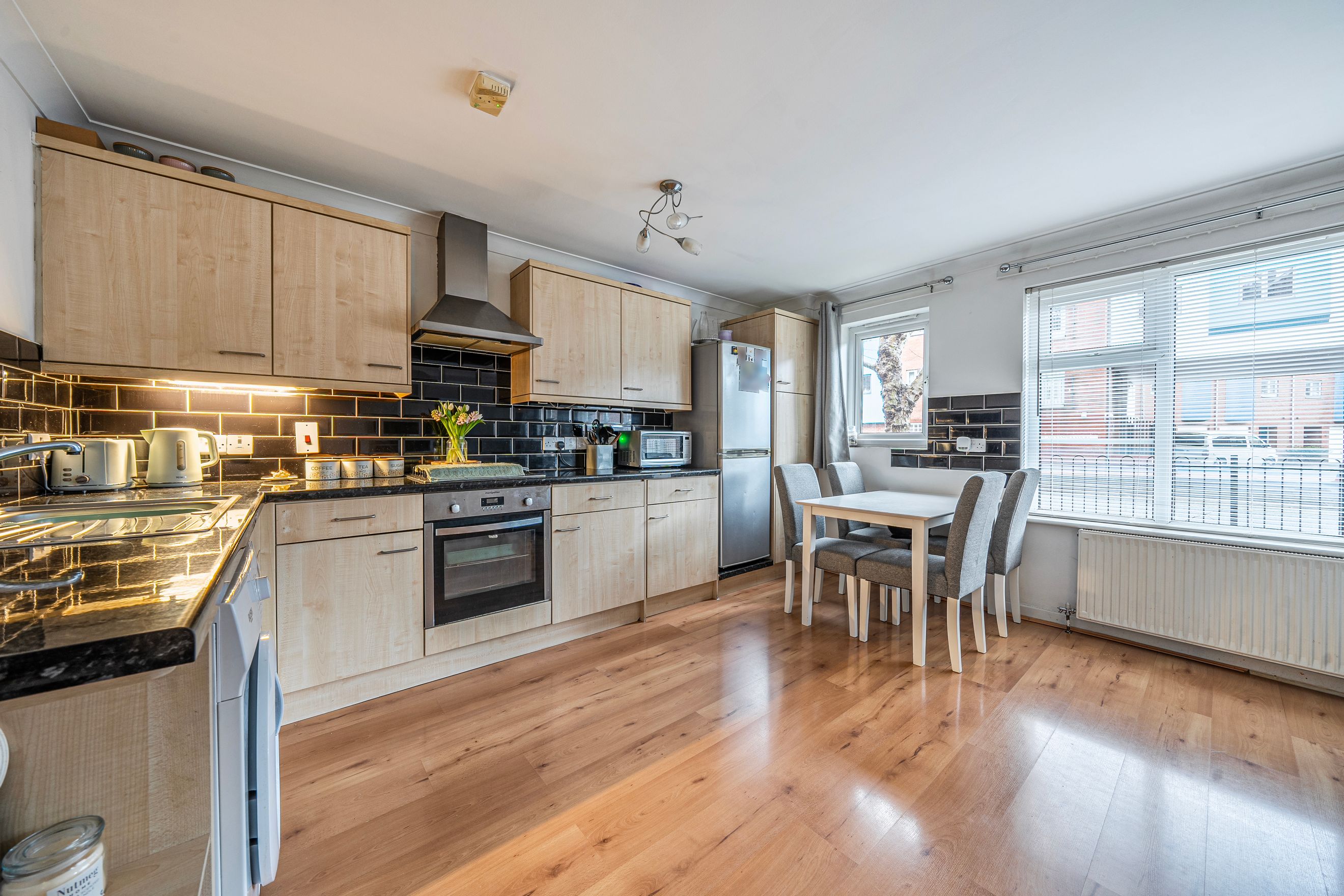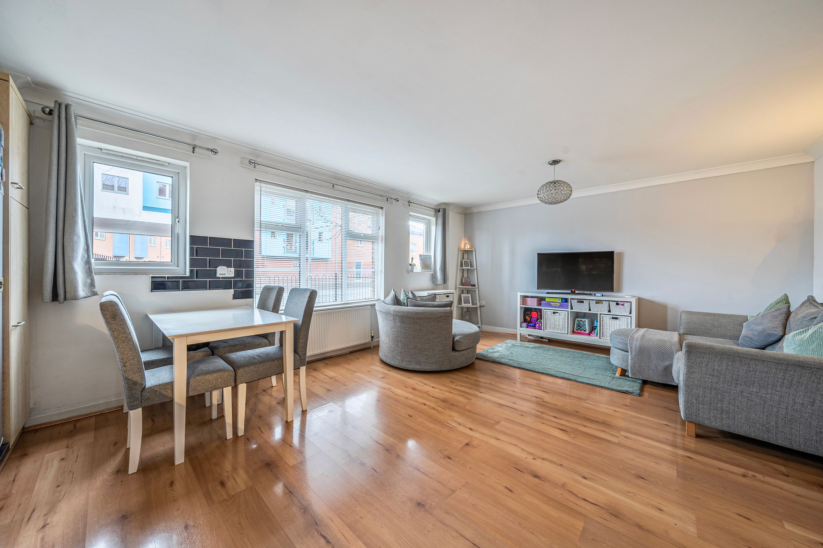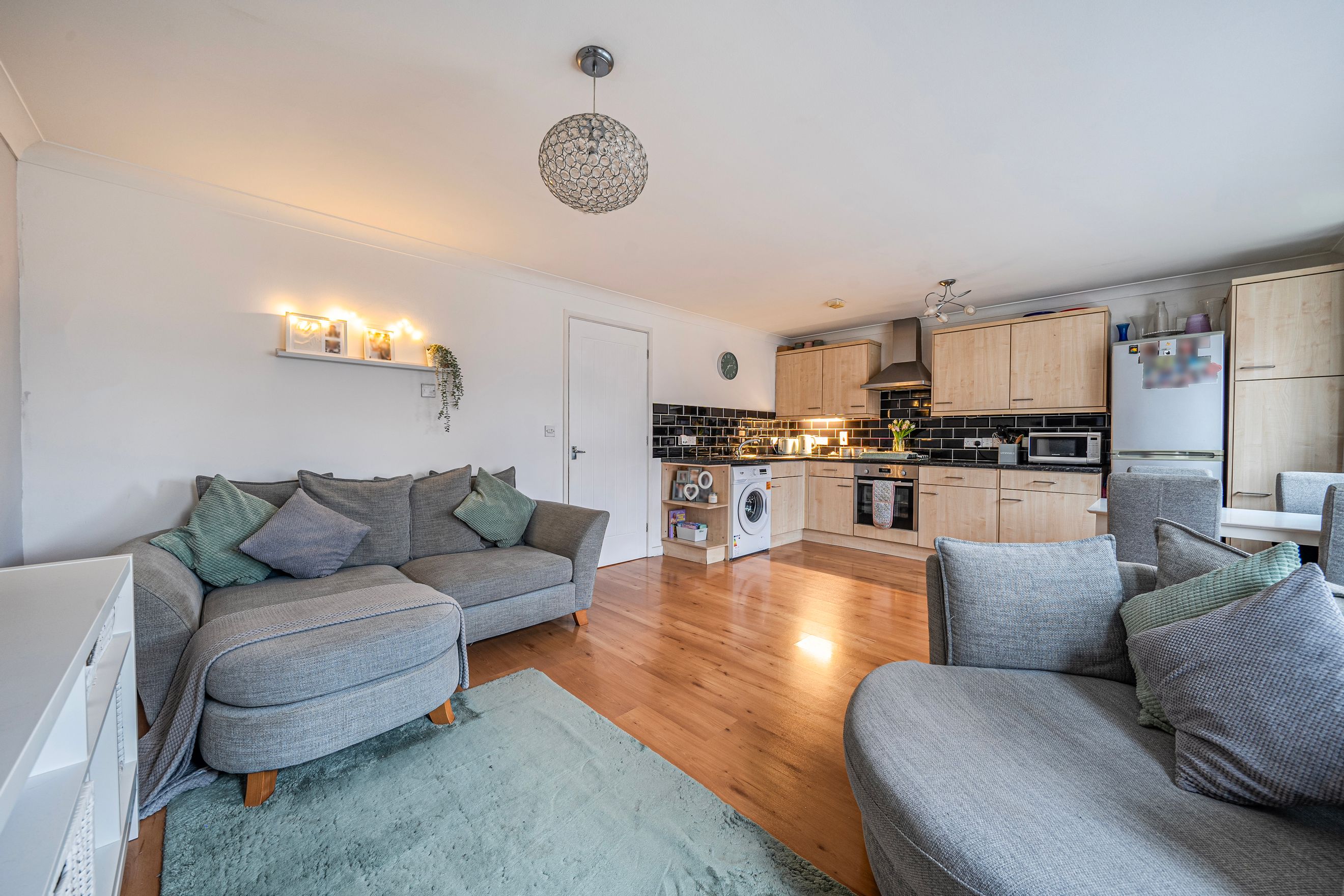 The property features two well-proportioned double bedrooms, a contemporary bathroom, and a generous open-plan kitchen and living area, filled with natural light.