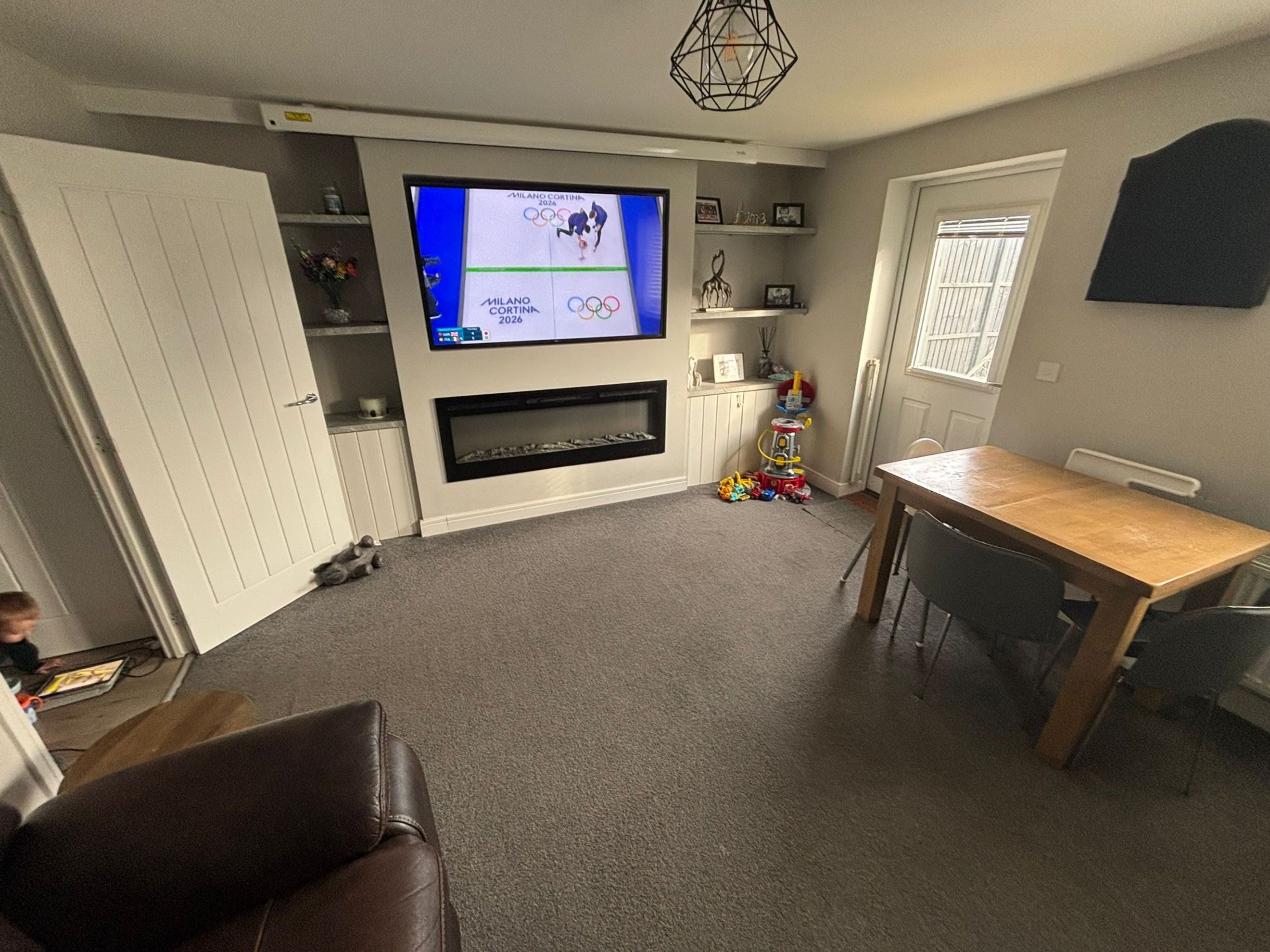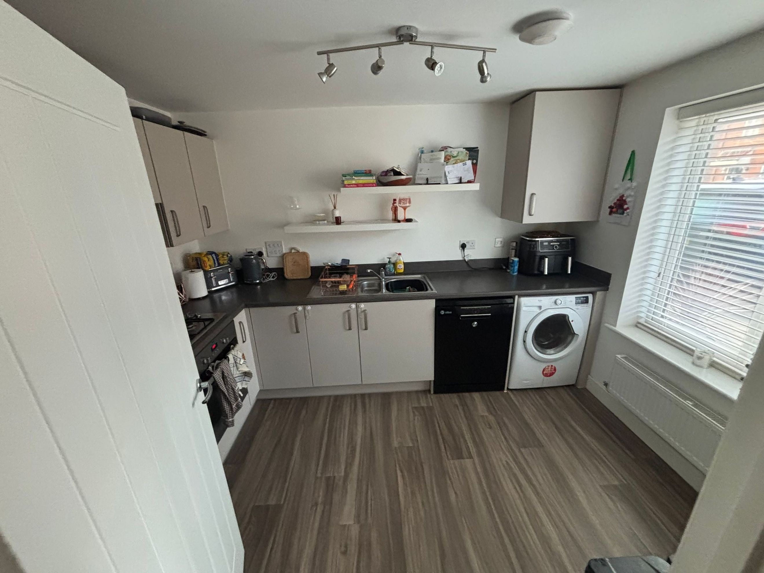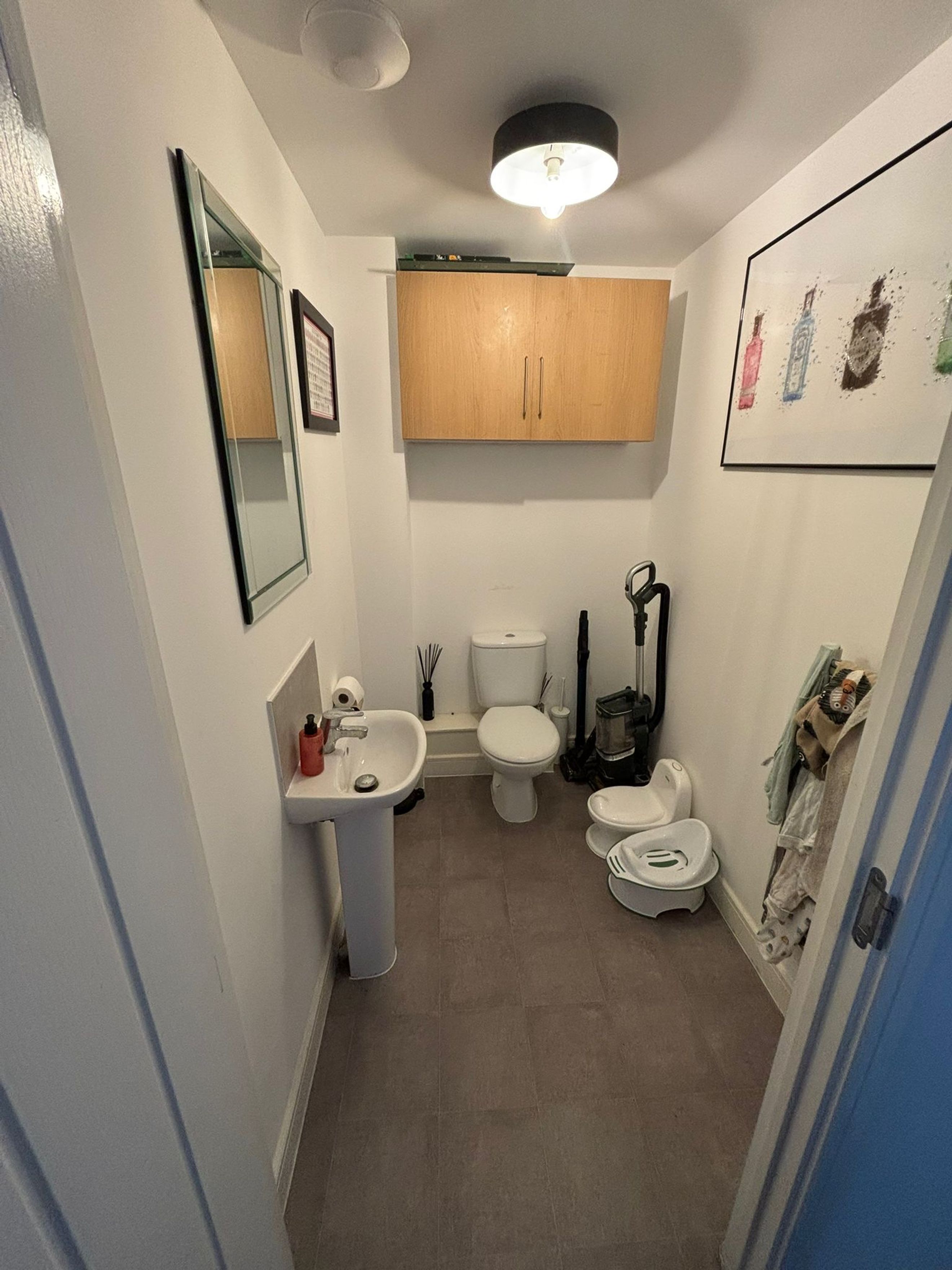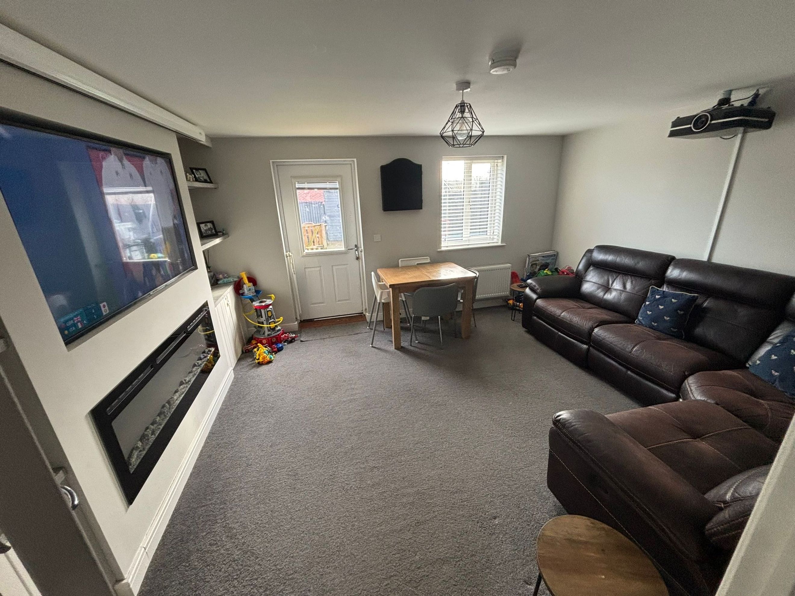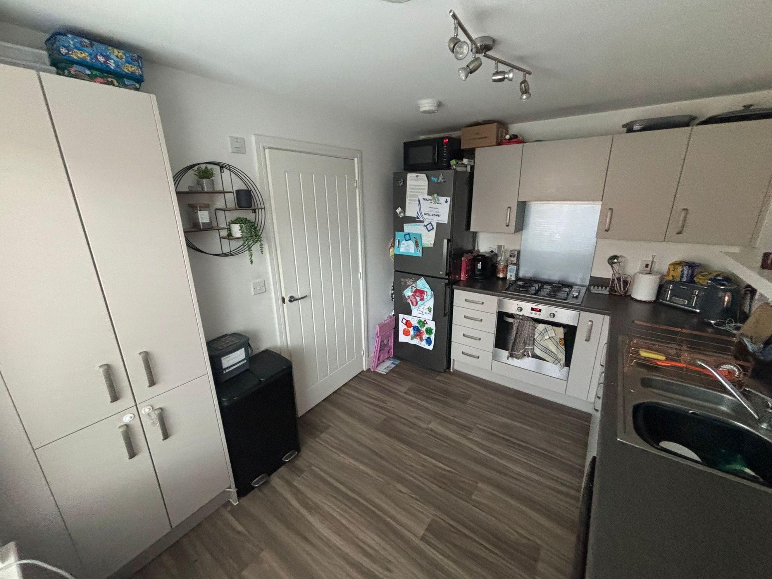 A separate kitchen, downstairs WC and multiple useful storage cupboards enhance day‑to‑day functionality. Upstairs, the master bedroom benefits from a built‑in wardrobe, with two further well‑proportioned bedrooms completing the layout. Driveway parking is available at the front of the property.