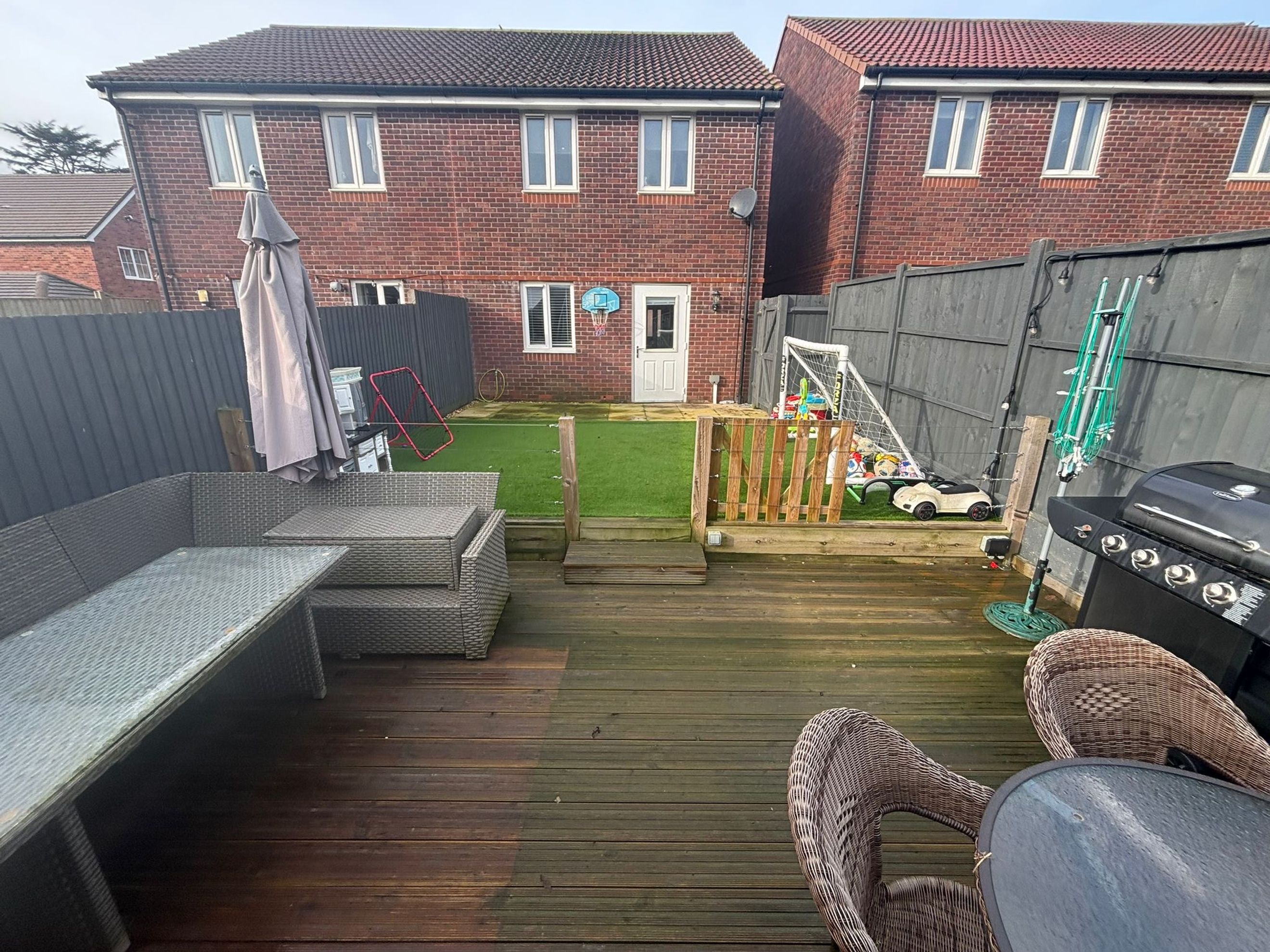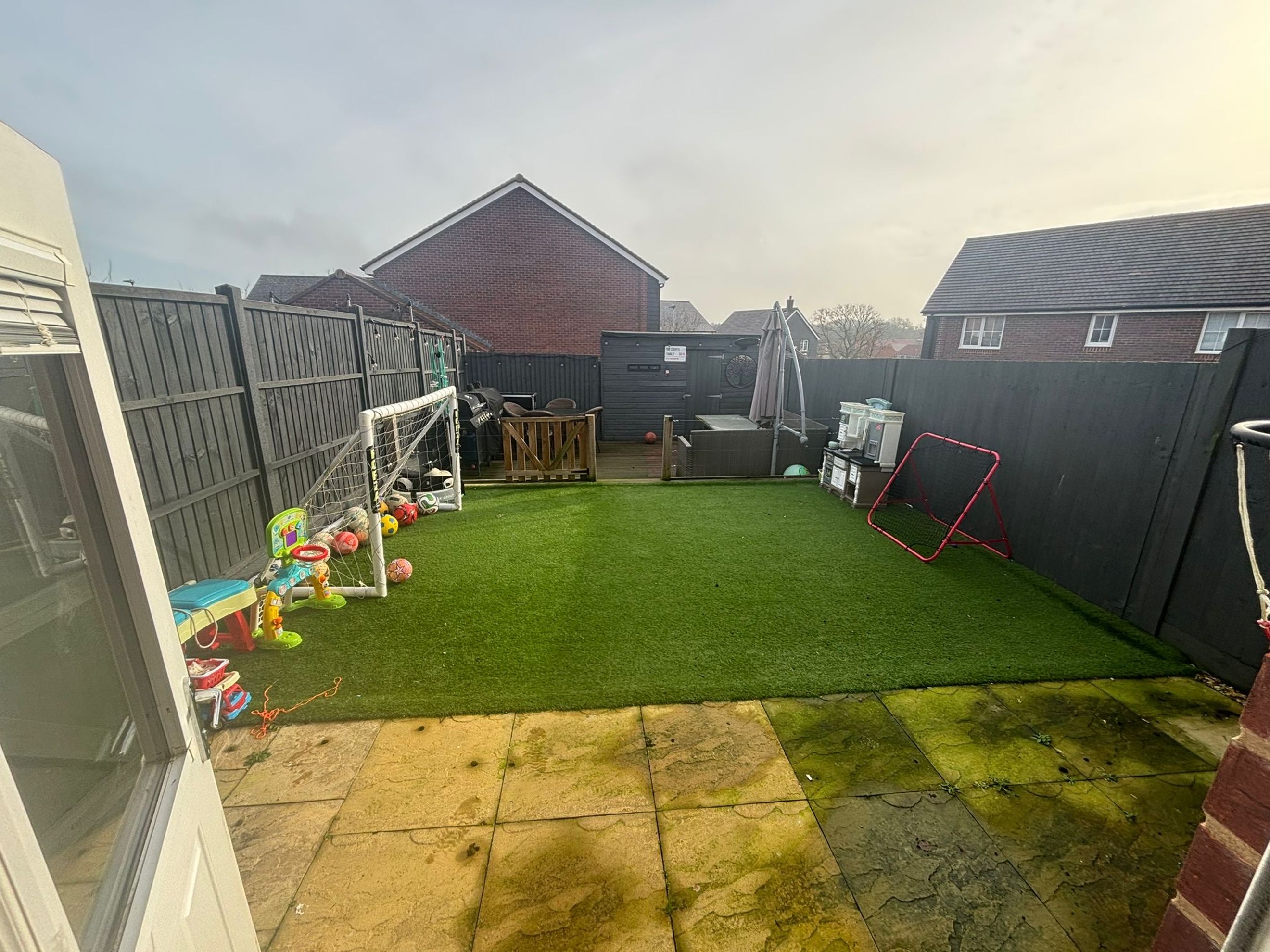 The ground floor includes a practical lounge/diner with patio doors opening onto a private enclosed garden, which features gated access, a shed and an outdoor tap.