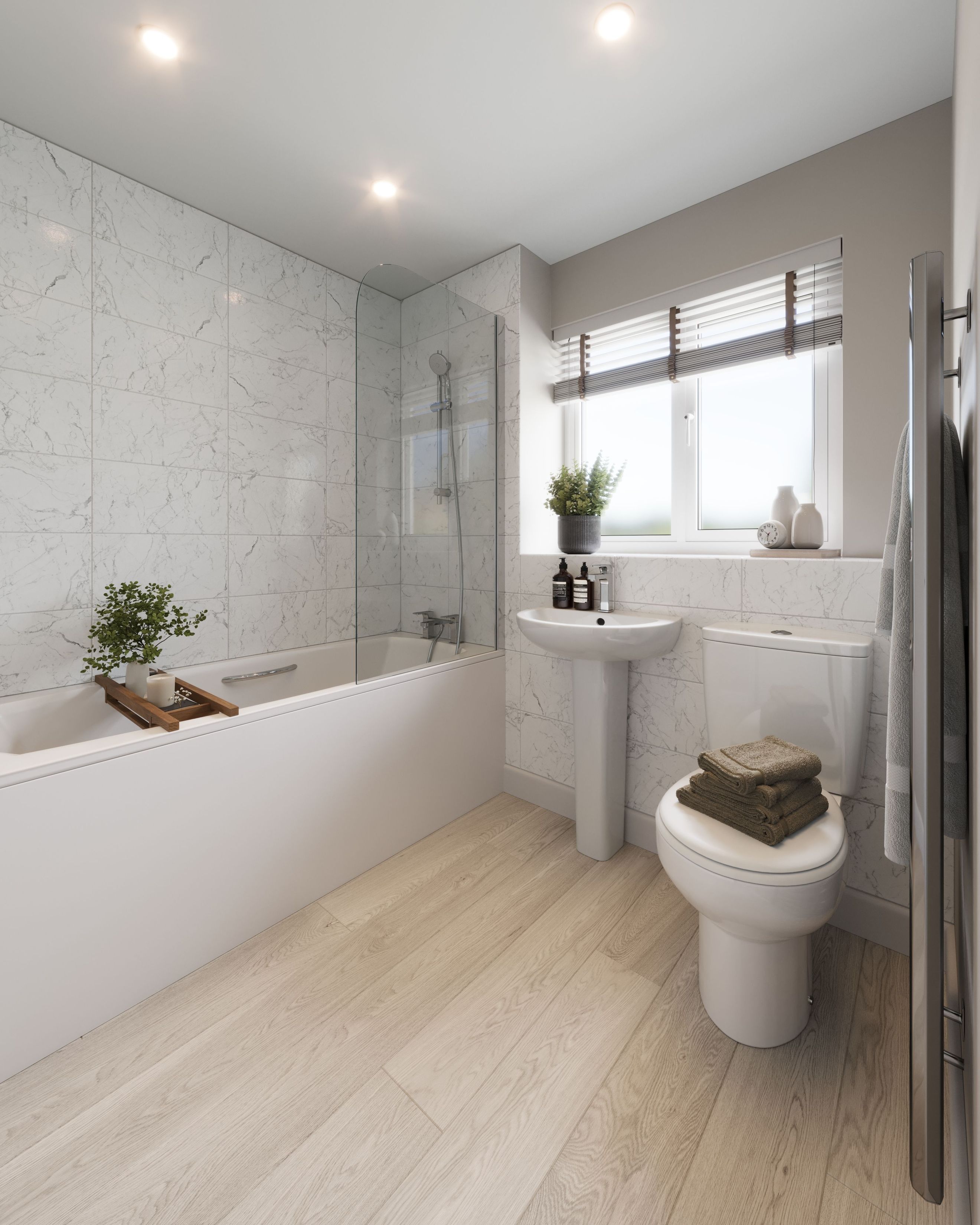 Upstairs, you’ll find a bright double bedroom with its own en‑suite, alongside a well‑proportioned single bedroom ideal for a child, guest, or home office. A contemporary family bathroom with an over‑bath shower, modern tiling, and stylish fittings completes the home’s well‑planned layout.