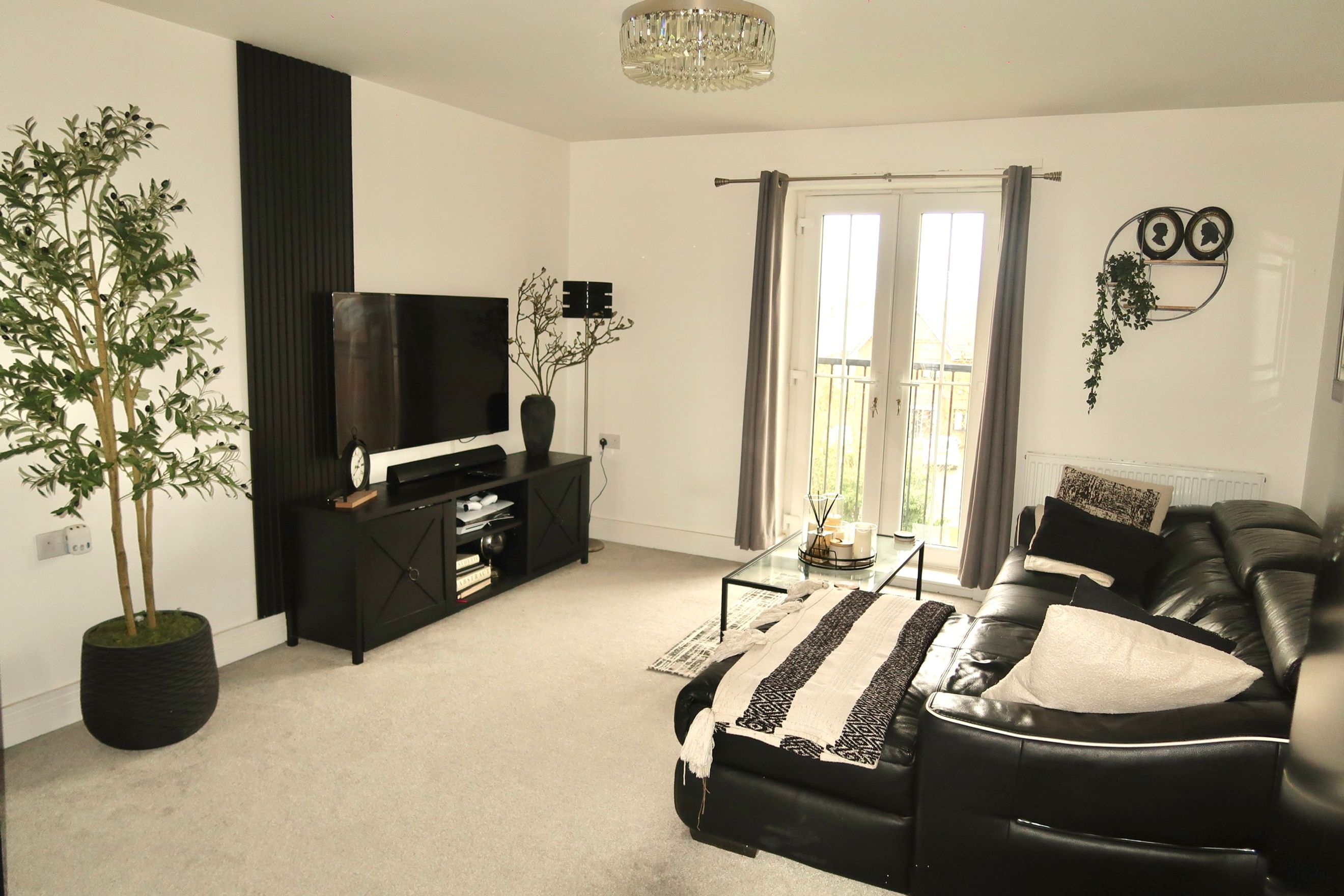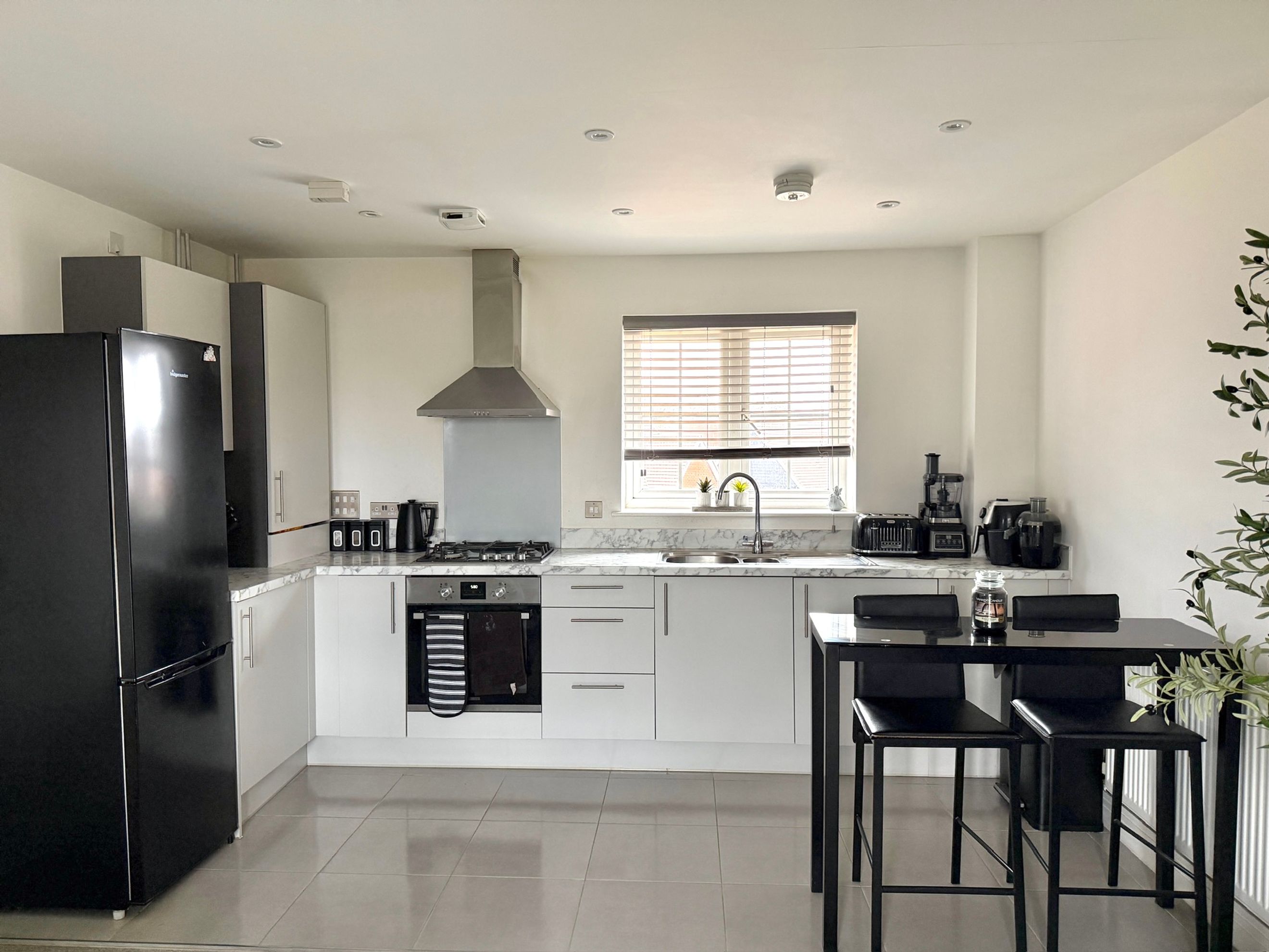 The property features an open‑plan kitchen and living area, complete with an integrated oven, hob and extractor fan, and benefits from a Juliette balcony that brings in plenty of natural light.
