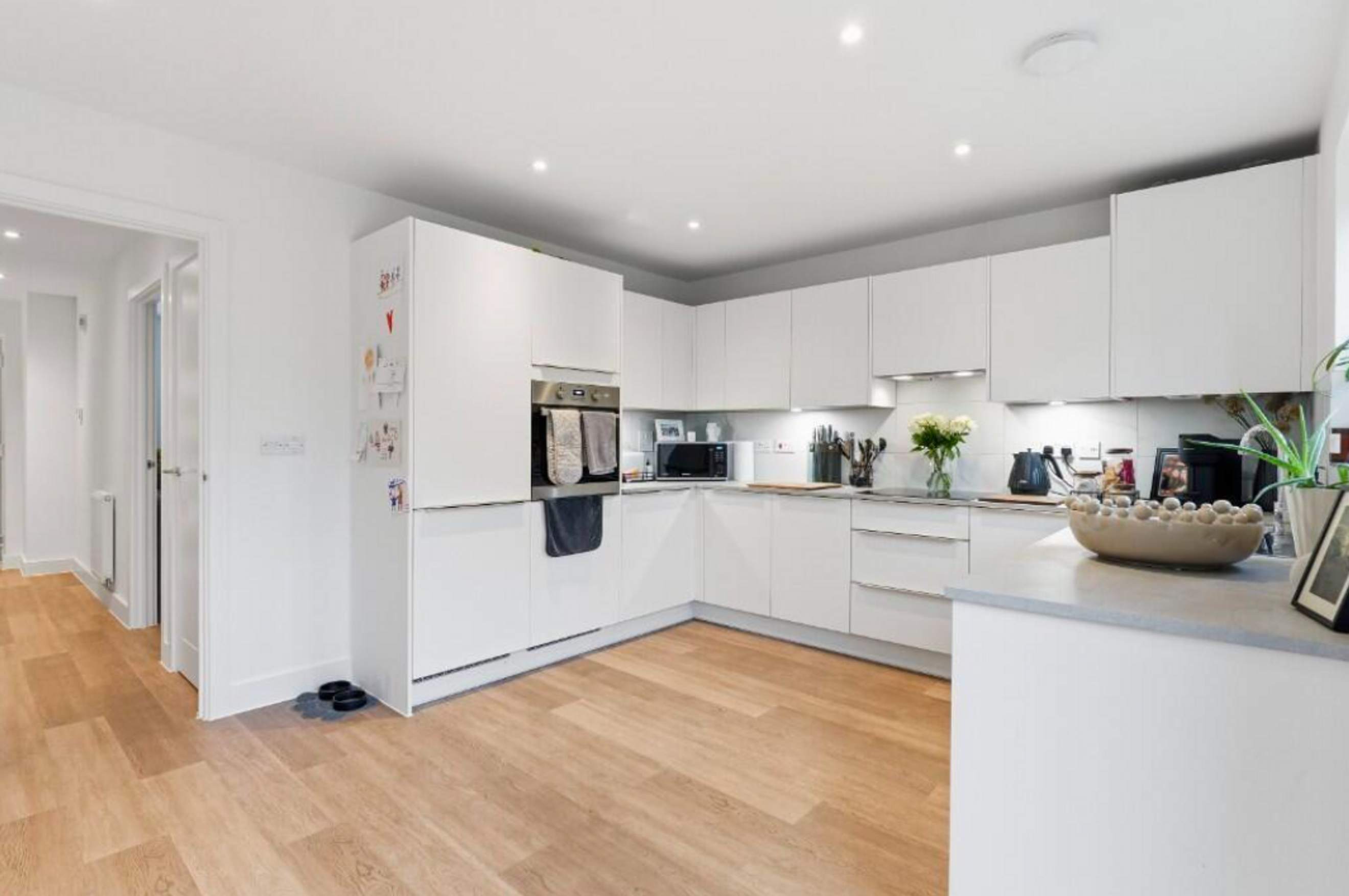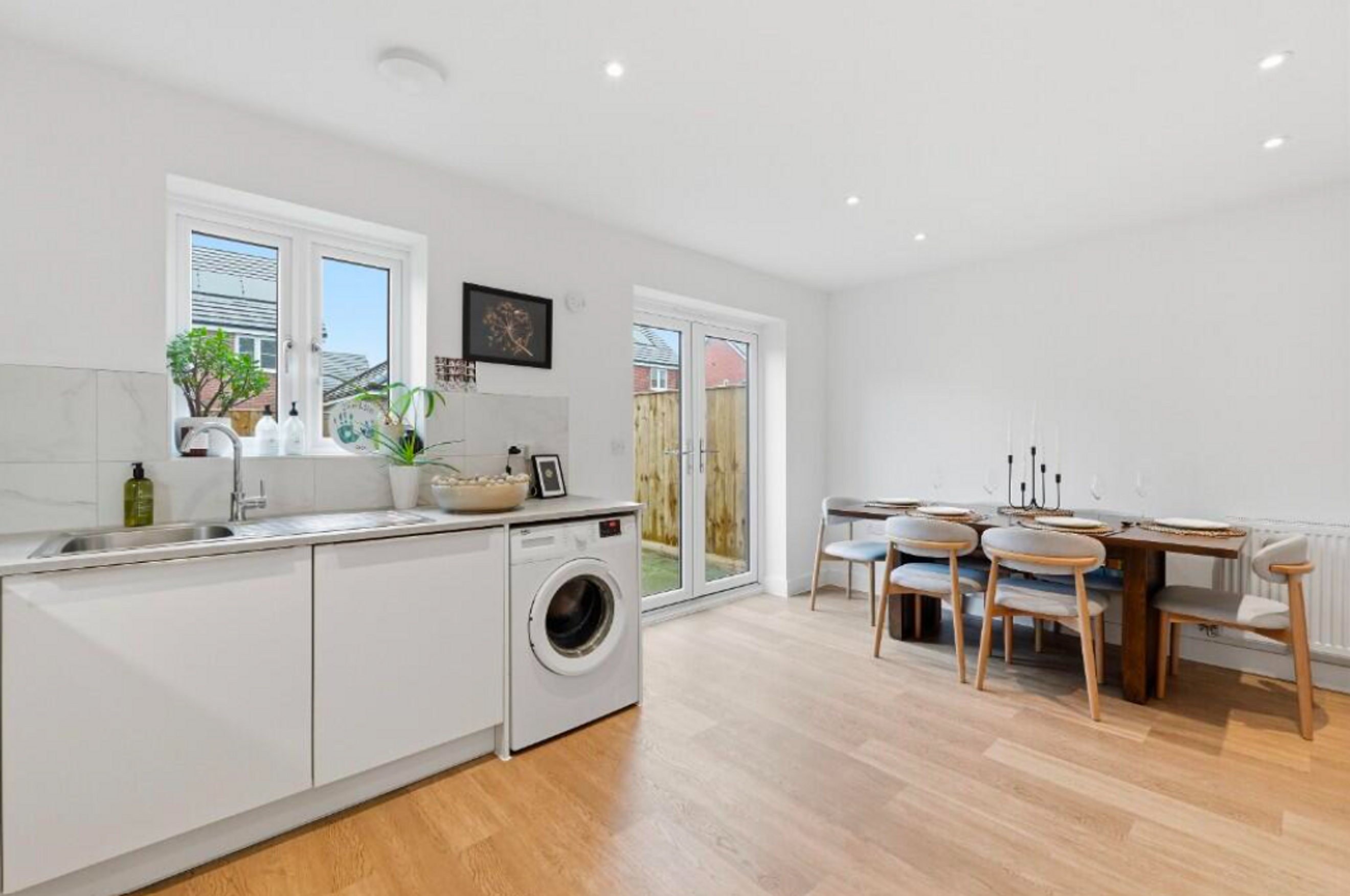 Kitchen/Dining Room - 11'4" x 16'4" (3.46m x 5.00m) - Window to rear aspect and French doors into the garden. Matching wall and base units with work surfaces over. Stainless steel sink and drainer and plumbing for washing machine. Built in fridge/freezer and dishwasher, induction hob, electric oven and cooker hood over. Amtico flooring and spotlights.