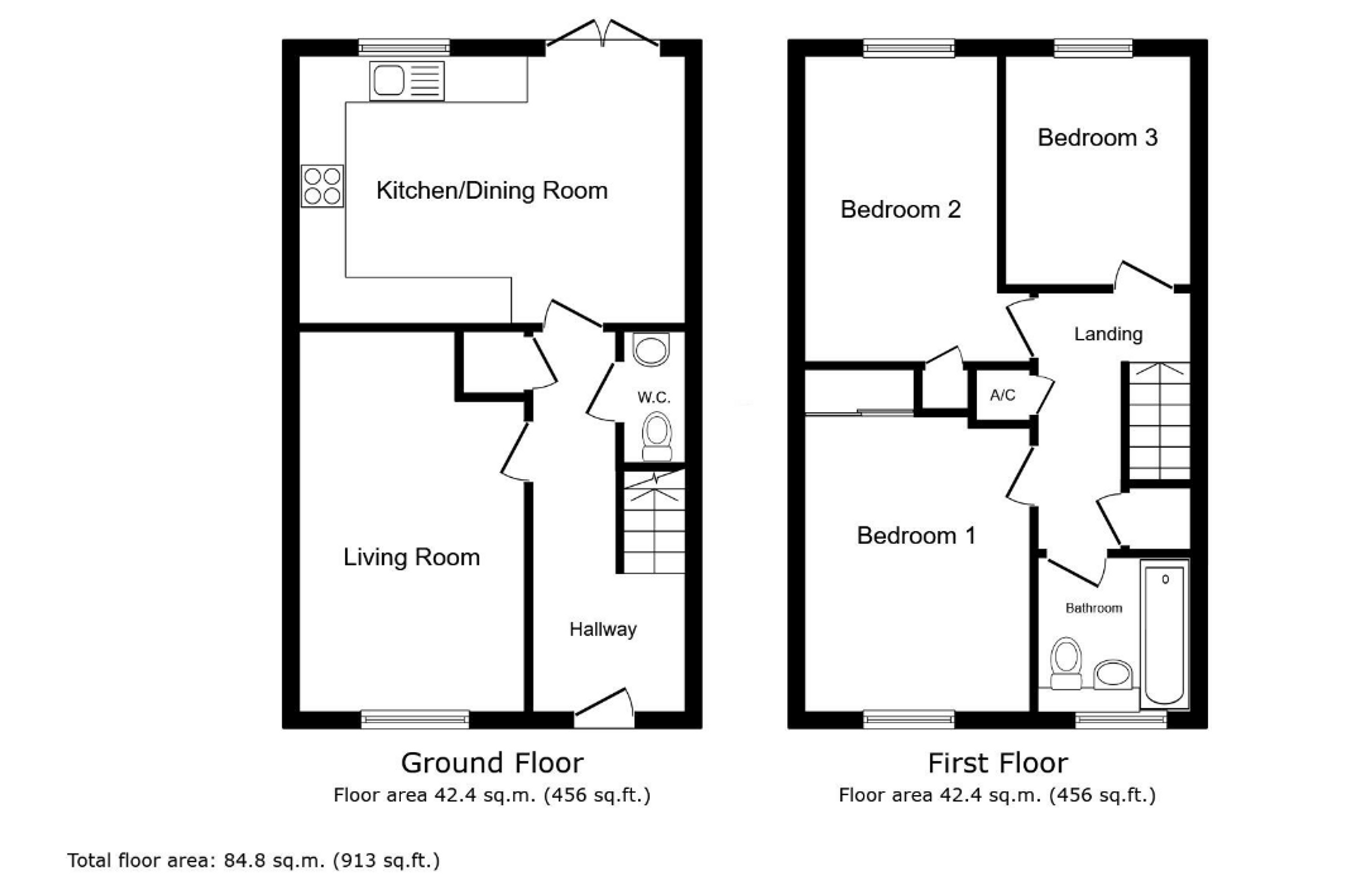 First Floor: Three Bedrooms, Bathroom with WC.