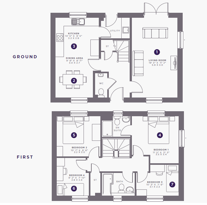 On the ground floor, a bright and spacious living room sits to the front of the property, providing a welcoming space to relax and unwind. To the rear, the open-plan kitchen and dining area creates the heart of the home - ideal for everyday family life and entertaining alike. With direct access to the garden, this sociable space is perfect for bringing everyone together. A separate utility room adds practical convenience, while a downstairs WC and additional storage complete the ground floor.