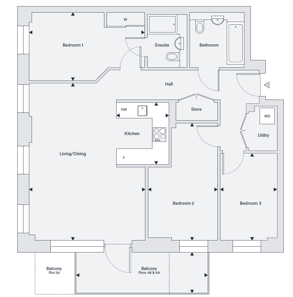3 bedroom, 2 bathrooms, 7th floor apartment offering 87.1 sq.m of internal floor area with outdoor space. Comprising 3 double bedrooms with an en-suite and fitted wardrobe to bedroom 1. Floor to ceiling windows throughout, allowing in plenty of natural light. Ample storage available.
