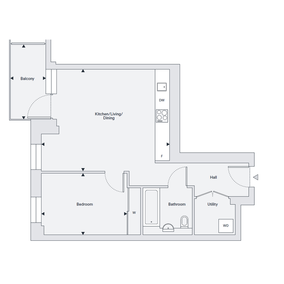1 bedroom, 1 bathroom, 8th floor apartment offering 50.6 sq.m of internal floor area with outdoor space. Boasting an open-plan kitchen/living/dining area with double aspect windows and Bosch integrated appliances, alongside a double bedroom with a fitted wardrobe.