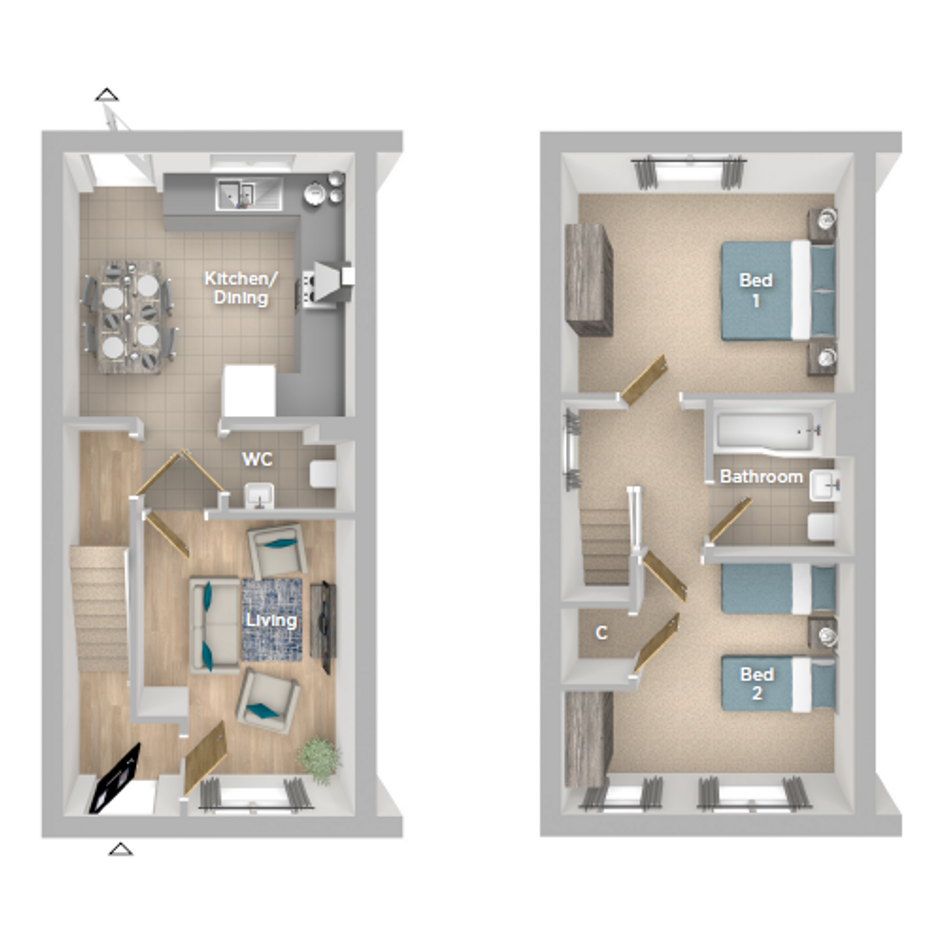 The Shermont is a two bedroom home available now with Shared Ownership. Upon entering the ground floor, there is an entrance hall which leads through to the living room. To the rear of the property, is the kitchen/dining room, downstairs WC and a storage cupboard.