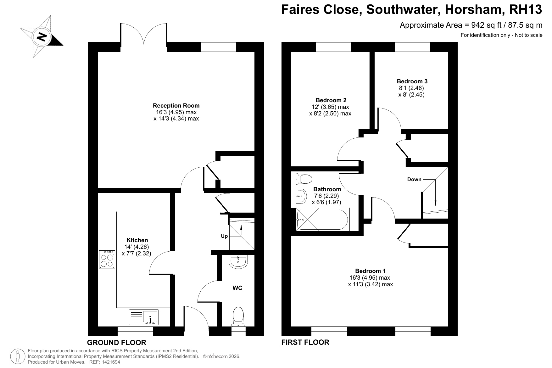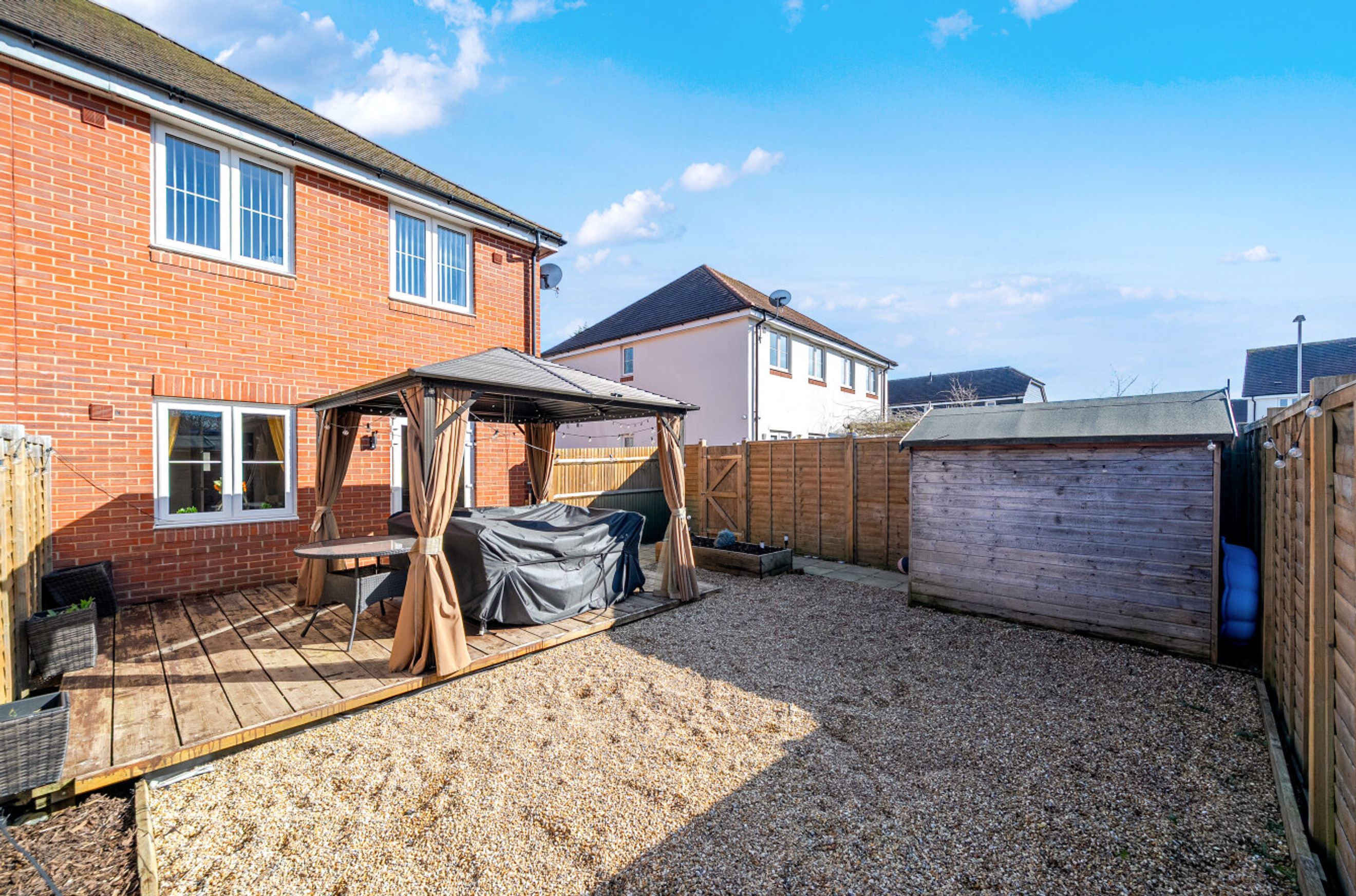 A modern, end-of-terrace house in the village of Southwater. The smartly-presented property has a ground-floor cloakroom/WC and a spacious kitchen at the front, while at the rear is a reception/dining room with attractive herringbone-style flooring. Patio doors open onto a west/south-west-facing garden with decked seating area. The garden can also be accessed via a side gate. On the first floor of the house is a full-width main bedroom with wood panelling plus two further bedrooms and a bathroom with decorative pencil-mosaic tiles. Well insulated walls, roof and floor, high performance glazing and gas central heating all contribute towards a very good energy-efficiency rating. The property comes with a two-car driveway and the nearby A24 offers an easy route north into London or south towards the coast. Horsham town centre is only a brief drive away and can also be reached via local bus. Southwater Country Park, which is just a short walk from Faires Close, offers green, open space, an extensive children's play area, lakes and even a paddling beach.