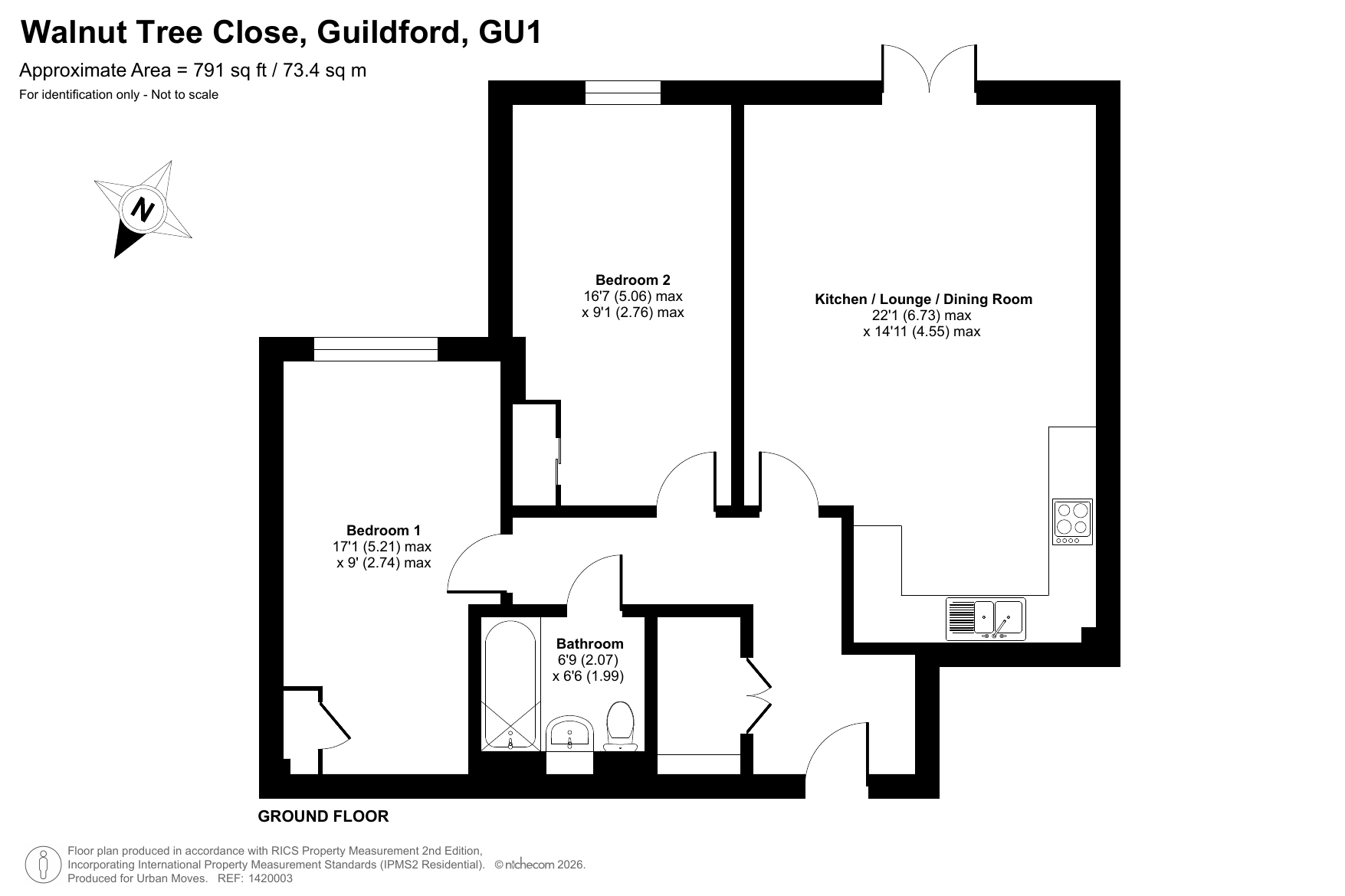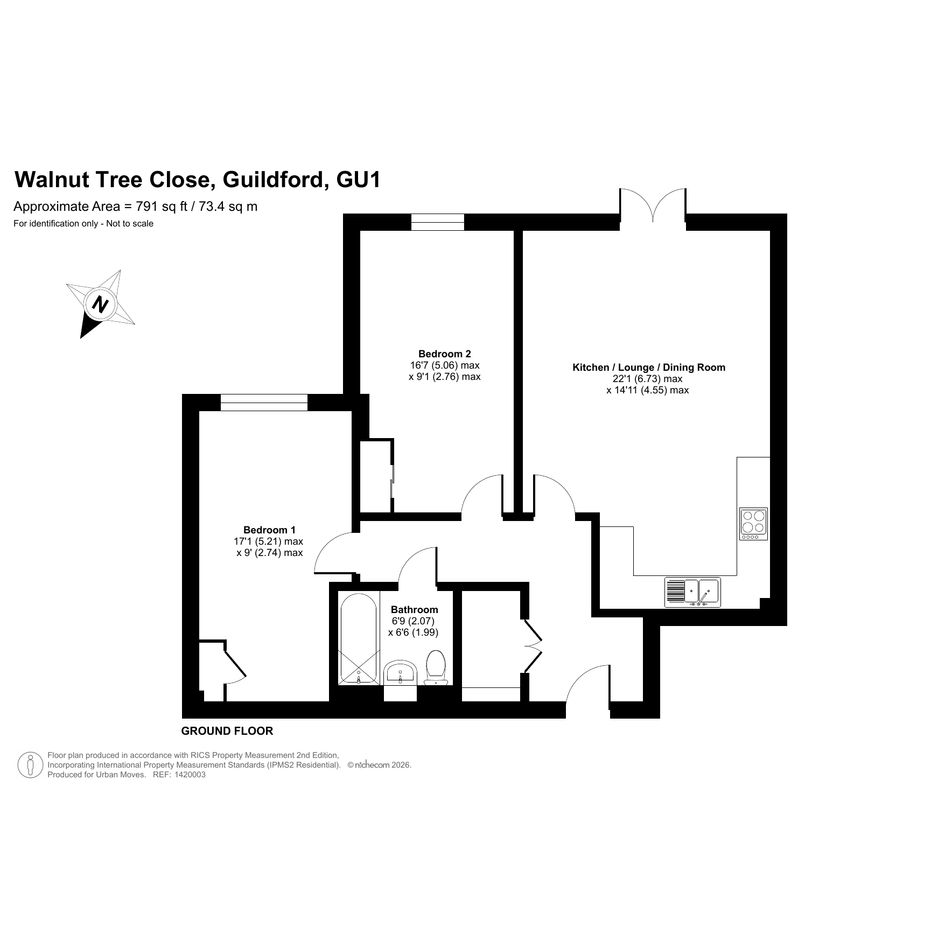 This smartly-presented flat is on the ground floor of a modern development alongside the verdant banks of the meandering River Wey. The property has a twenty-two-foot reception with attractive flooring and an open-plan kitchen area with sleek, handle-less units. Patio doors open onto a private, south-east-facing terrace. Both bedrooms are generously-sized doubles, there is a bathroom with stylish wall tiles and a large storage/utility cupboard has been provided in the entrance hall. Well insulated walls and floor, high performance glazing and gas central heating all contribute towards a very good energy-efficiency rating. The flat comes with an allocated, off-street parking space plus use of the communal cycle store, Guildford Railway Station is only a short walk away and the picturesque town centre is also within easy reach. The nearest primary school is Ofsted-rated 'Good' and the local secondary 'Outstanding'.