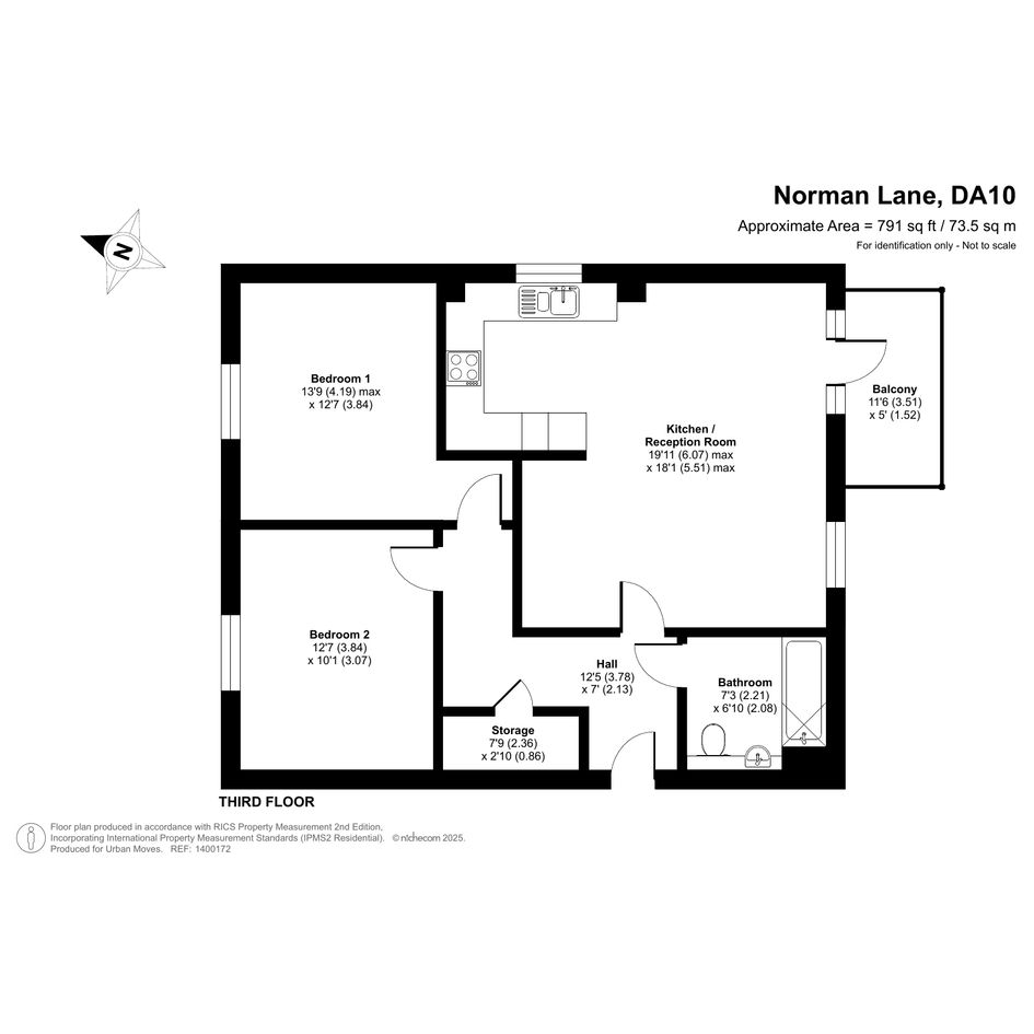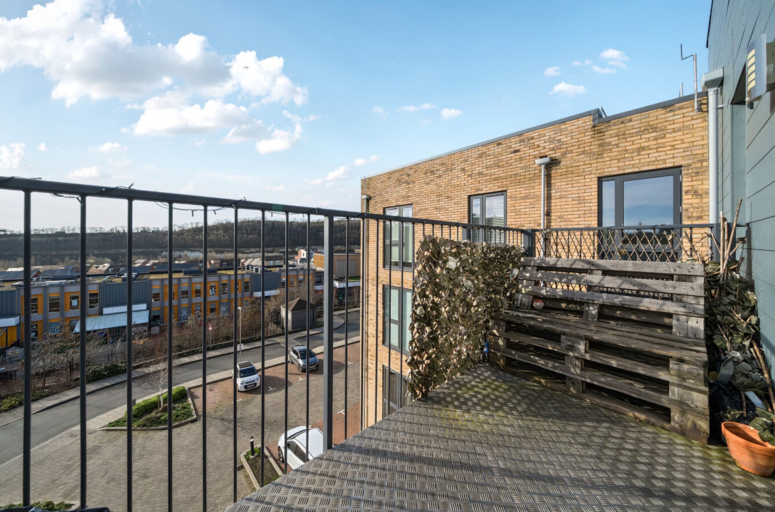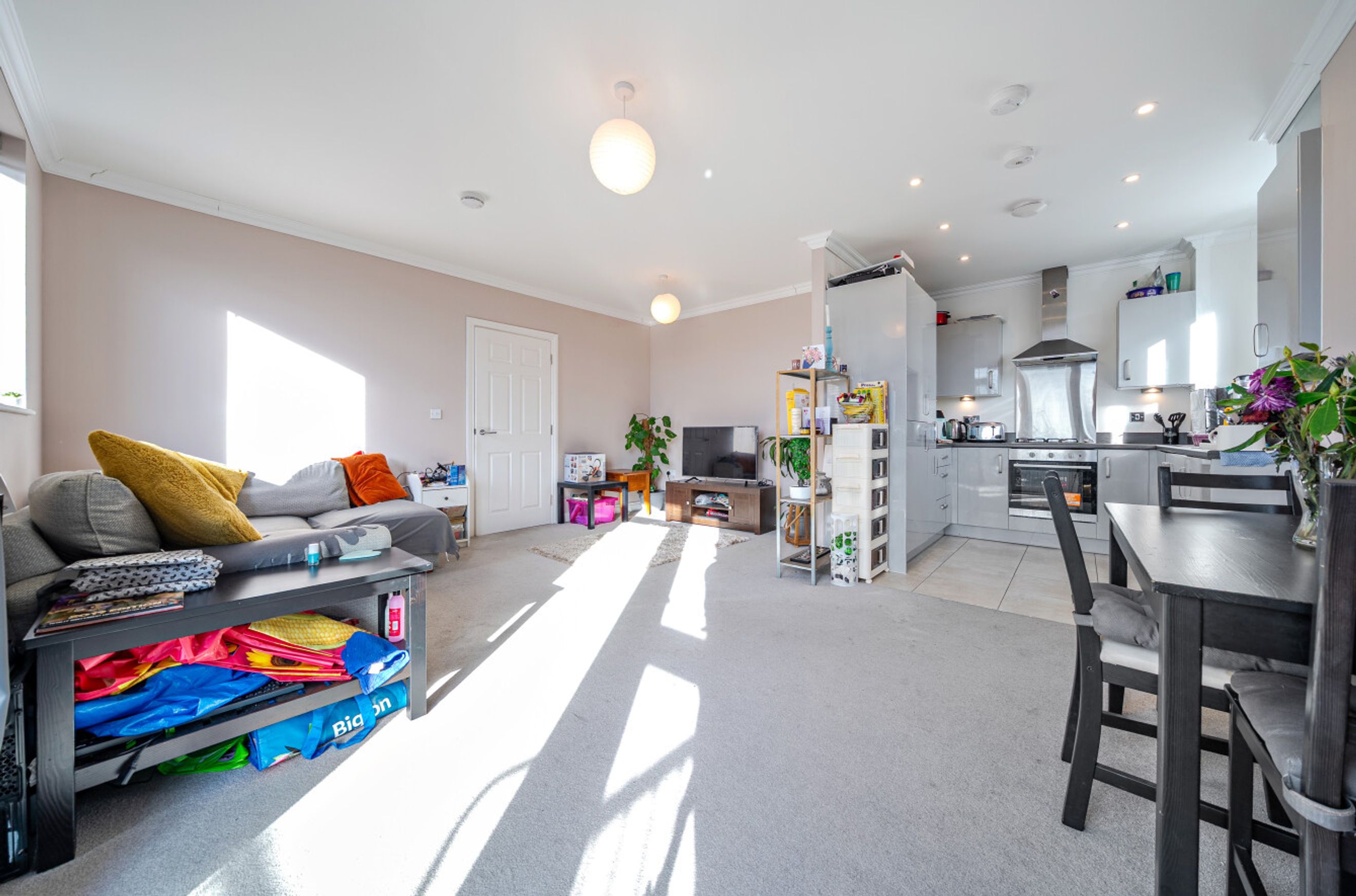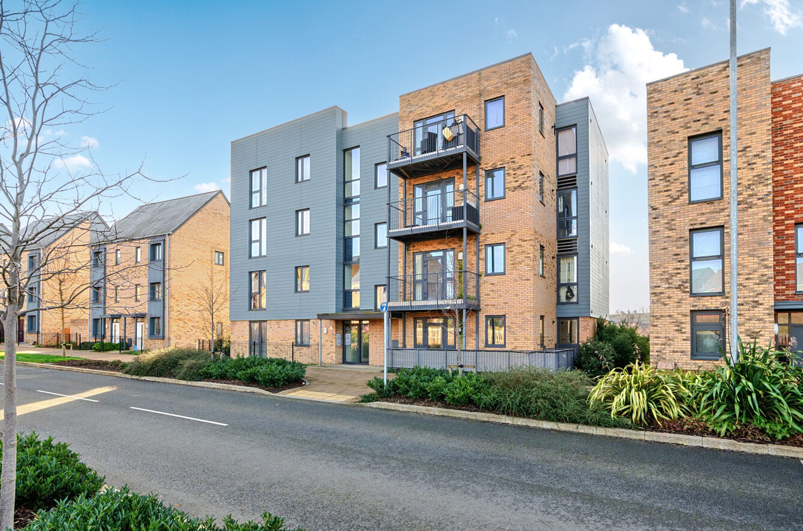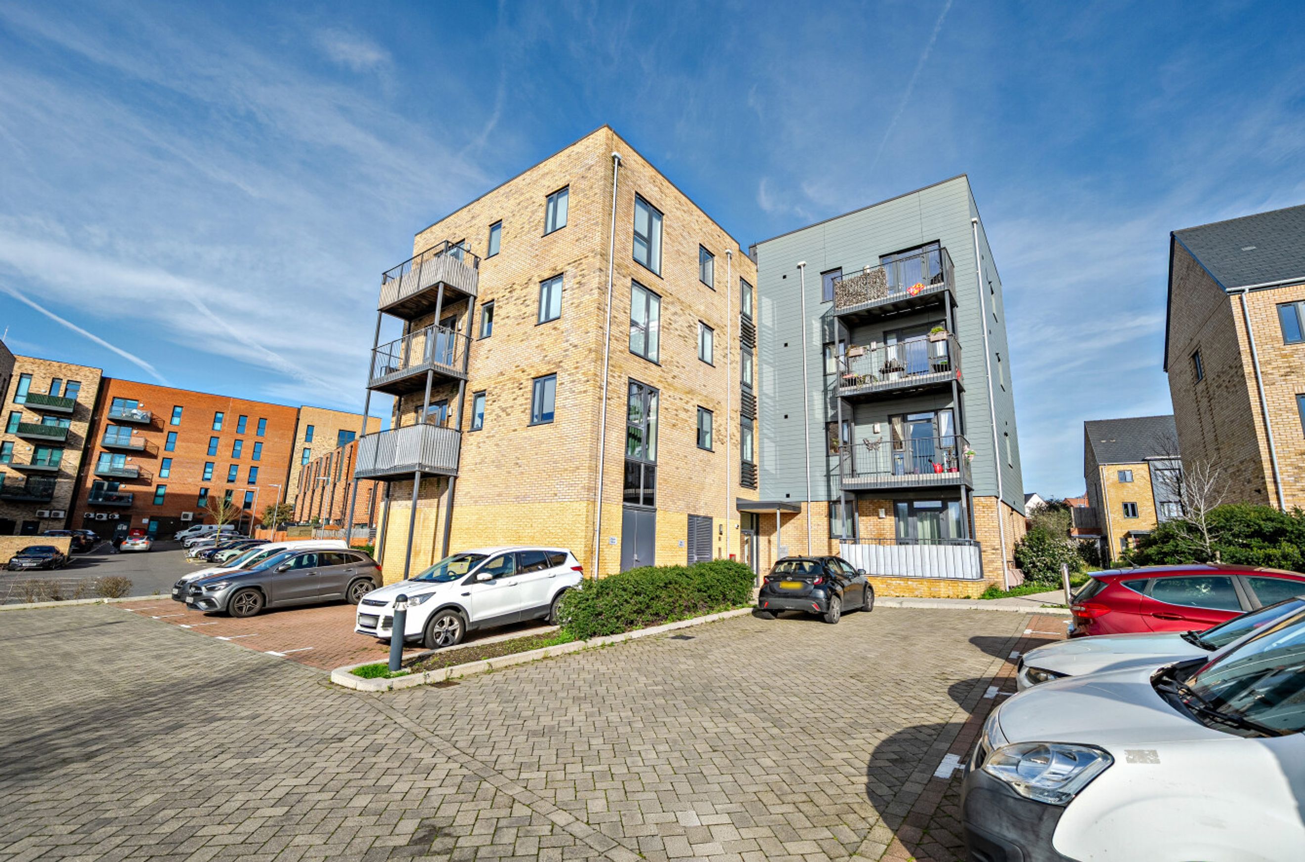 A well-proportioned flat on the top (third) floor of a recently-constructed building. The property has a spacious reception room with a semi-open-plan kitchen featuring sleek, grey units and integrated appliances. A glazed door leads from the living area out onto a south/south-east-facing balcony. The bedrooms are both generously-sized doubles and the bathroom is stylish and modern. A large, built-in storage/utility cupboard has been provided in the entrance hallway and the well insulated walls and roof, high performance glazing and gas central heating all contribute towards a very good energy-efficiency rating. The flat comes with use of a parking space and there are also shared visitor spaces for occasional use. Alternatively the Swanscombe and Ebbsfleet railway stations can both be reached via bus or by brief cycle ride. Nearby Cherry Orchard Primary School is Ofsted-rated 'Outstanding'.