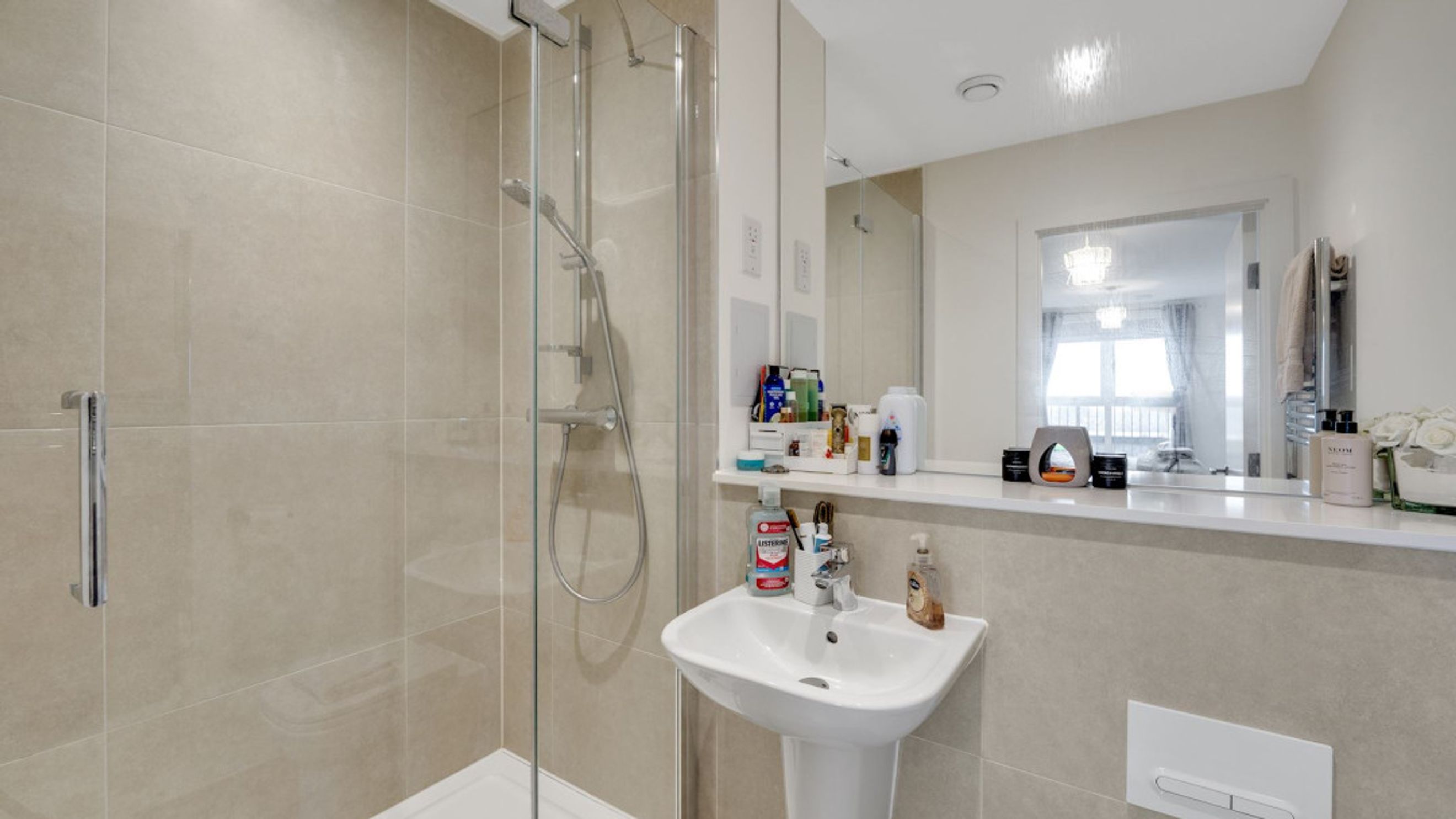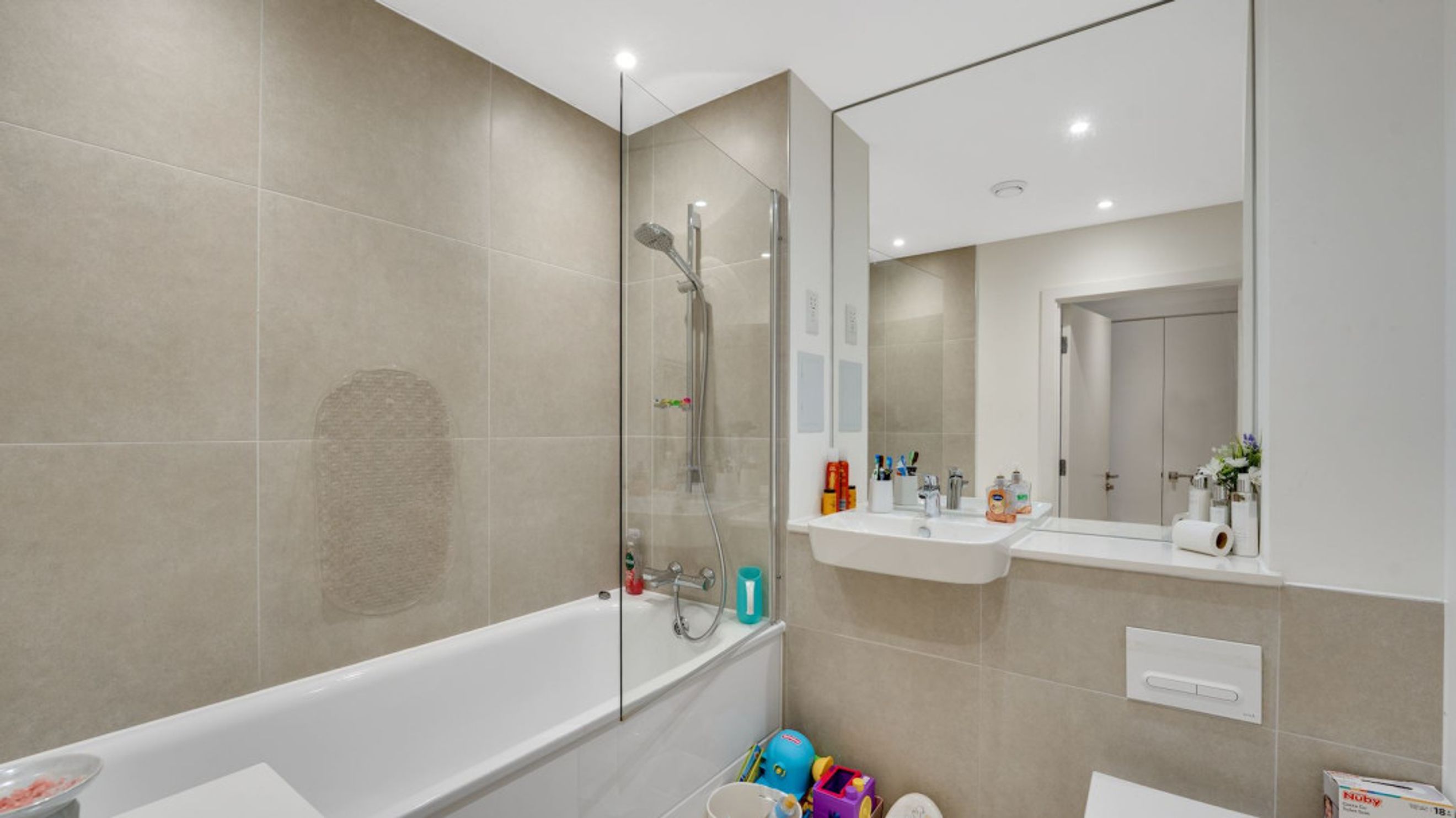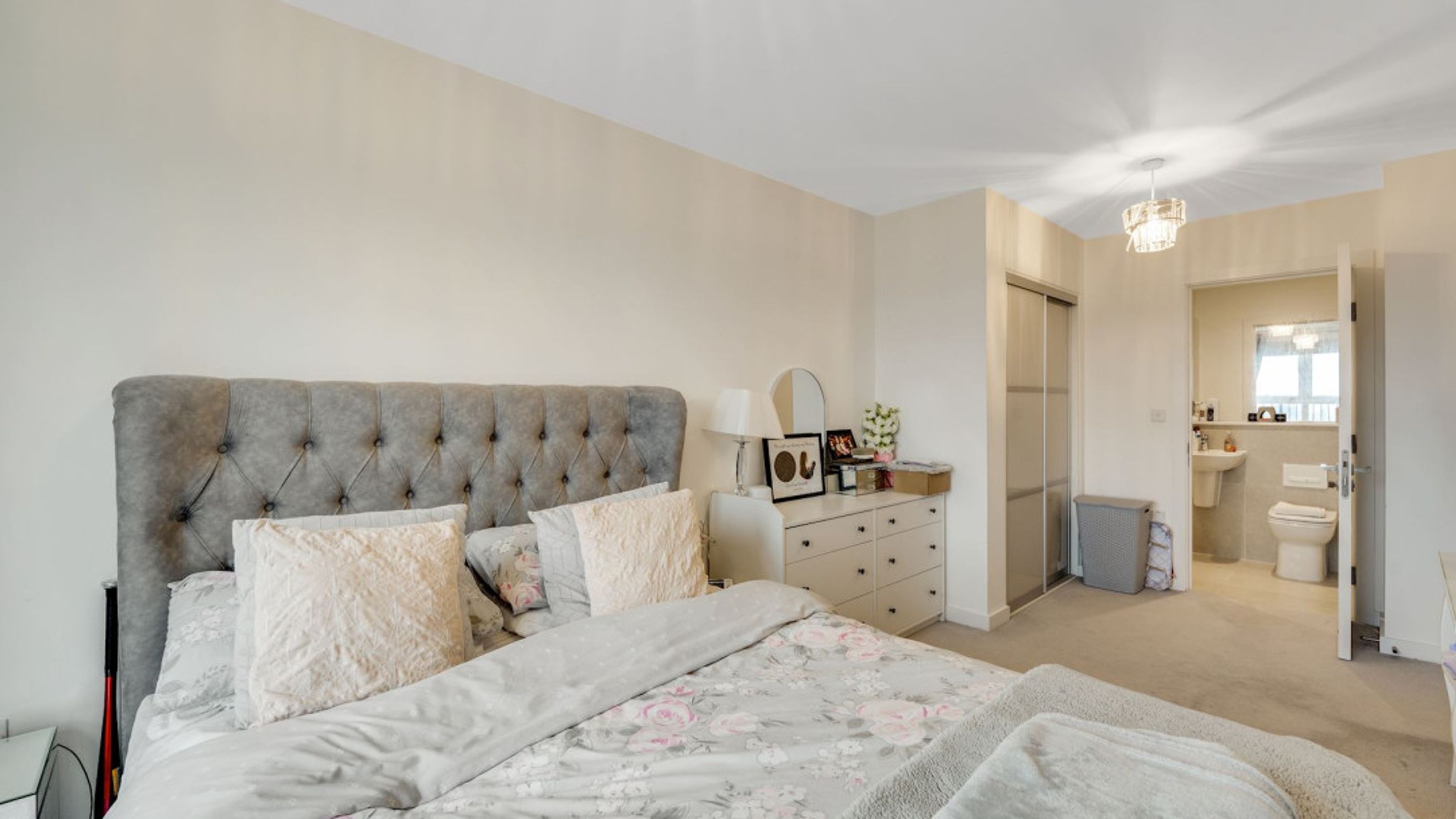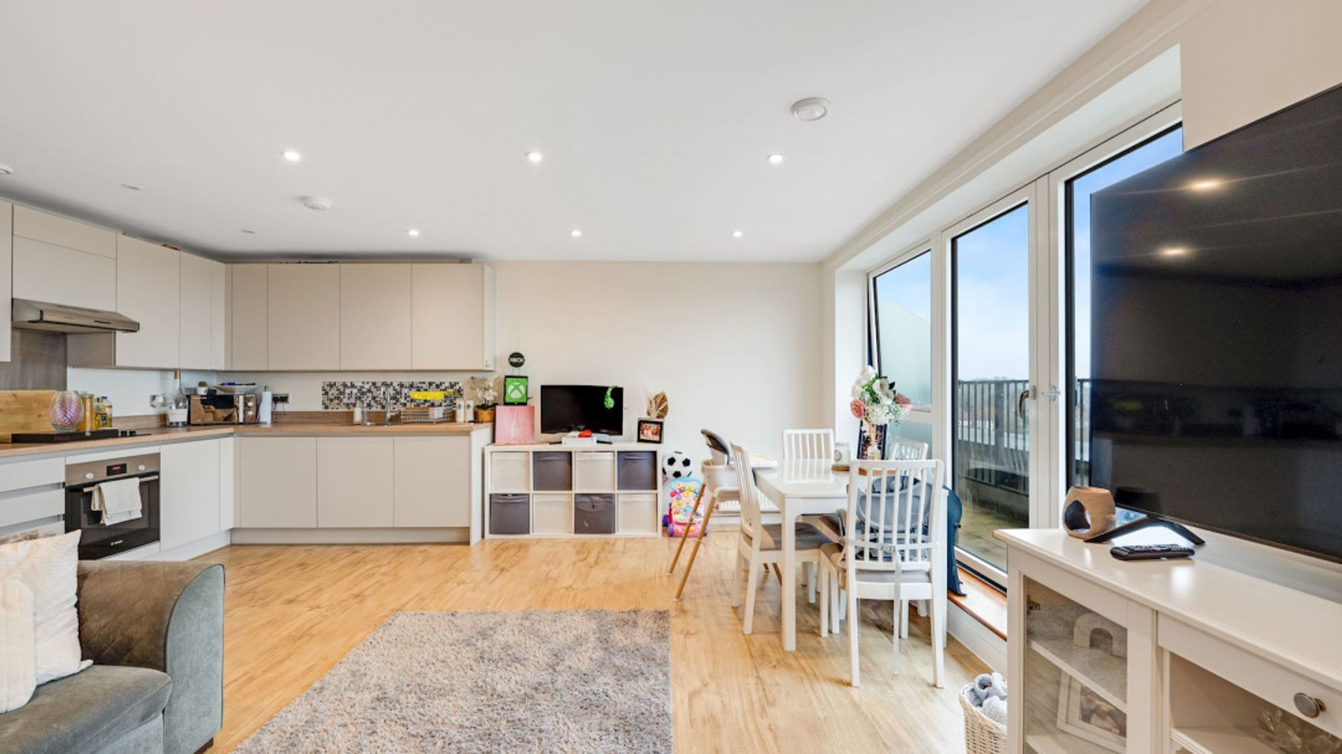 The property provides bright and well-proportioned accommodation throughout, comprising a spacious open-plan living and dining area, a modern fitted kitchen with a range of wall and base units, two generous double bedrooms, including a principal bedroom with en-suite shower room, and a contemporary family bathroom.