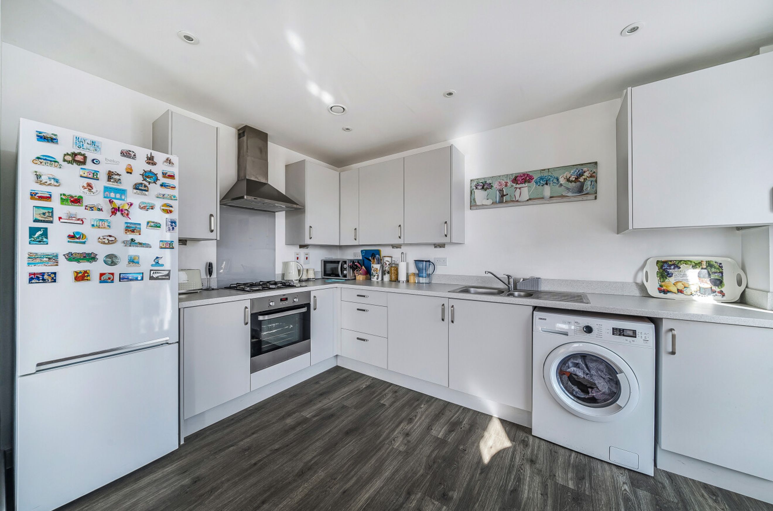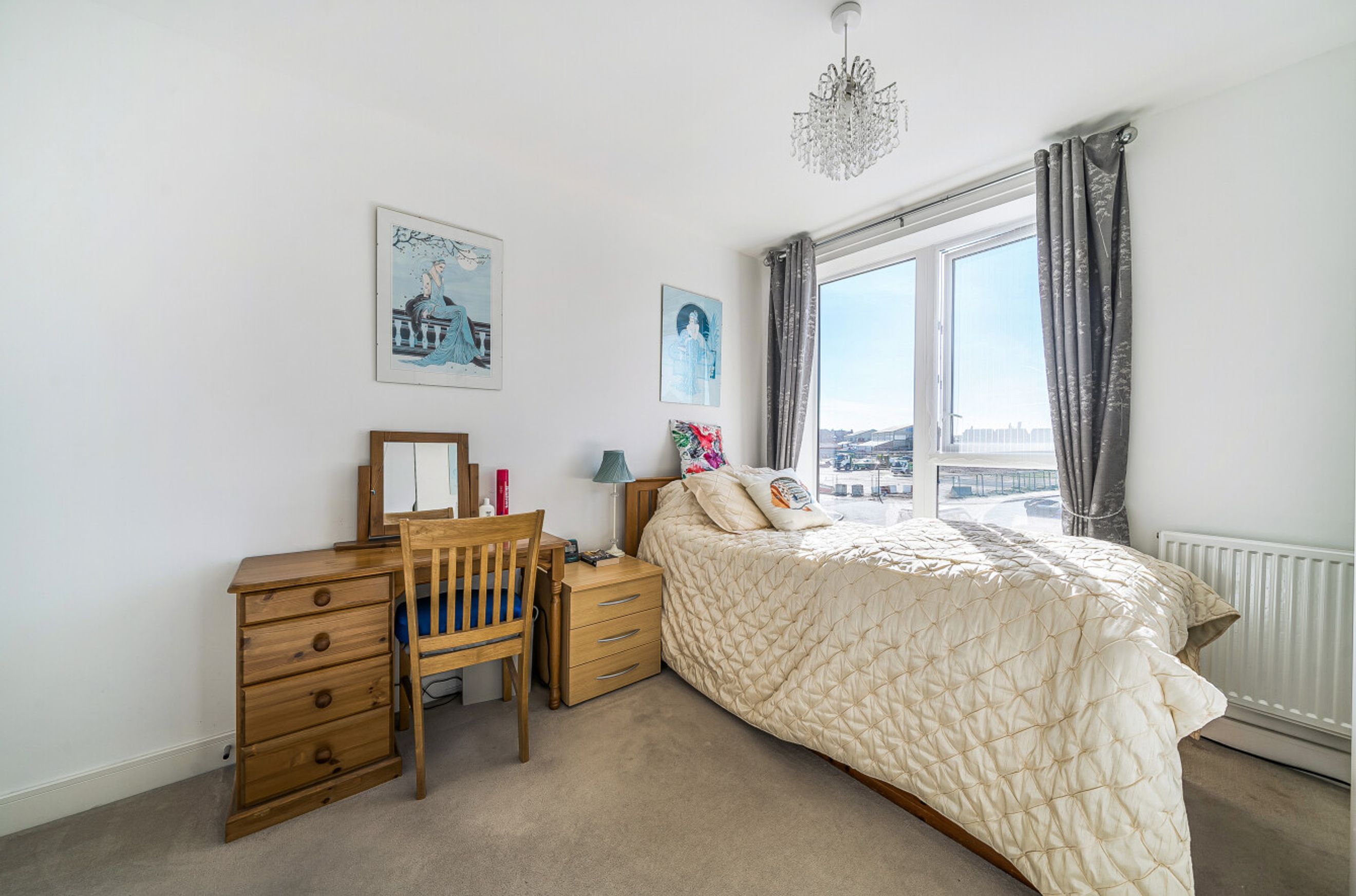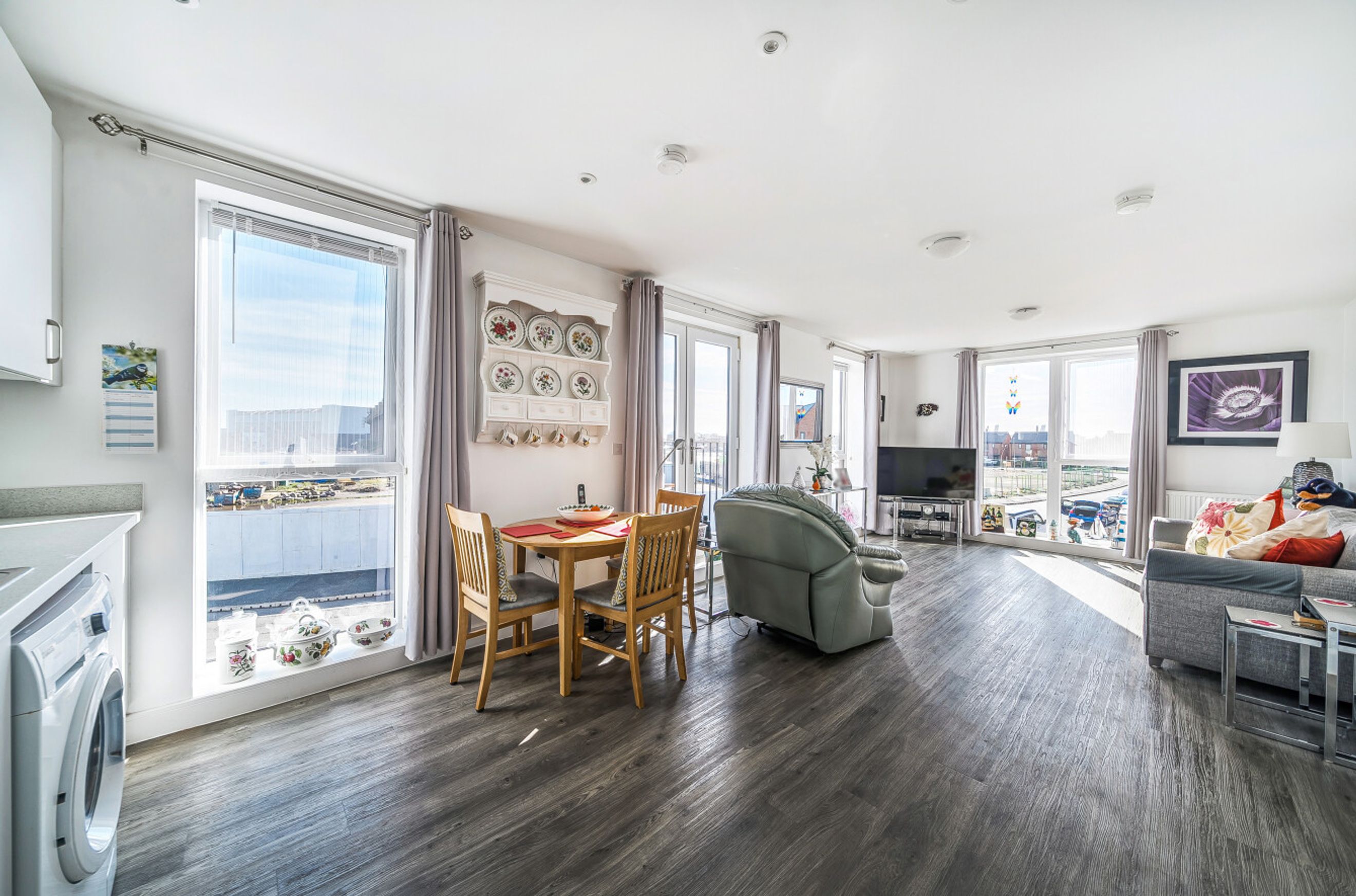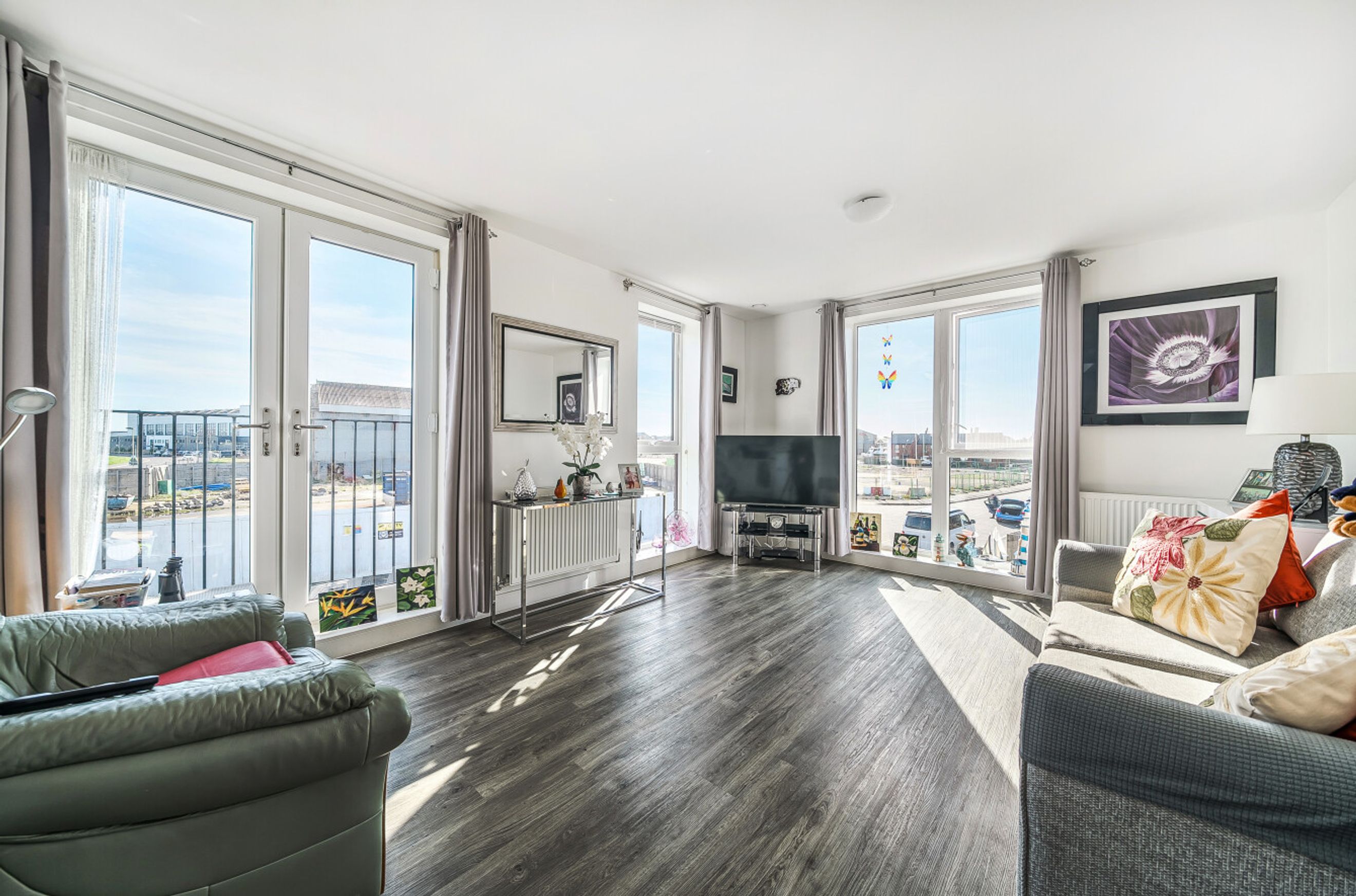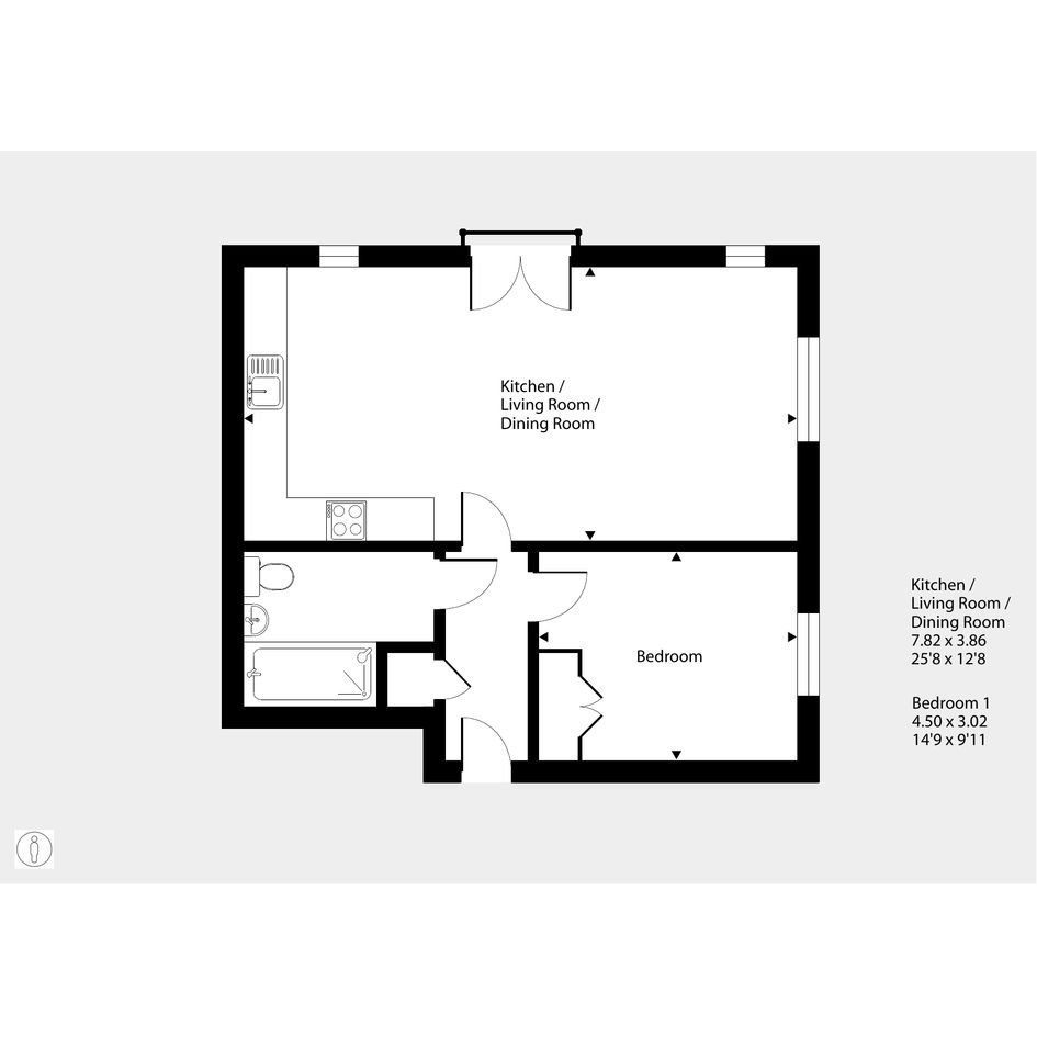 Featuring a spacious open-plan living area with dual-aspect windows and a Juliette balcony. The kitchen is fitted with an oven, hob and hood. There is one comfortable, double bedroom with a built-in wardrobe. The bathroom has a modern, white suite.