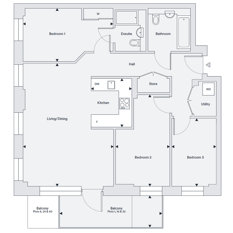 3 bedroom, 2 bathroom, 4th floor apartment offering 87.1 sq.m of internal floor area with outdoor space.Comprising 3 double bedrooms with an en-suite and fitted wardrobe to bedroom 1. Floor to ceiling windows throughout, allowing in plenty of natural light. Ample storage available.