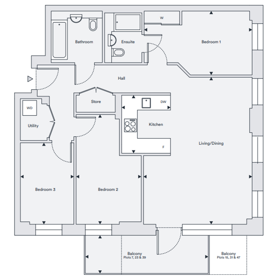 3 bedroom, 2 bathroom, 6th floor apartment offering 87.1 sq.m of internal floor area with outdoor space.Comprising 3 double bedrooms with an en-suite and fitted wardrobe to bedroom 1. Floor to ceiling windows throughout, allowing in plenty of natural light. Ample storage available.