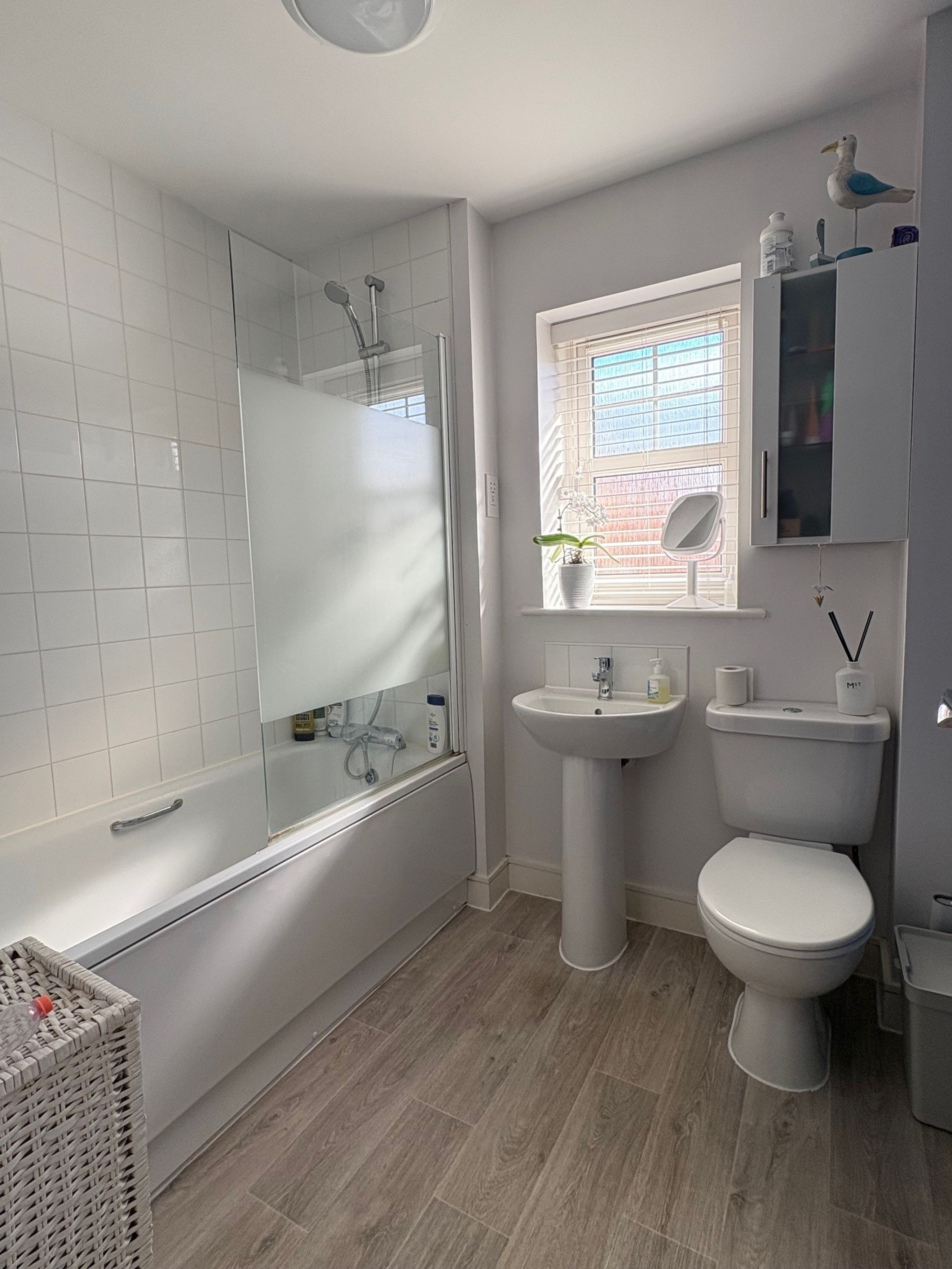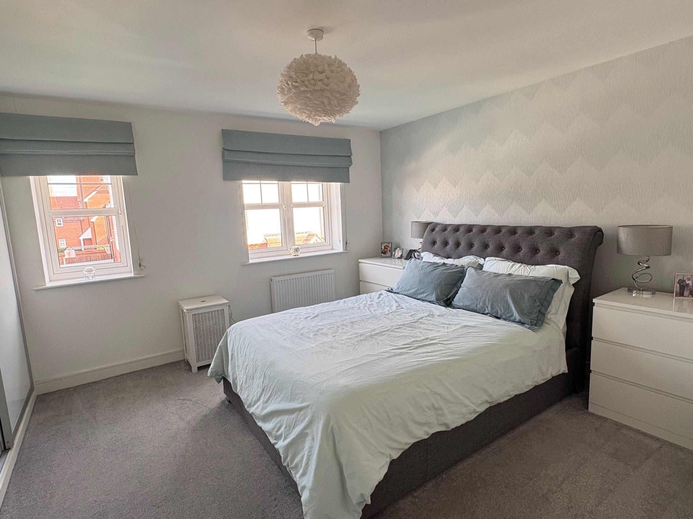 Upstairs, there are two double bedrooms. The master bedroom benefits from full-width built-in wardrobes, and the landing provides two additional storage cupboards. A family bathroom serves the first floor.