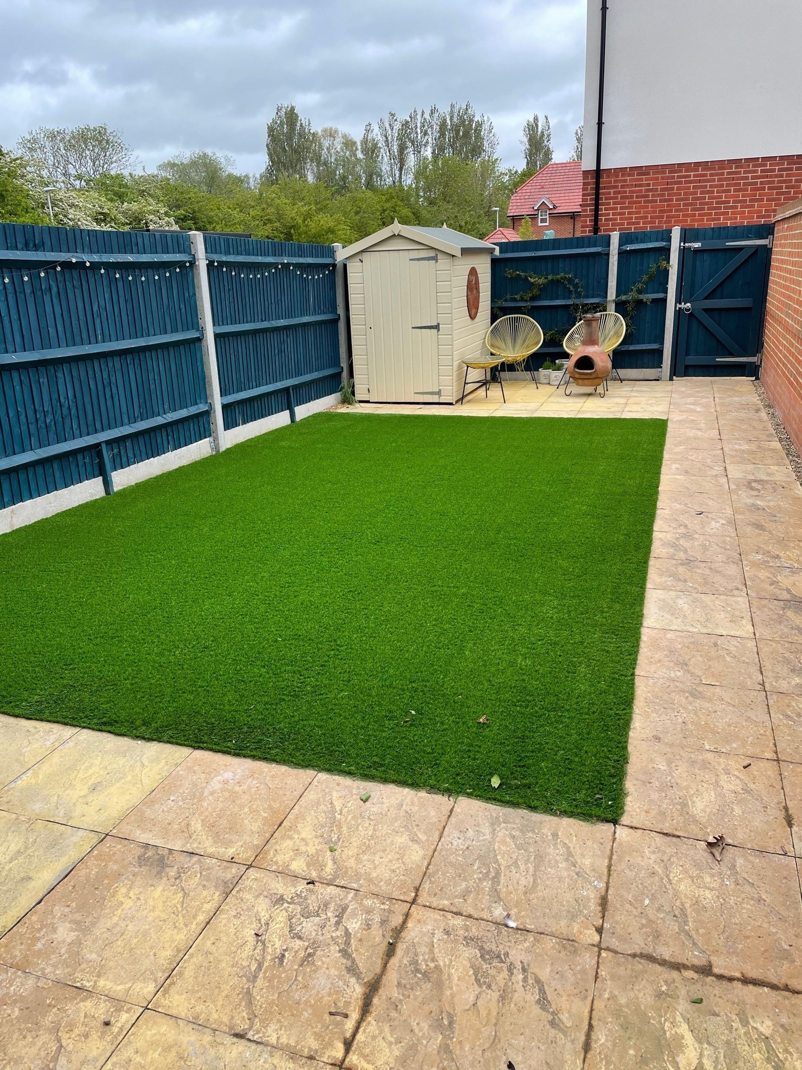 The garden is designed for low maintenance, featuring artificial lawn, patio area, a shed, gated rear access, and an outside tap.