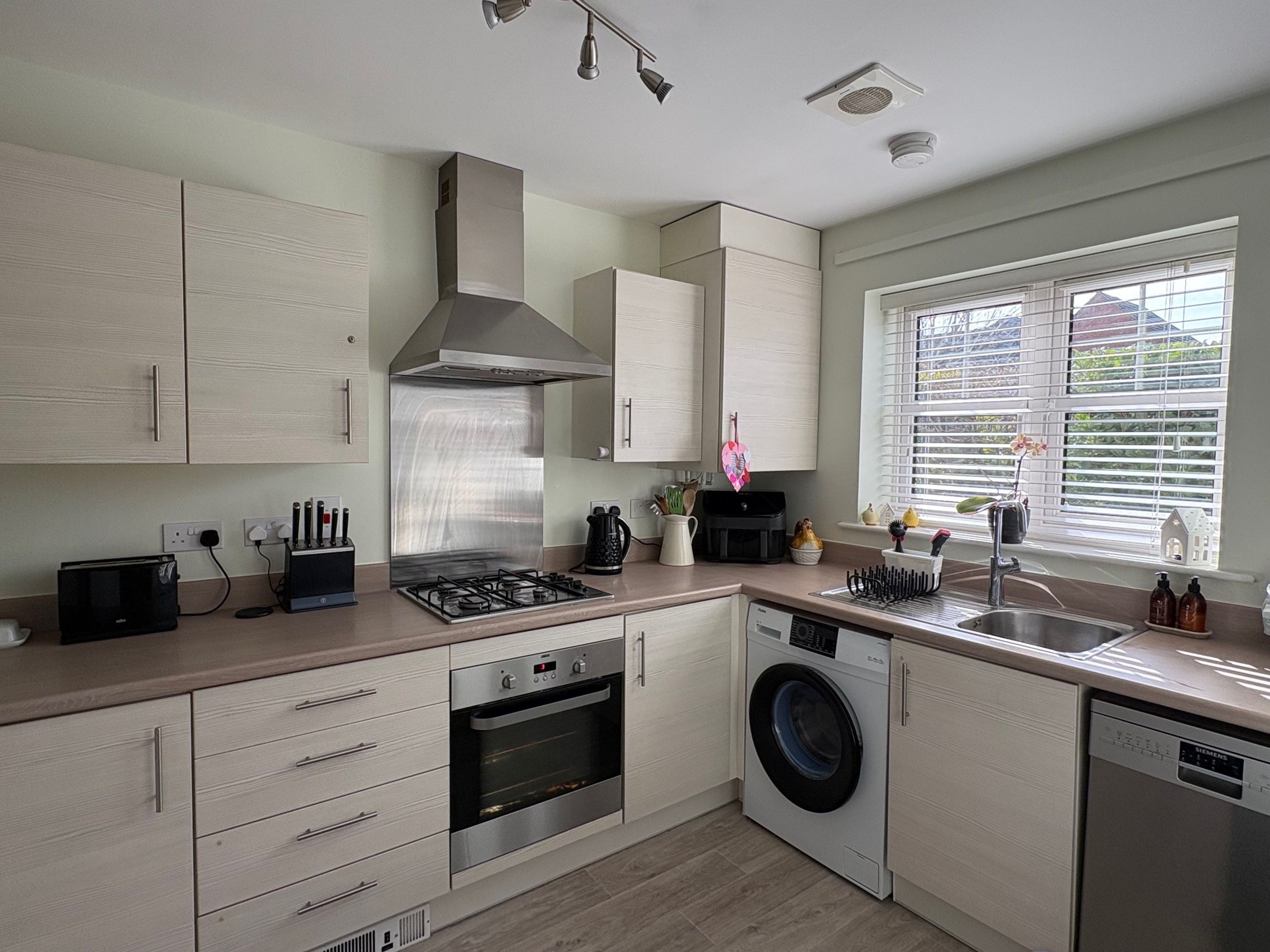The ground floor includes an entrance hallway with a downstairs WC and two storage cupboards—one positioned behind the front door and another under the stairs. The separate kitchen is fitted with a range of eye-level and base units and includes an integrated oven, hob, and extractor fan. To the rear, the lounge/diner provides a good-sized living space with patio doors opening directly onto the private garden.