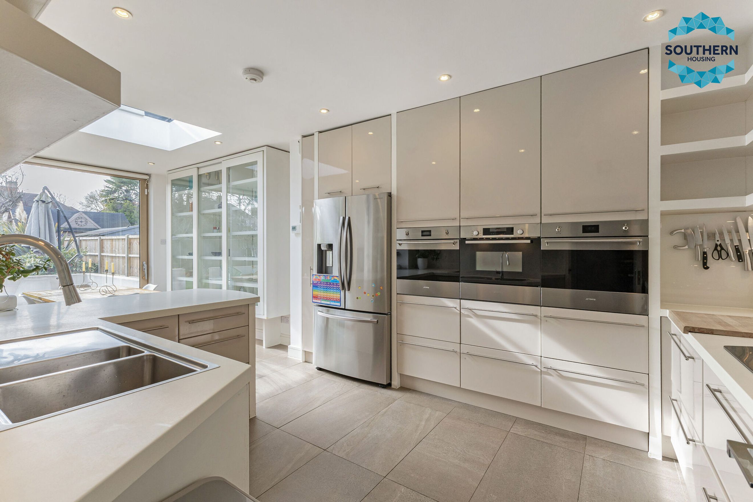 Continuing through the ground floor, the property opens up into a stunning open-plan kitchen and family area. This contemporary space forms the heart of the home, finished with high-quality fixtures and fittings that create a sleek and premium feel. Designed with both style and practicality in mind, the kitchen/dining area benefits from direct access to the garden via outward-opening folding doors, seamlessly connecting indoor and outdoor living.