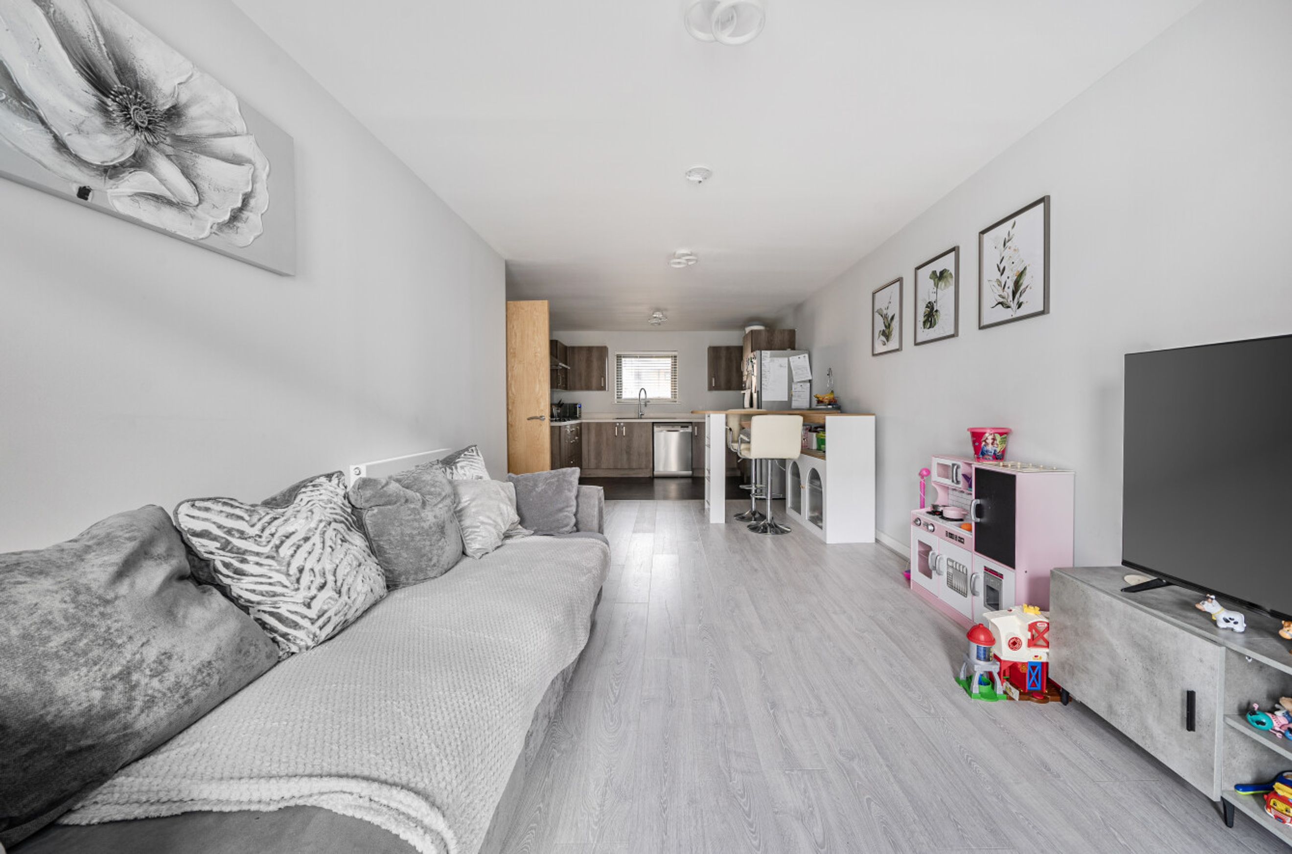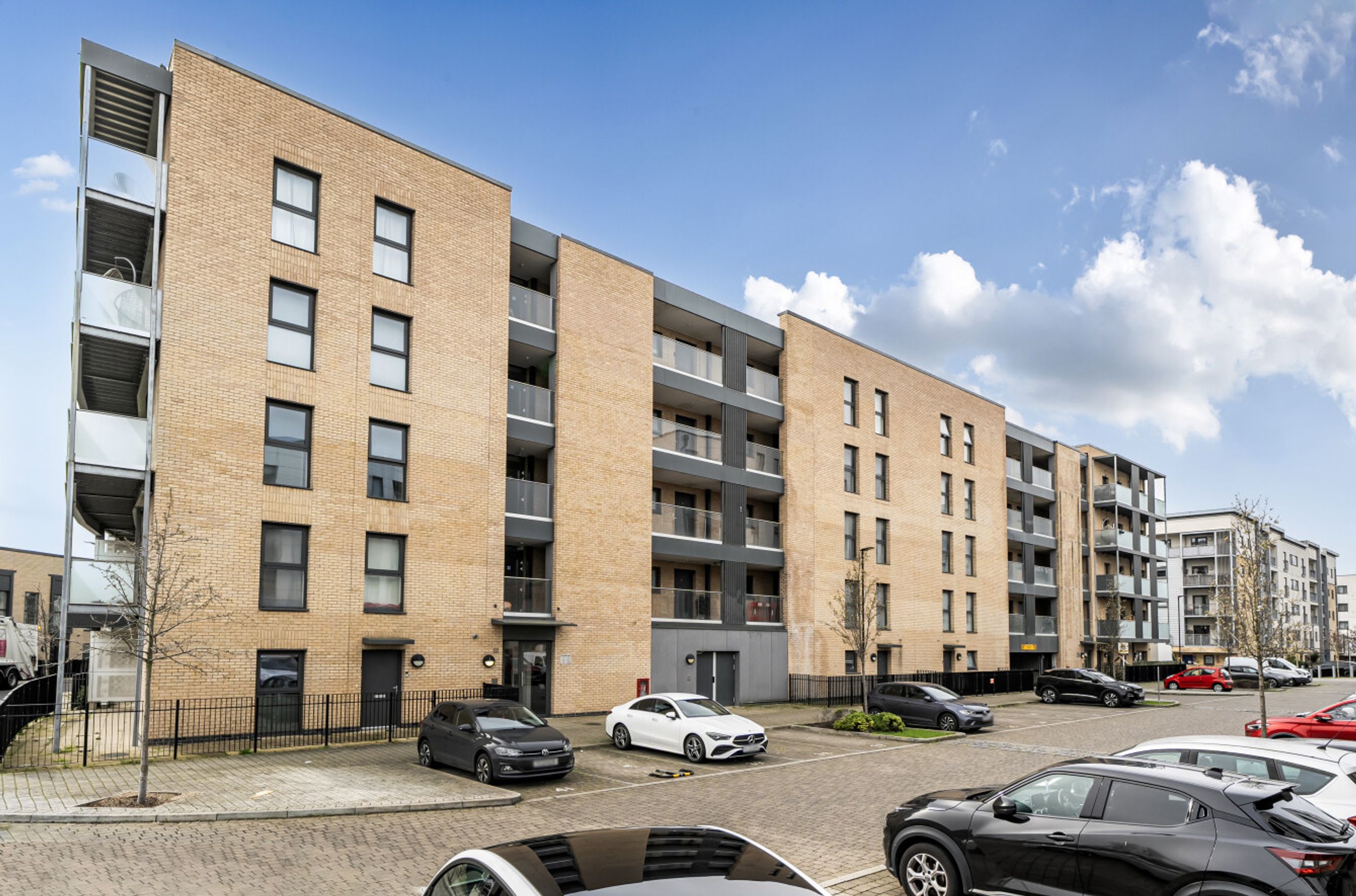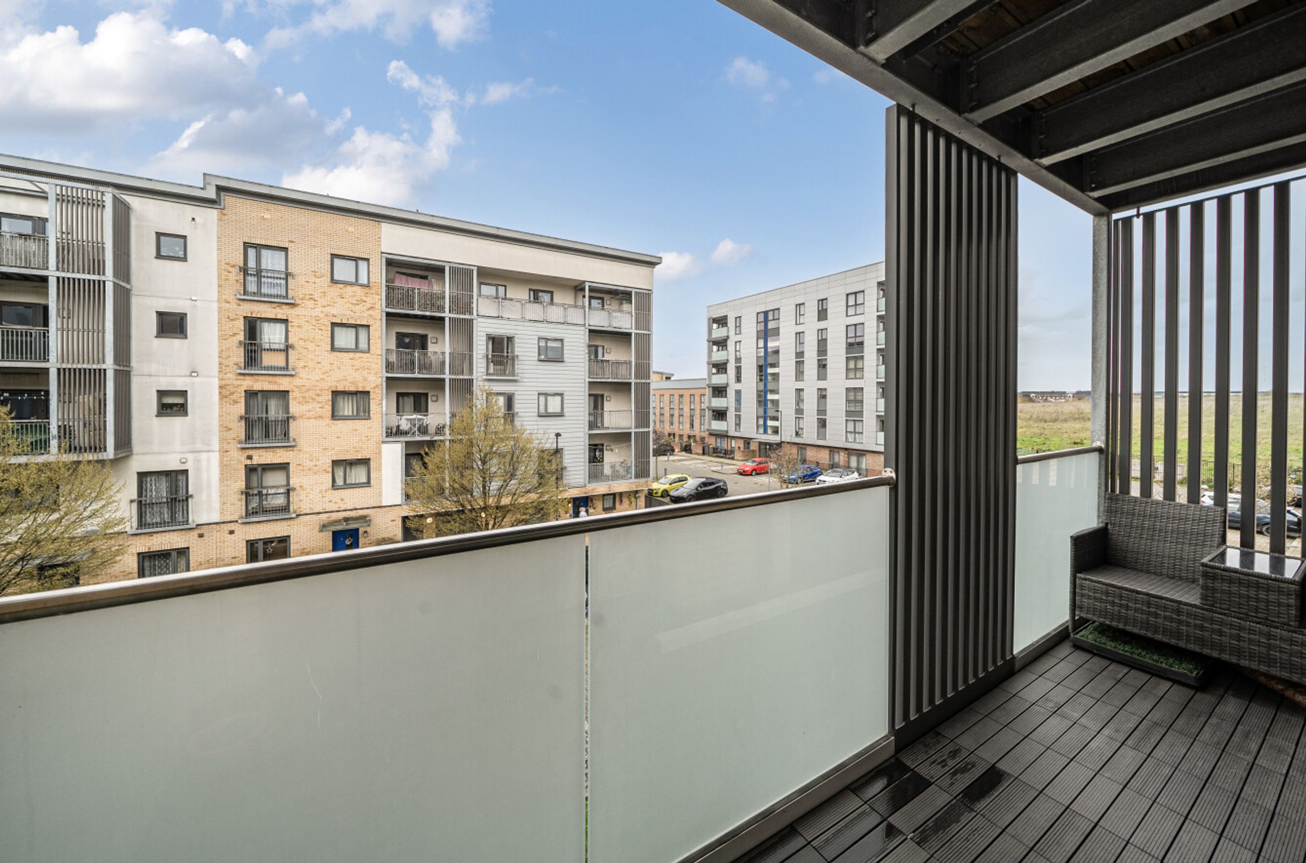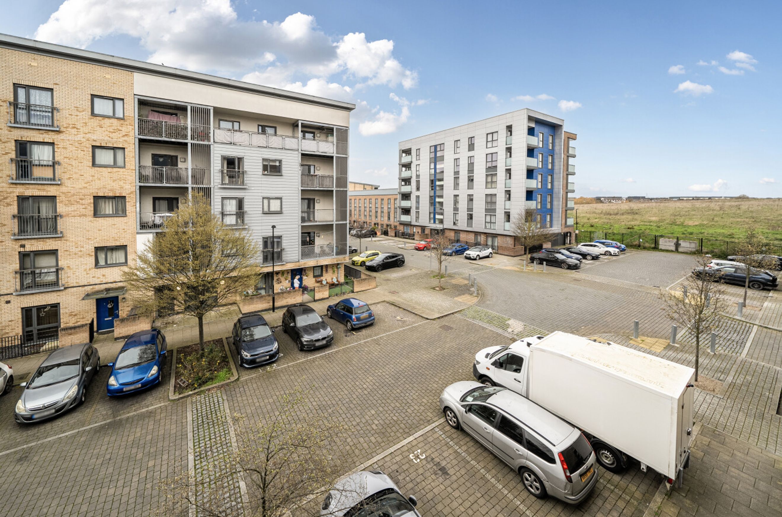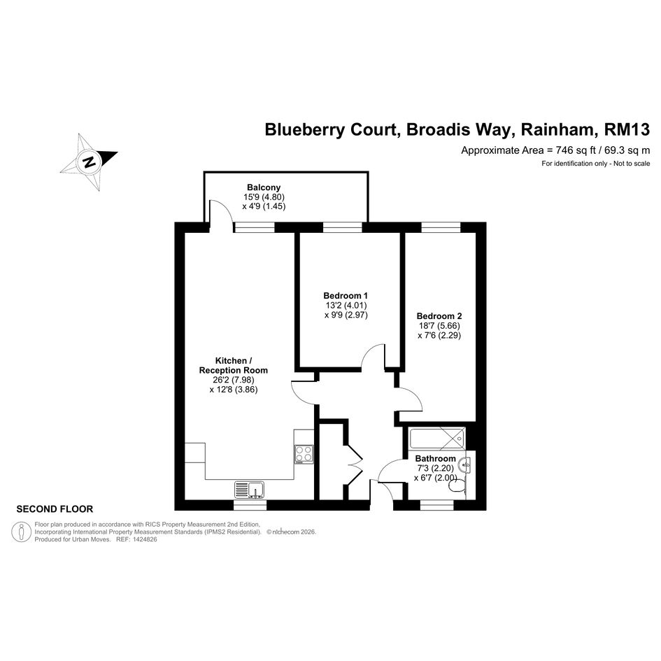 This well-presented apartment is on the second floor of a recently-constructed development and has a twenty-six-foot reception room with a balcony at one end and an open-plan kitchen, featuring attractive, walnut-style units, at the other. The two bedrooms are good-sized doubles and there is a simple yet stylish and naturally-lit bathroom. A large storage/utility cupboard has been provided in the entrance hallway and modern insulation standards combined with high performance glazing and a communal heating/hot water system have resulted in a very good energy-efficiency rating. The apartment comes with a parking space and the A13 offers a direct route into central London or out to the M25. Rainham town centre or railway station can also be easily reached by bus or bike. Blueberry Court has a communal courtyard plus nearby Beam Parklands Country Park offers many acres of outside space to explore. Newtons Primary School, which is very close by, is Ofsted-rated 'Good' and there are several other well-thought-of schools in the local area.