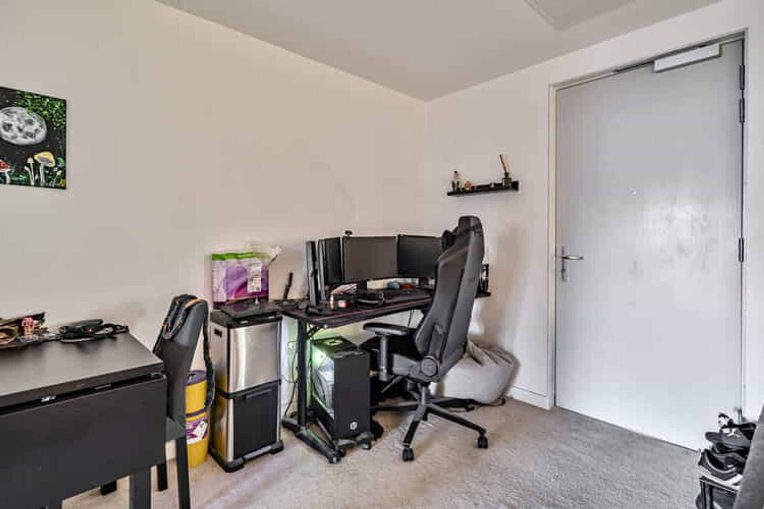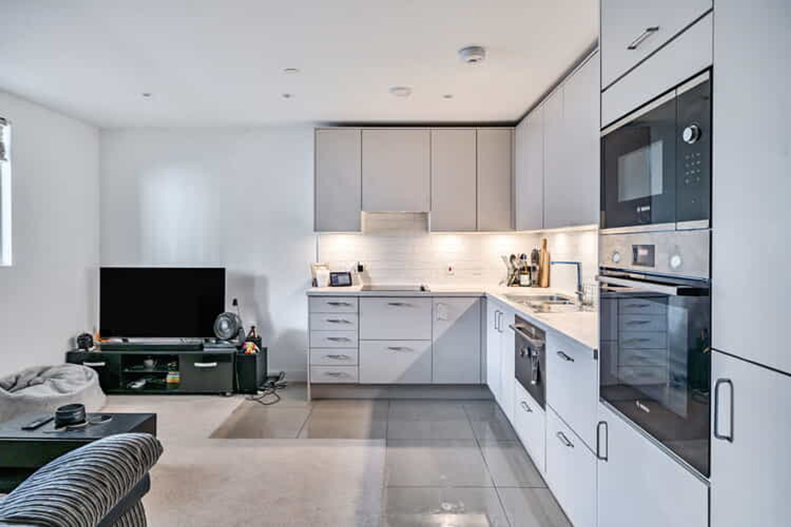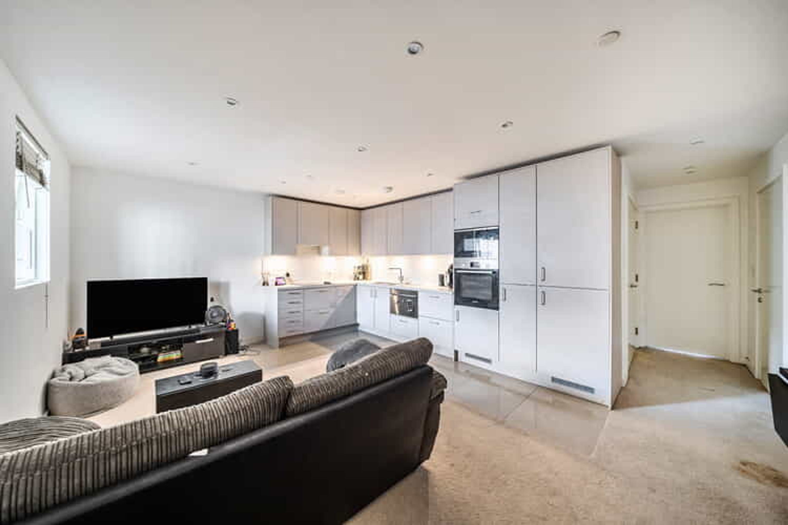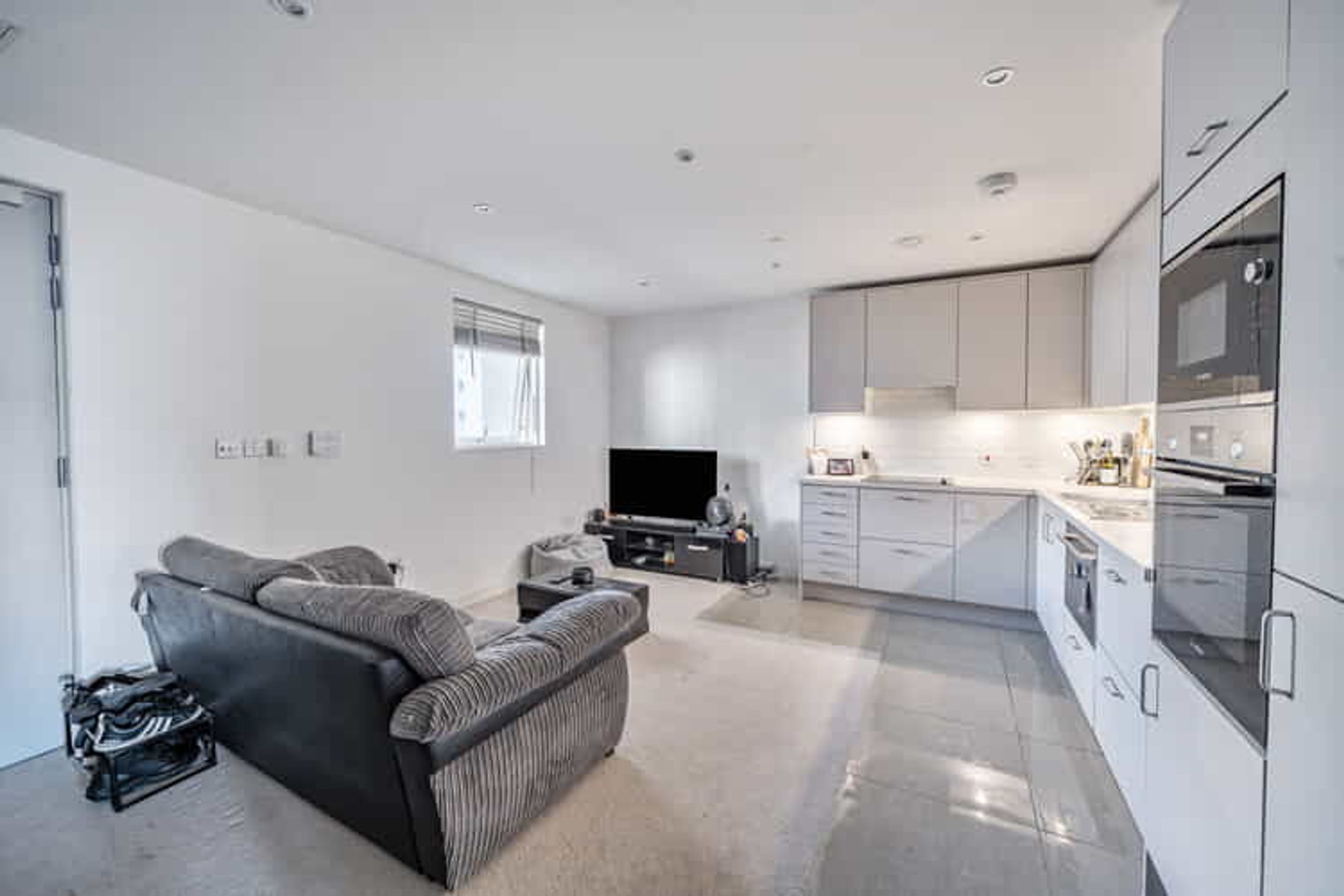 The property on the second floor comprises an entrance hall, a living room with a modern open plan kitchen, one large bedroom and a bathroom.